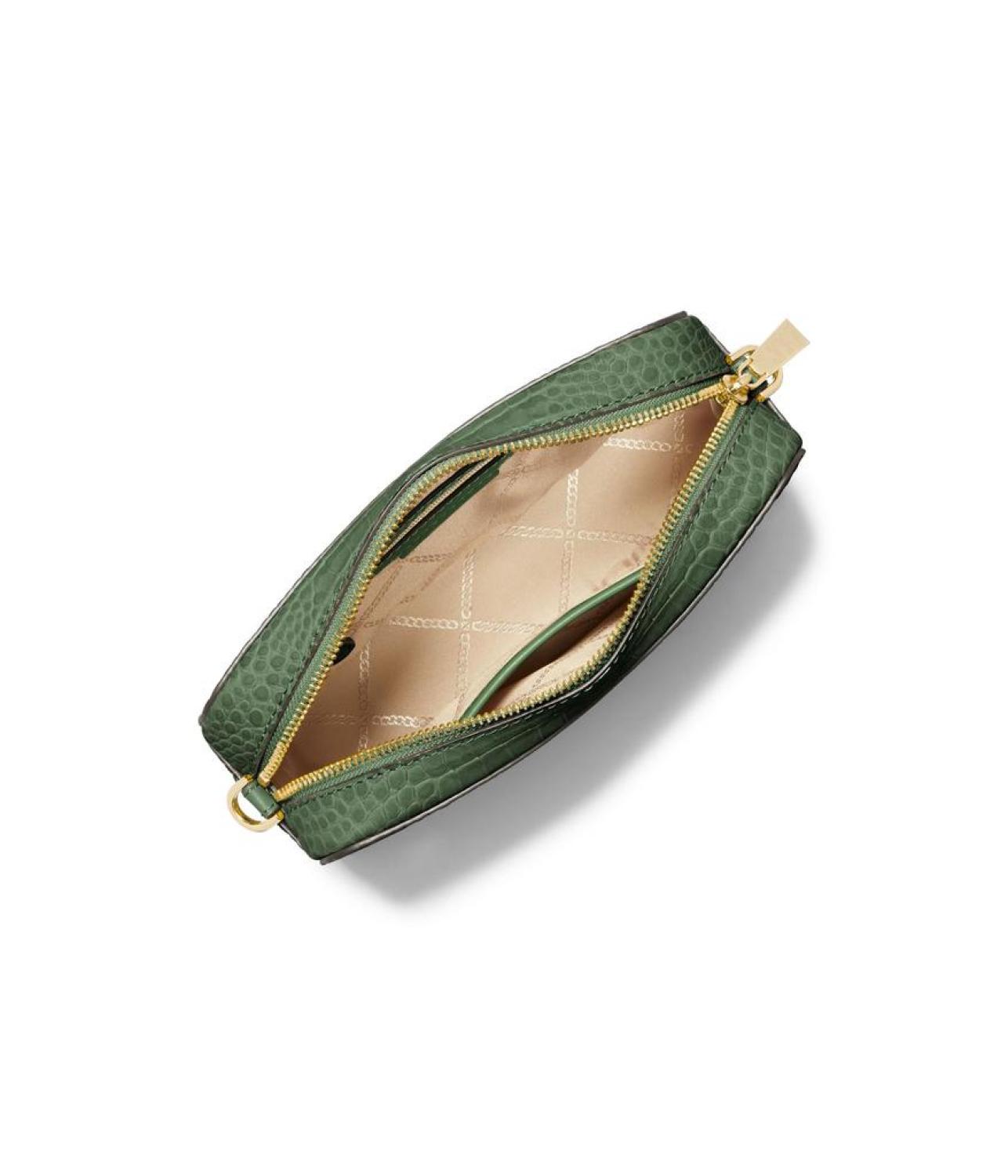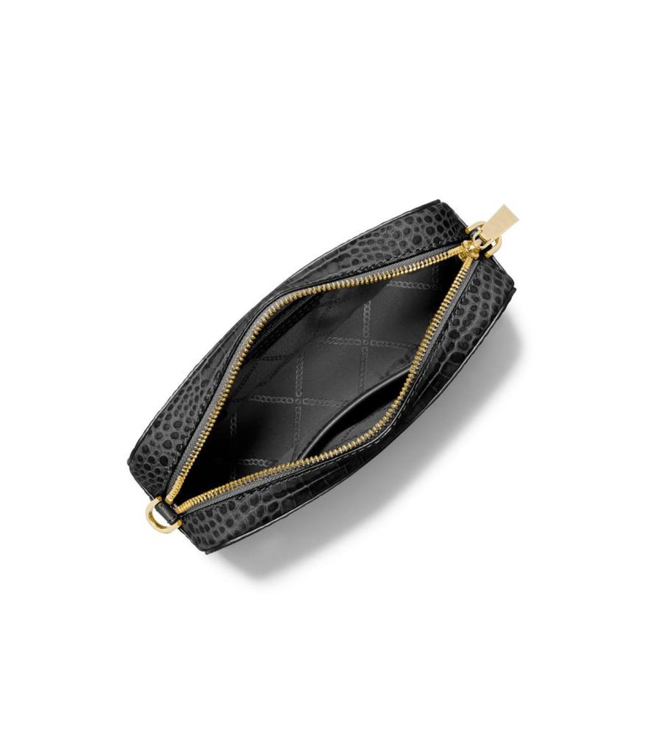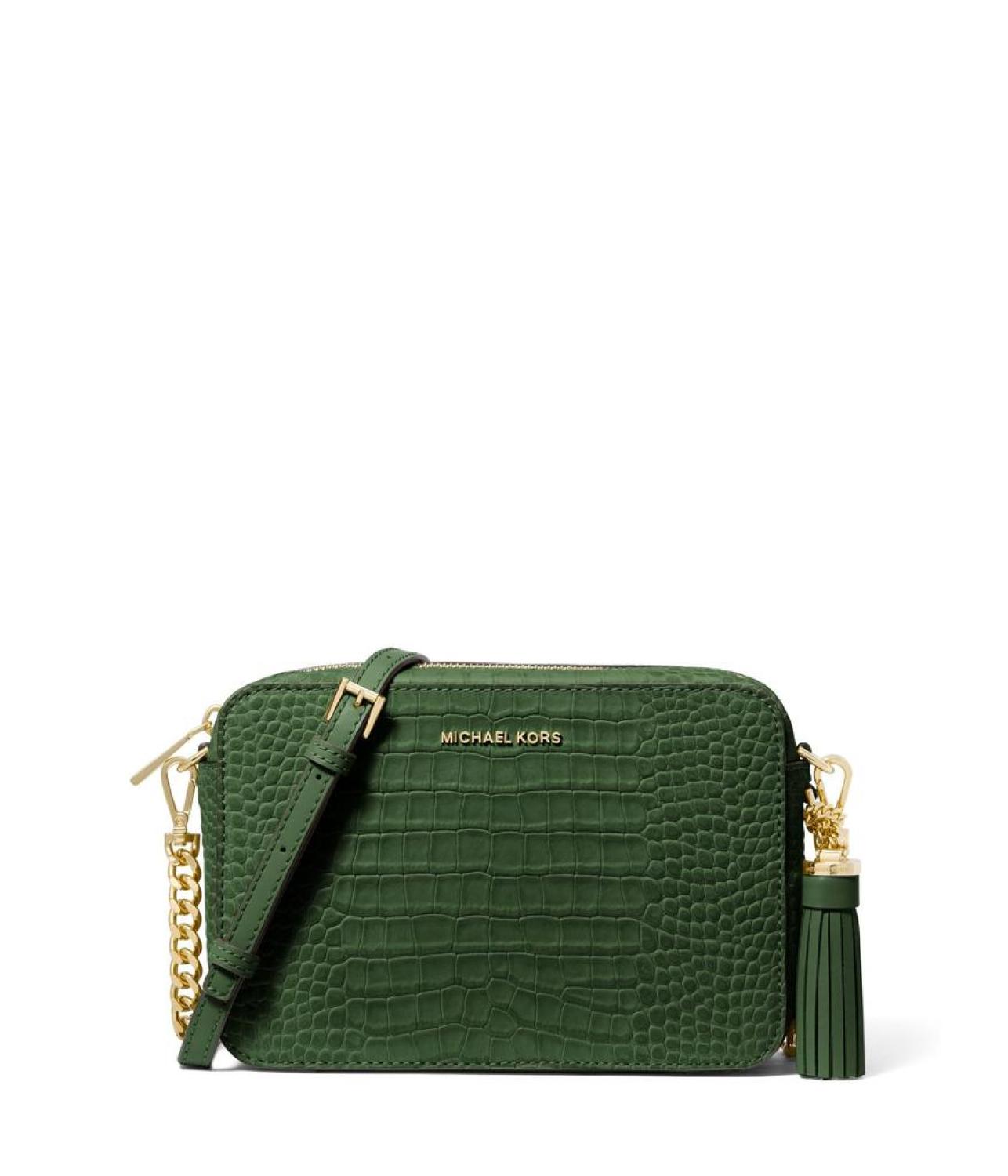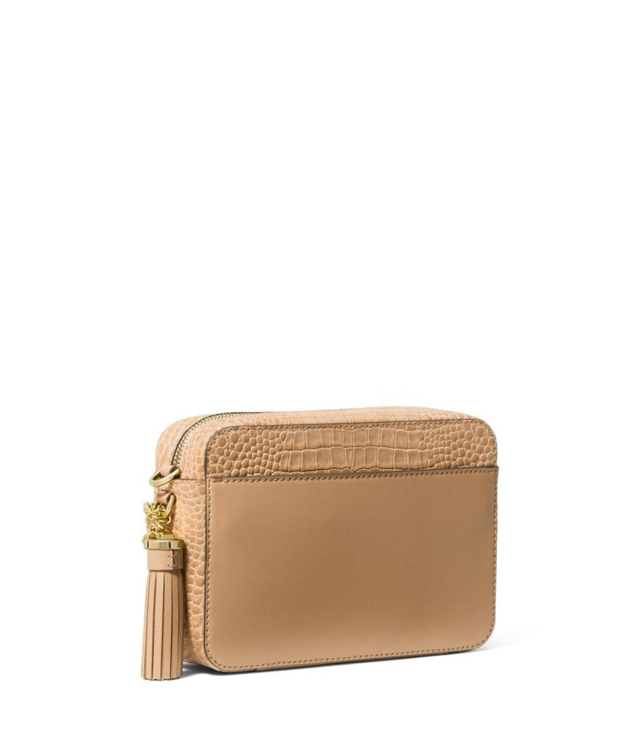 • Sleek and stylish, the MICHAEL Michael Kors® Jet Set Medium Camera Bag with Pocket is sure to make a statement. The handbag has crocodile embossed leather construction and features a crossbody strap with a zippered top closure. It also has chain-link accents and an oversized tassel.