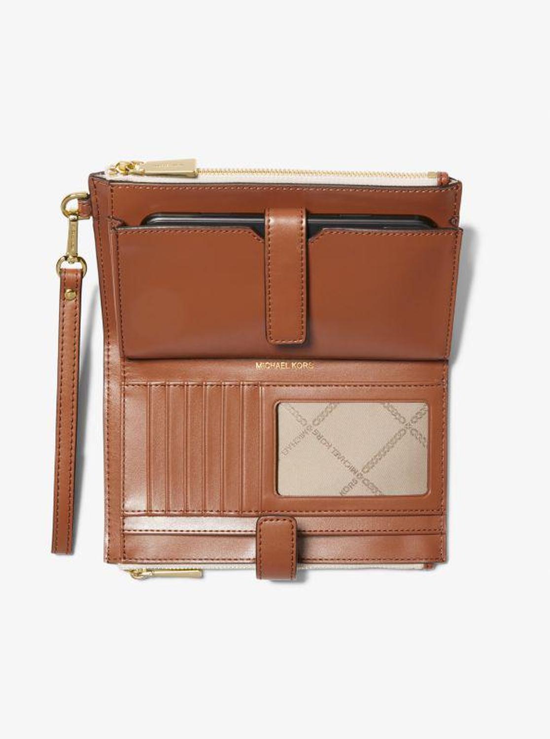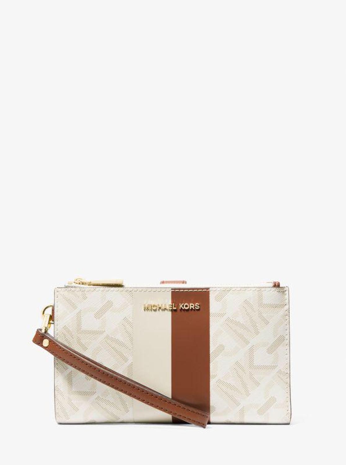 • Crafted from Empire monogram-print canvas with graphic stripes, this wristlet has two zip-top sides that unfold to reveal a center with pockets for all the essentials—from credit cards to your smartphone. A detachable wristlet strap makes it versatile enough to carry alone or in a tote.