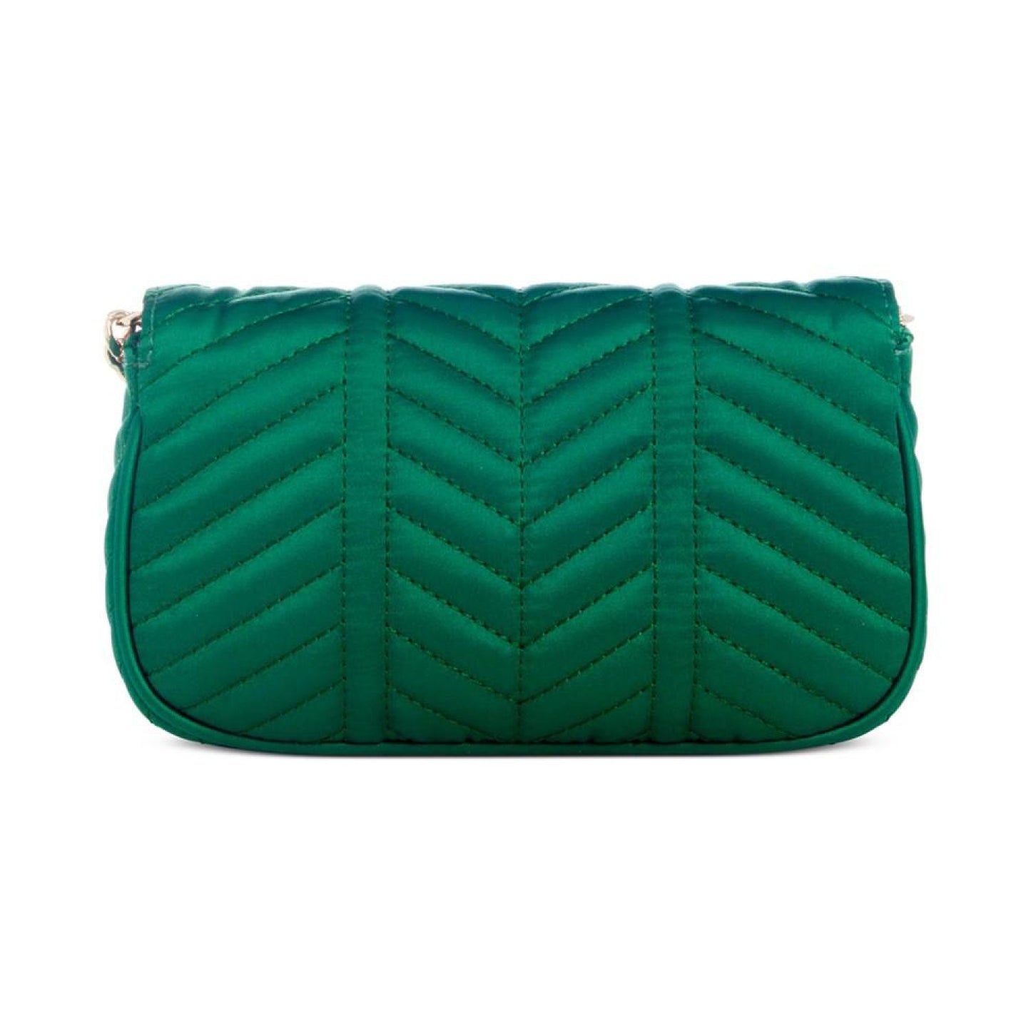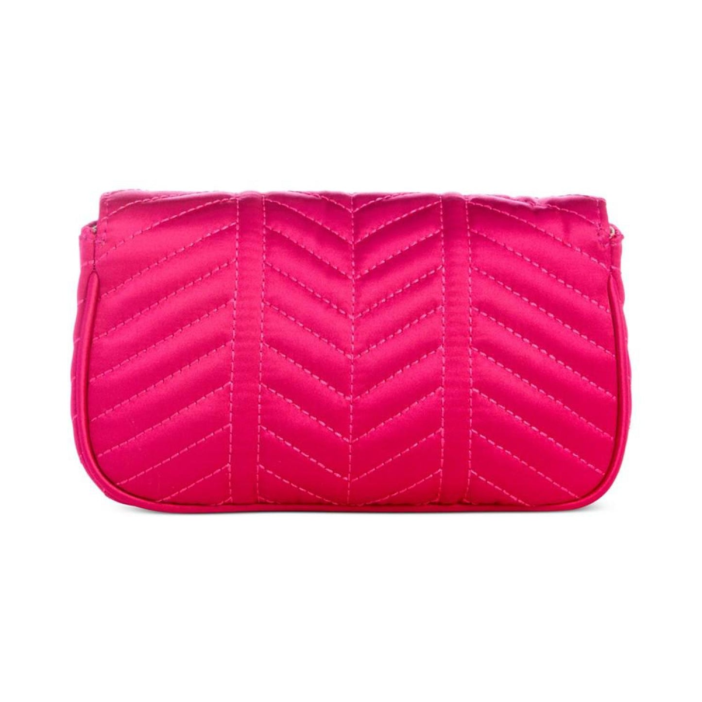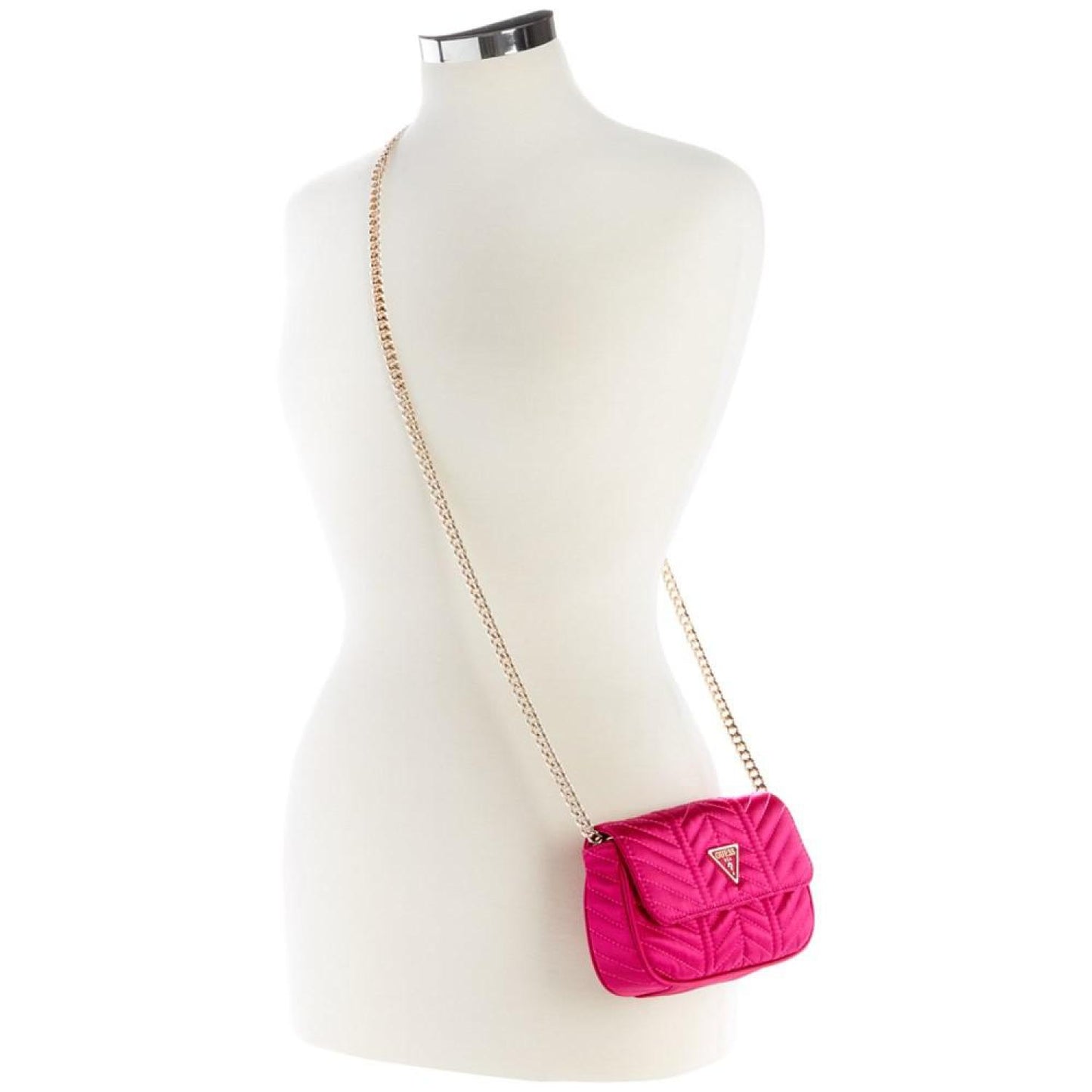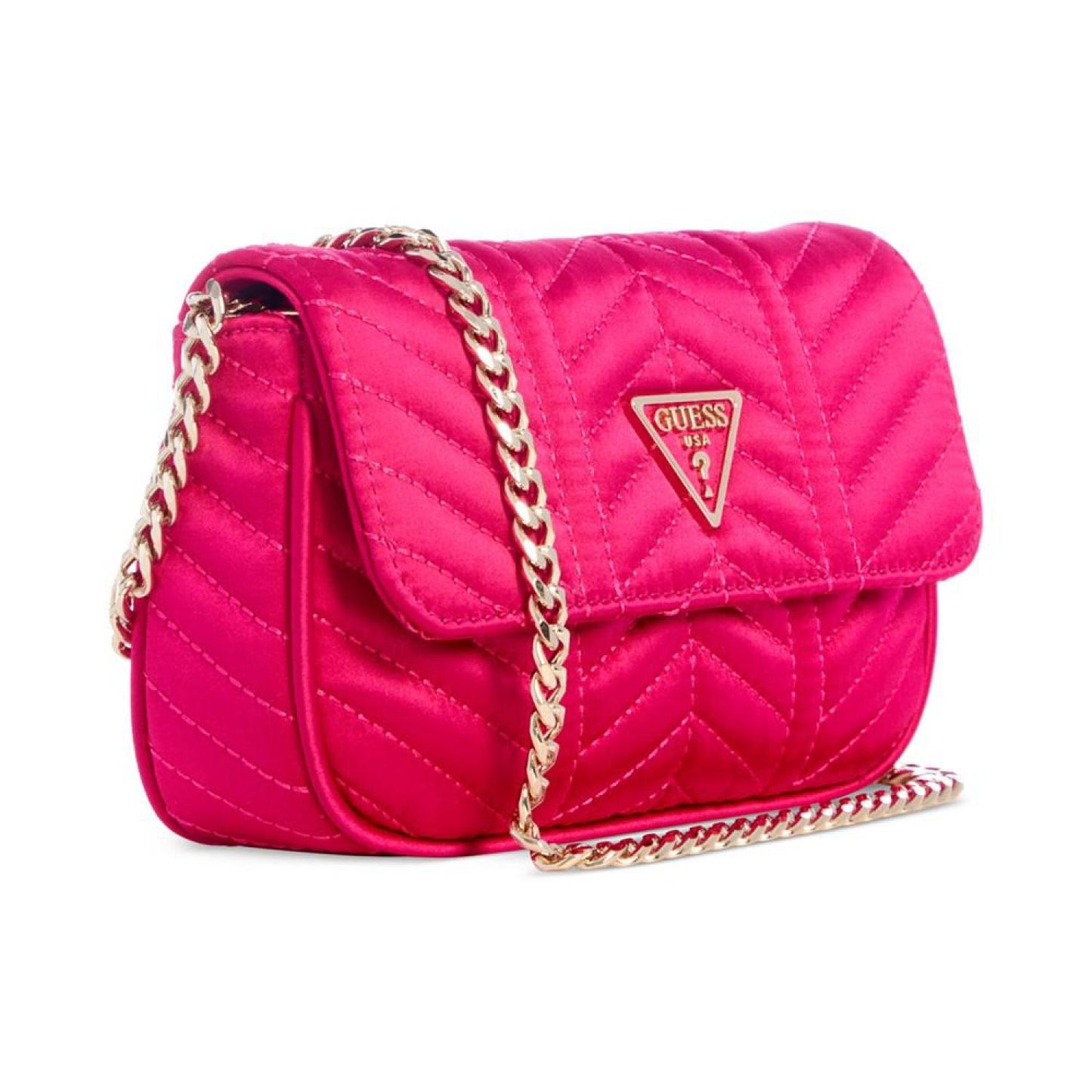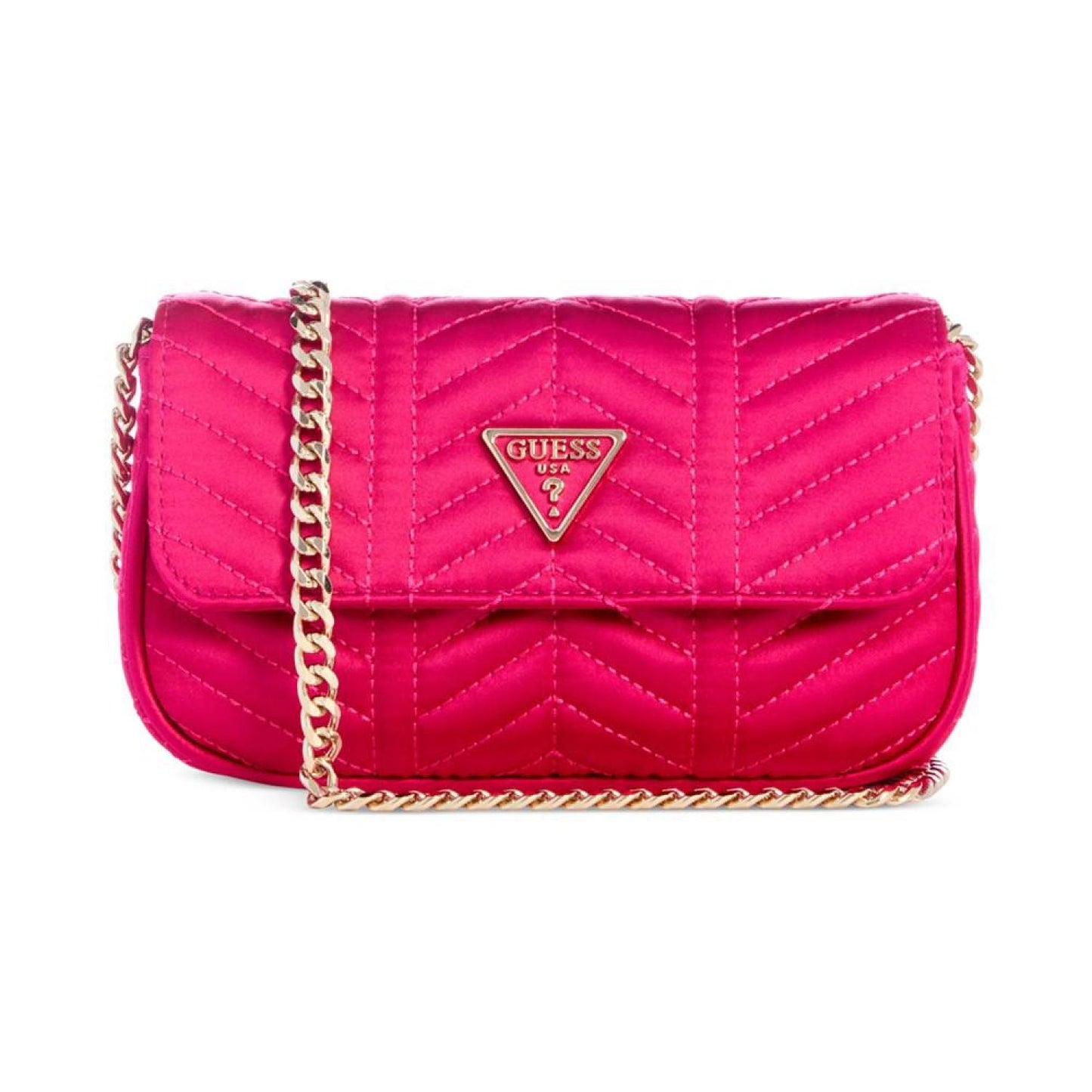 Elevate your evening attire with this elegantly quilted satin clutch by GUESS, completed with a logo plaque at the front and a shiny chain strap for a luxe finish. Mini sized bag; 6-3/4"W x 4-1/4"H x 2-1/4"D 22-3/4"L removable chain strap Magnetic snap closure Gold-tone hardware Interior slip pocket Polyester Spot clean Imported