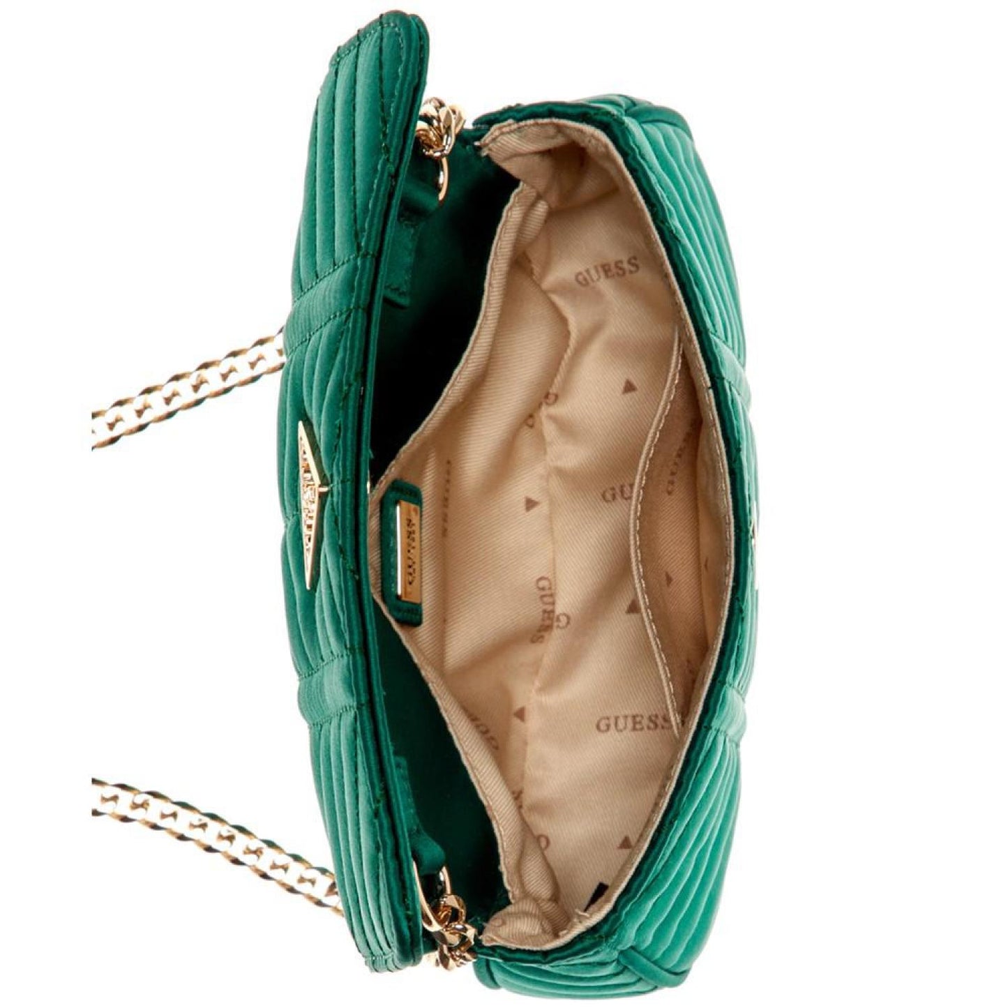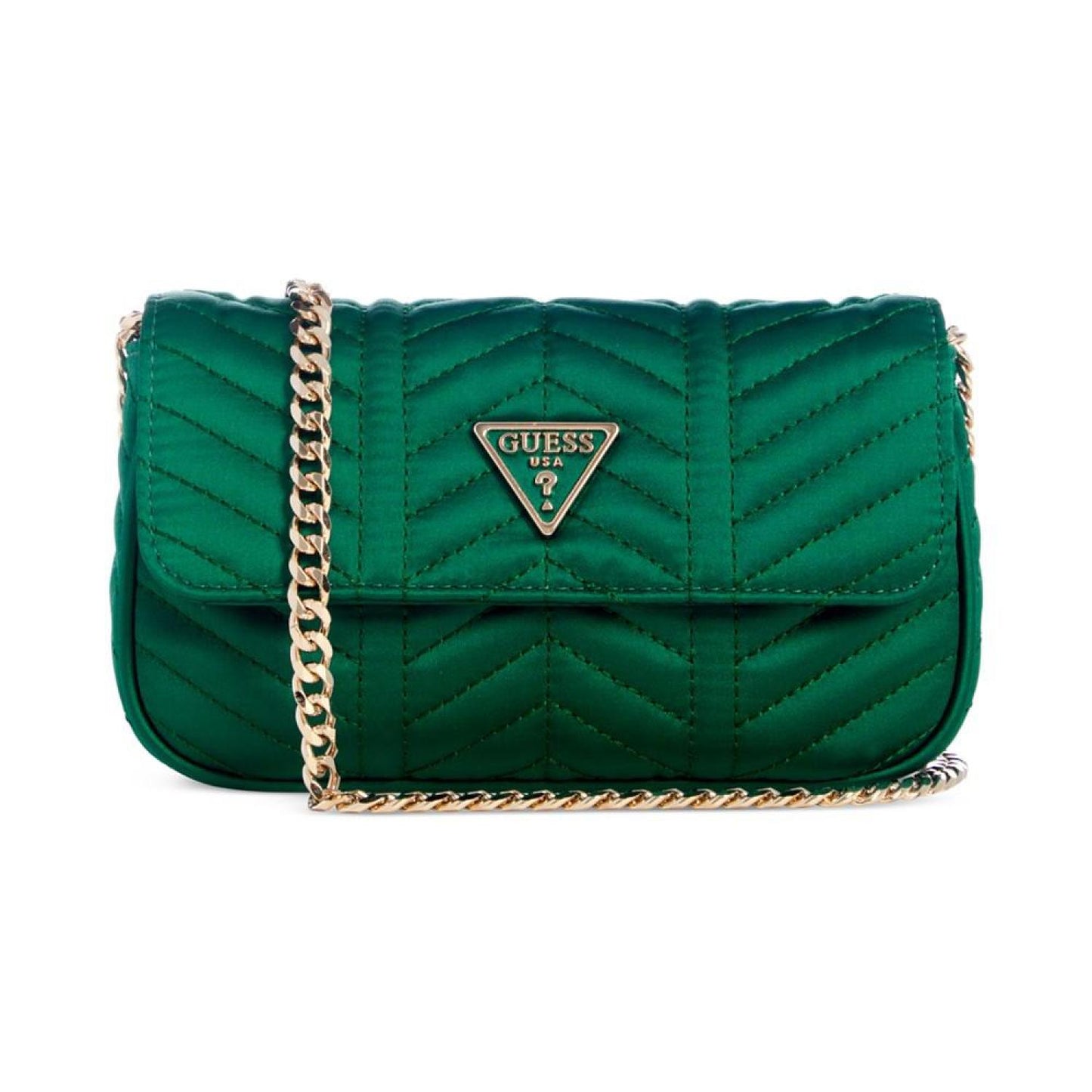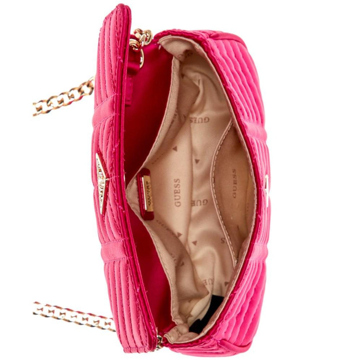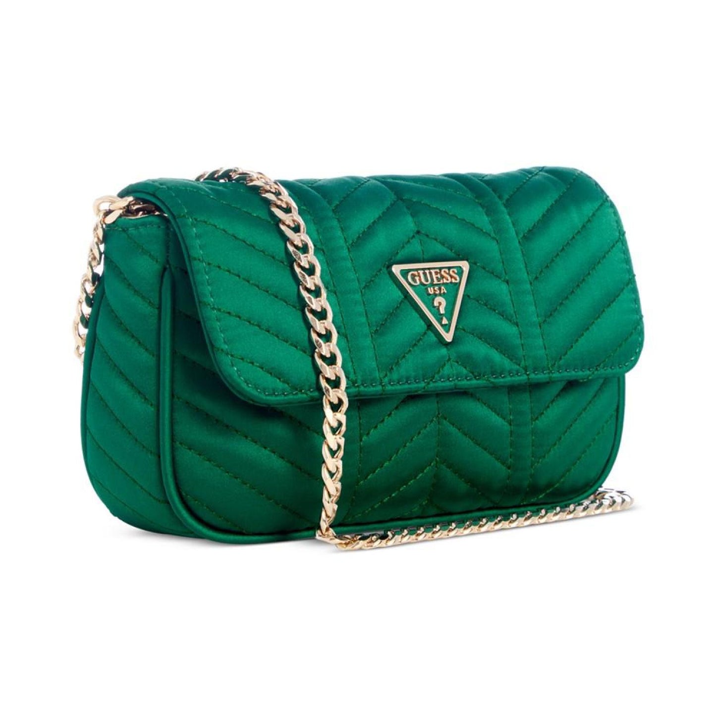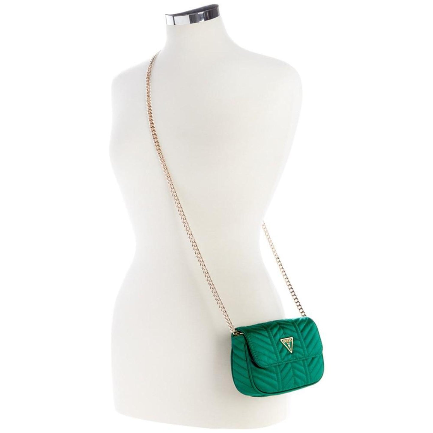 Elevate your evening attire with this elegantly quilted satin clutch by GUESS, completed with a logo plaque at the front and a shiny chain strap for a luxe finish. Mini sized bag; 6-3/4"W x 4-1/4"H x 2-1/4"D 22-3/4"L removable chain strap Magnetic snap closure Gold-tone hardware Interior slip pocket Polyester Spot clean Imported