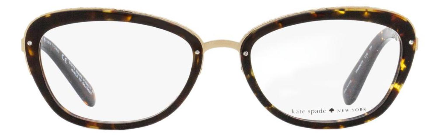 The Kate Spade Maribeth optical frames feature an arching oval shape suitable for women. The Acetate frame is accented with a hammered metal finish on the top and bow-tie detailing on the temples. Springe hinges allow for an ideal fit. Kate Spade made her mark as a designer with her iconic handbags that were detailed with sophisticated colors and accents. Please note these eyeglasses are provided with Demo Lenses in order to demonstrate the final appearance of your frames. Please visit your local Optometrist or Optician to replace with optical quality lenses. Frame Material - Plastic (Acetate)/Metal (Stainless Steel) Frame Color - Tortoise/Gold Lens Color - N/A Size - 52-17-135 Made in China Includes original case and cloth
