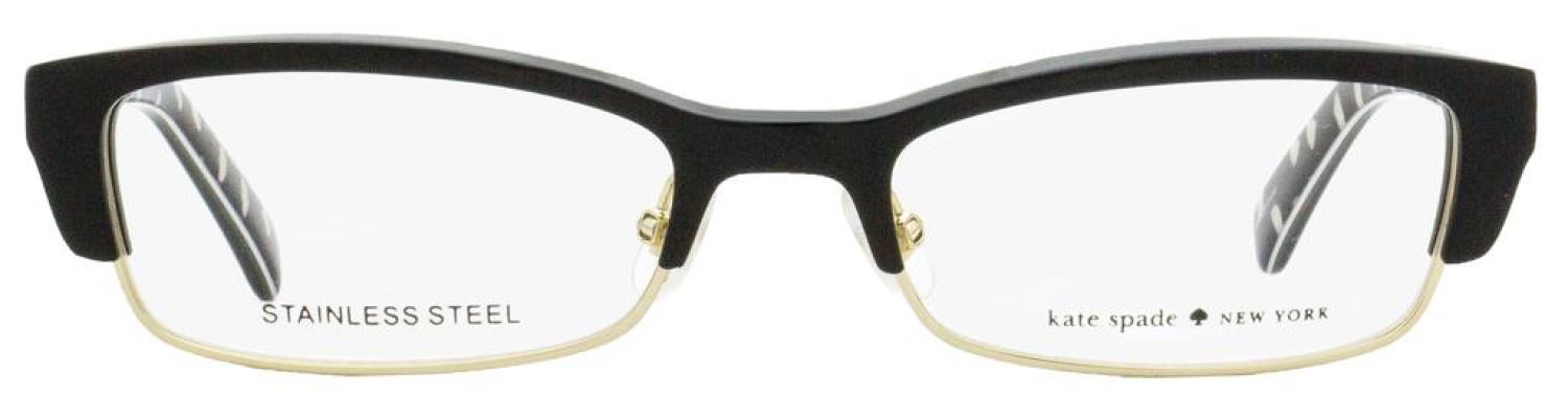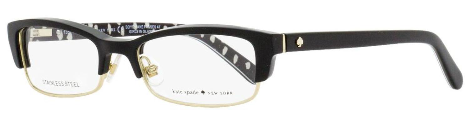 The Kate Spade Joetta optical frames feature a narrow rectangular lens shape suitable for women. The Acetate and metal frame features spring hinges and iconic Spade logo on the left side only. Kate Spade made her mark as a designer with her iconic handbags that were detailed with sophisticated colors and accents. Please note these eyeglasses are provided with Demo Lenses in order to demonstrate the final appearance of your frames. Please visit your local Optometrist or Optician to replace with optical quality lenses. Frame Material - Plastic (Acetate)/Metal (Stainless Steel) Frame Color - Black/Gold Lens Color - N/A Size - 52-18-135 Made in China Includes original case and cloth