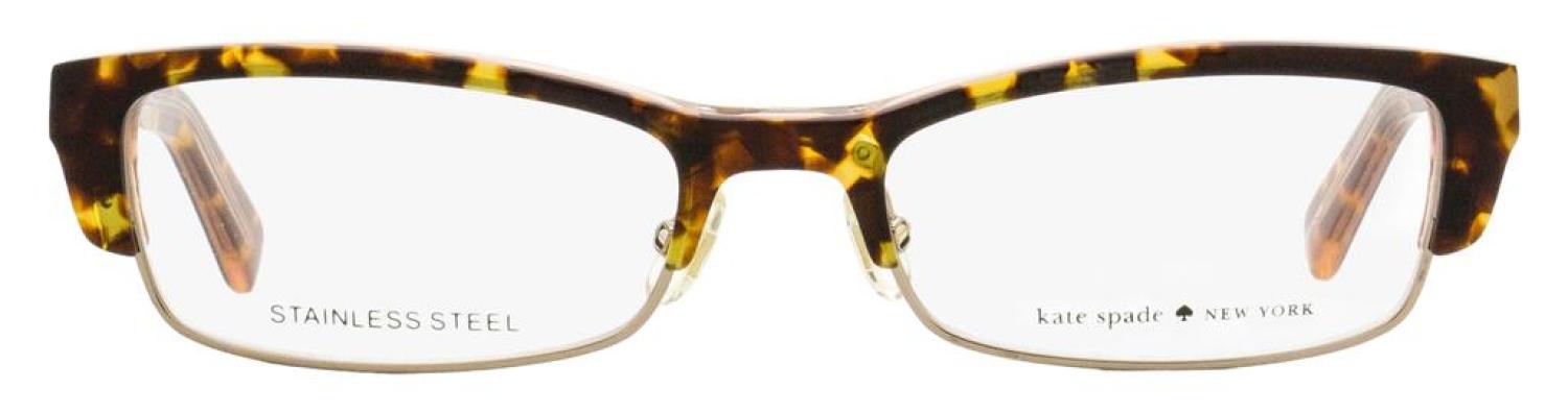 The Kate Spade Joetta optical frames feature a narrow rectangular lens shape suitable for women. The Acetate and metal frame features spring hinges and iconic Spade logo on the left side only. Kate Spade made her mark as a designer with her iconic handbags that were detailed with sophisticated colors and accents. Please note these eyeglasses are provided with Demo Lenses in order to demonstrate the final appearance of your frames. Please visit your local Optometrist or Optician to replace with optical quality lenses. Frame Material - Plastic (Acetate)/Metal (Stainless Steel) Frame Color - Tortoise/Gold Lens Color - N/A Size - 52-18-135 Made in China Includes original case and cloth