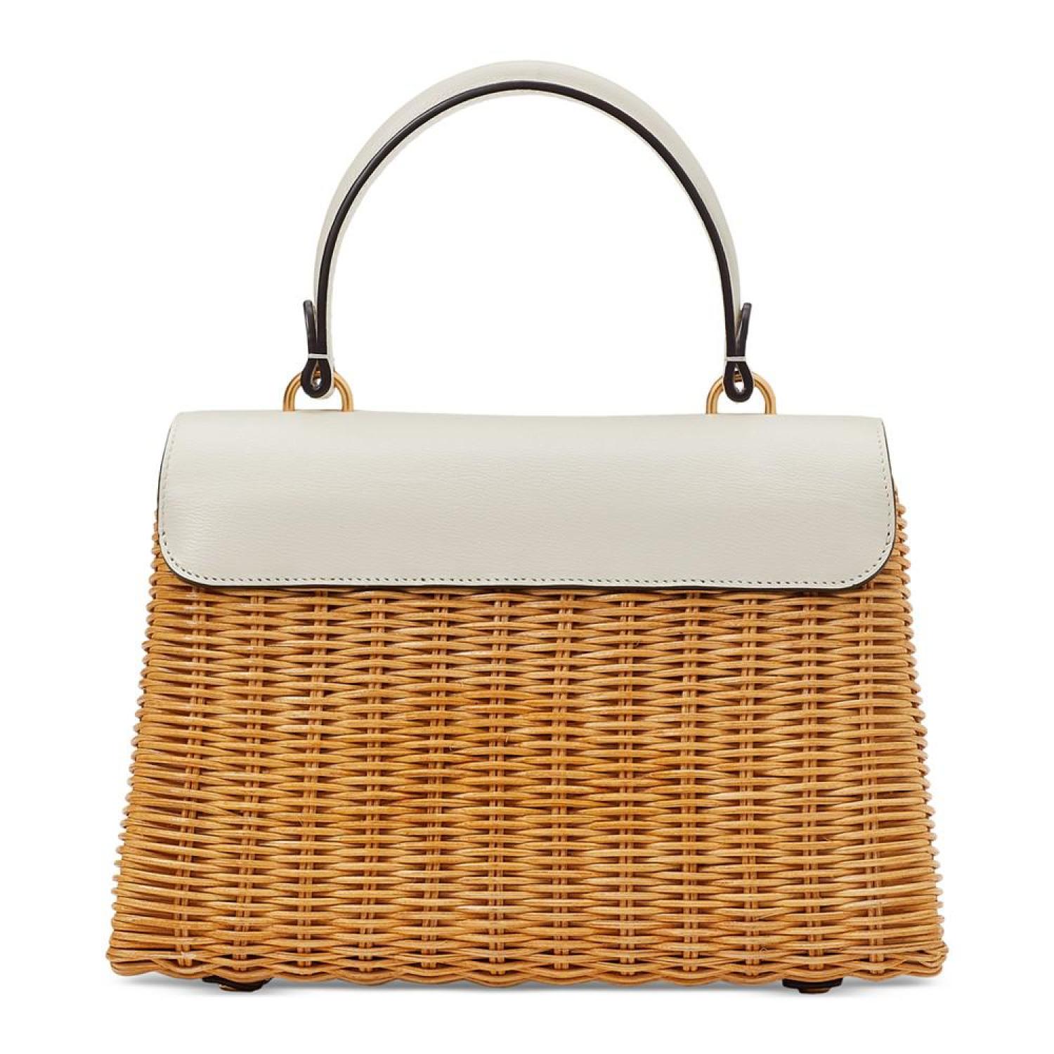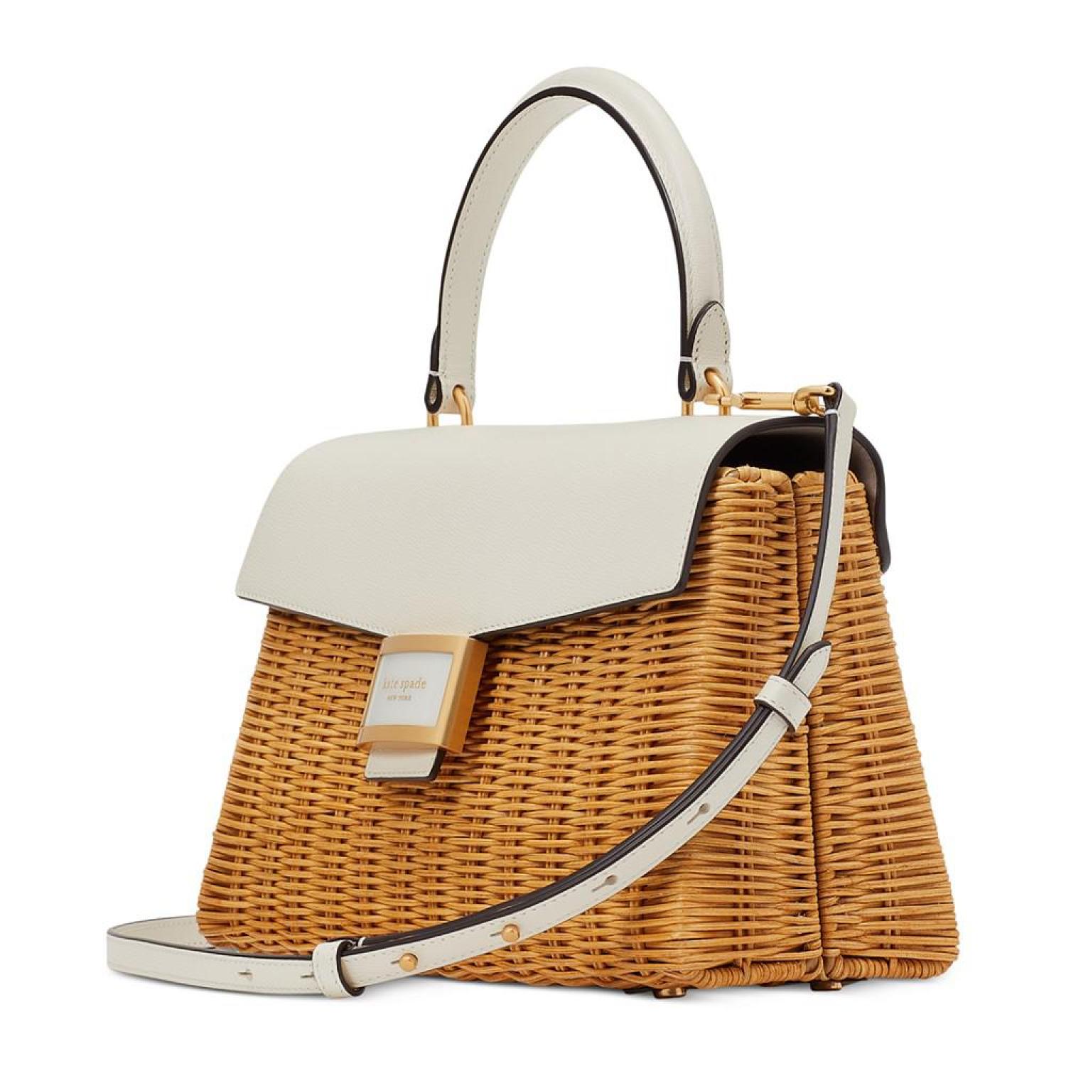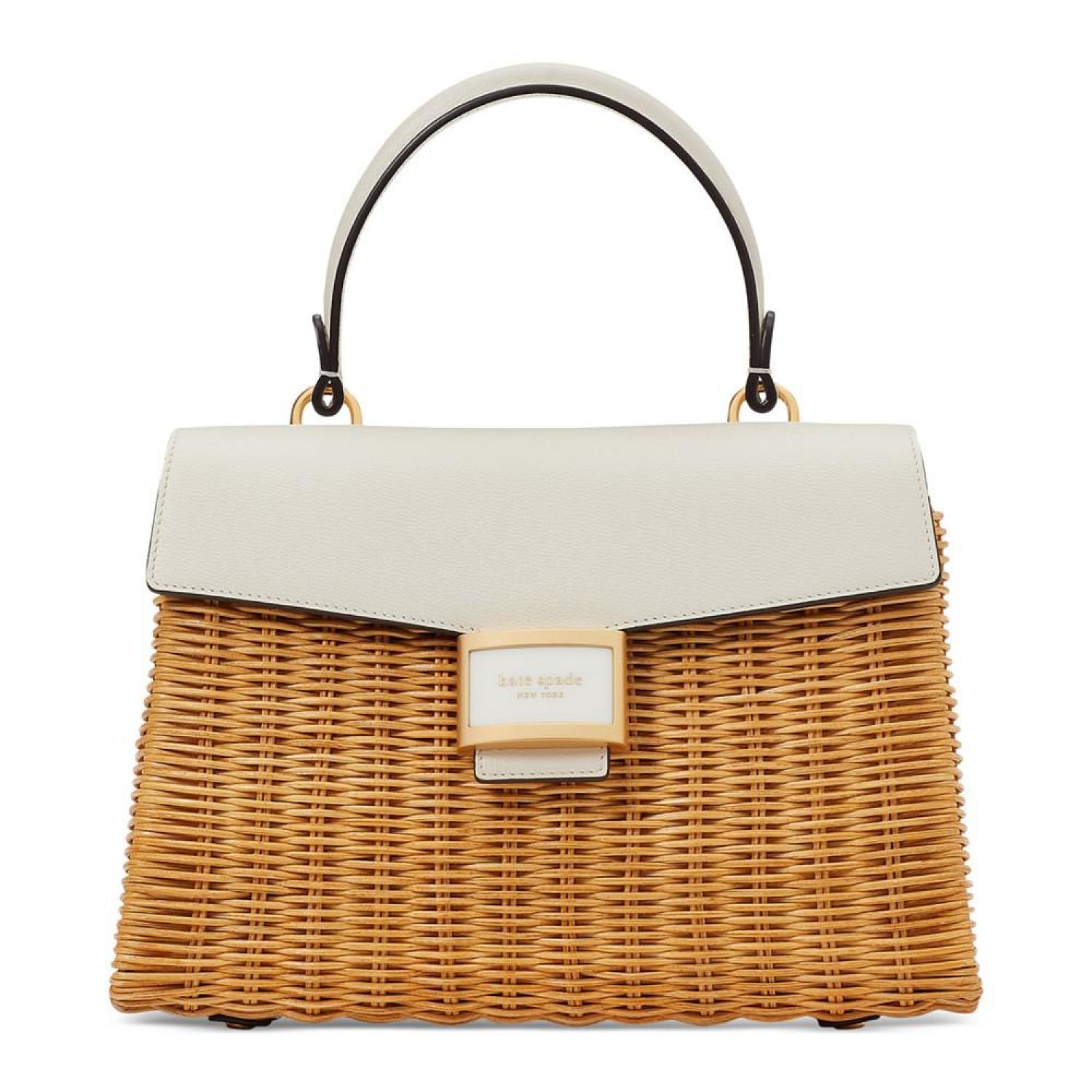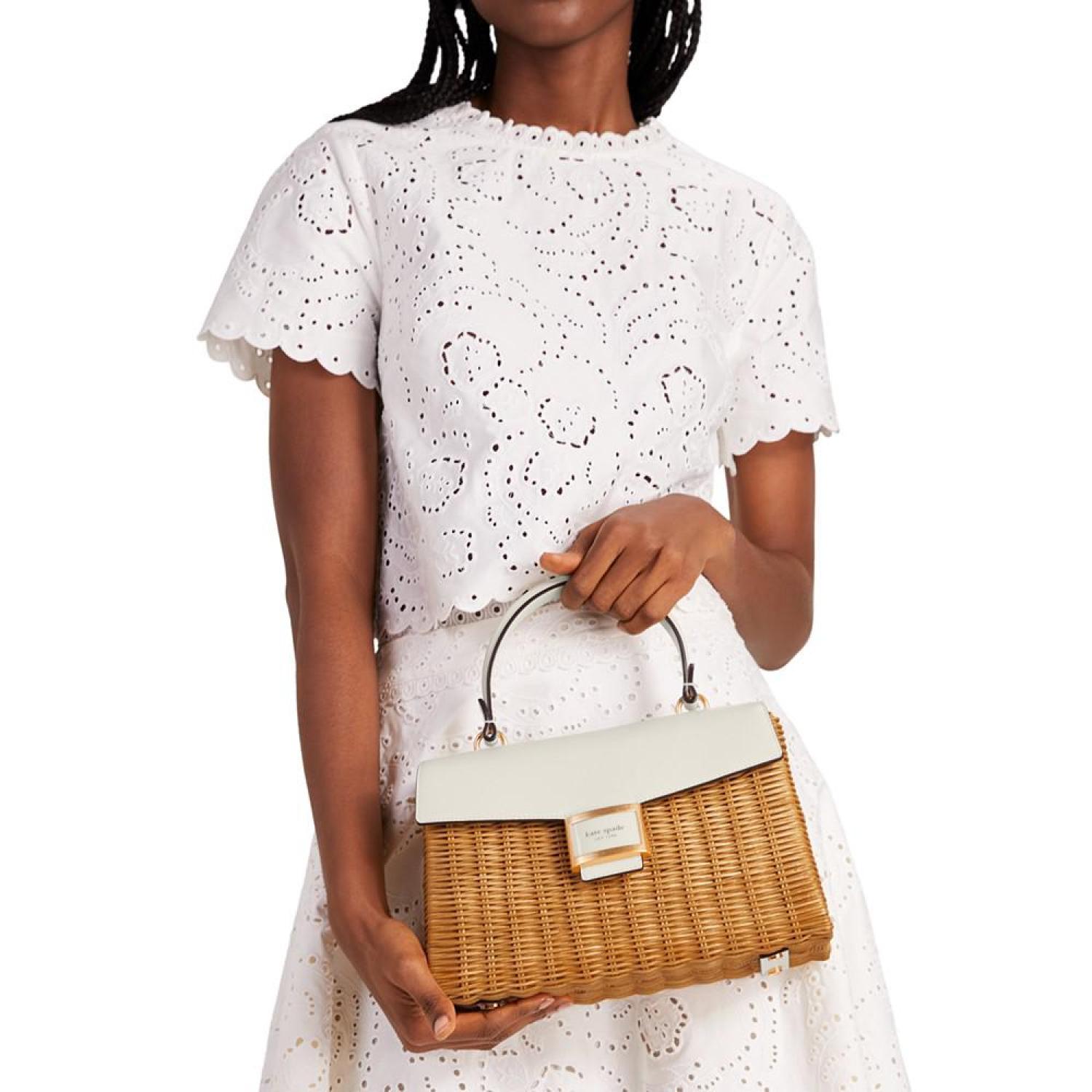 Elevate your summer style with the Katy Wicker Small Top Handle Satchel by kate spade new york. Small sized bag; 10-4/5"W x 7-7/10"H x 4-3/10"D (width is measured across the bottom of handbag) Silhouette is based off 5'9" model 4"L handle; 22"L removable, adjustable strap Magnetic snap closure Warm gold-tone hardware Interior zip & slip pockets Wicker, leather Spot clean Imported