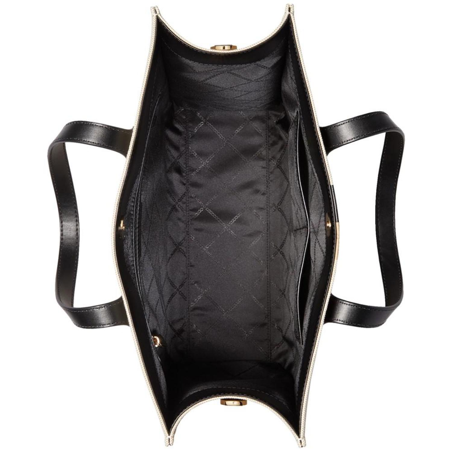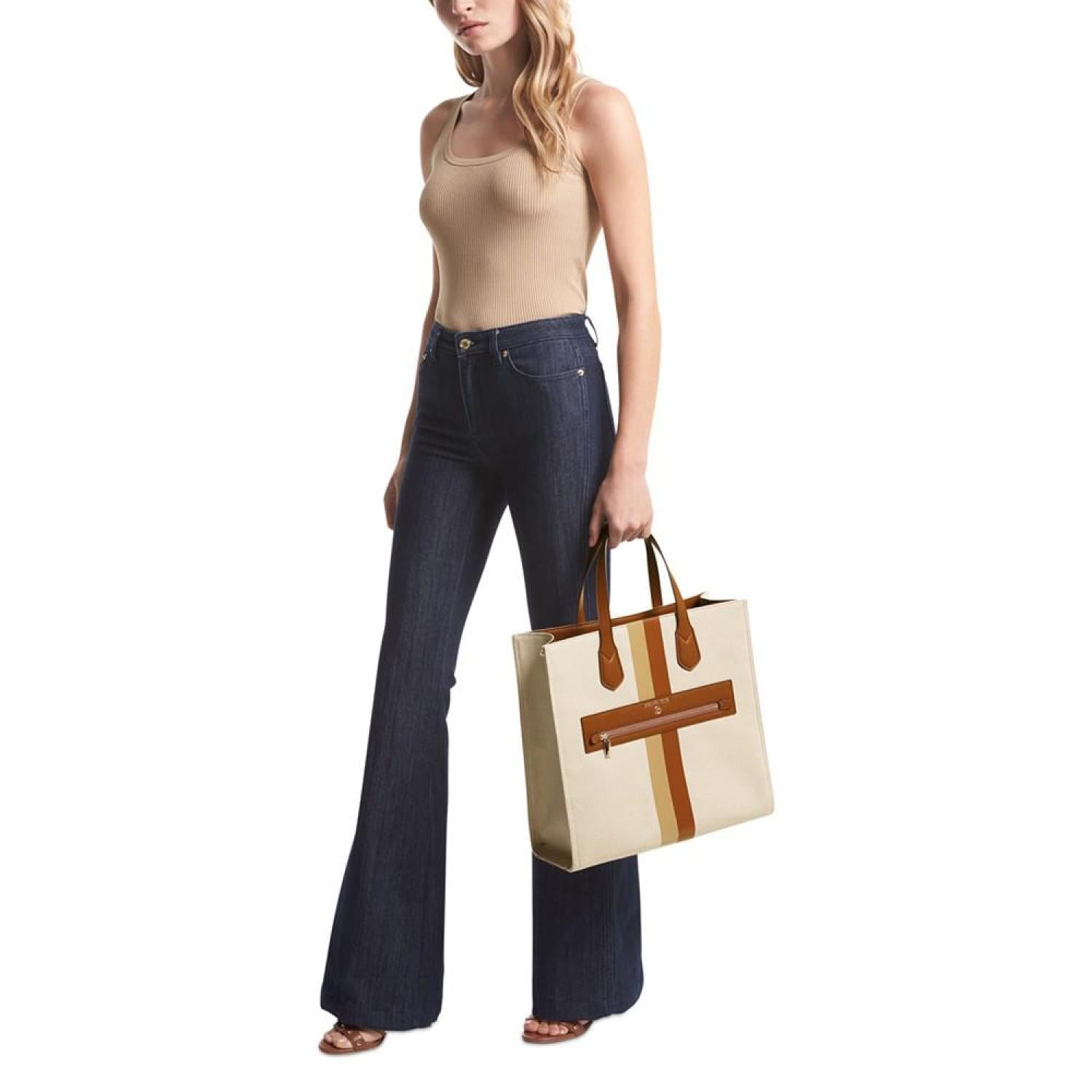 Contemporary with chic details, the Kempner Large North South Tote by MICHAEL Michael Kors takes your style in the right direction. Large sized bag; 14-1/4"W x 14"H x 5-1/2"D (width is measured across the bottom of handbag); 1.90 lbs. approx. weight Silhouette is based off 5'9" model 6"L handles; 22"L adjustable, removable strap Snap closure Gold-tone hardware Interior zip & slip pockets Cotton, polyester; lining: polyester; trim: polyurethane, cotton, polyester Spot clean Imported