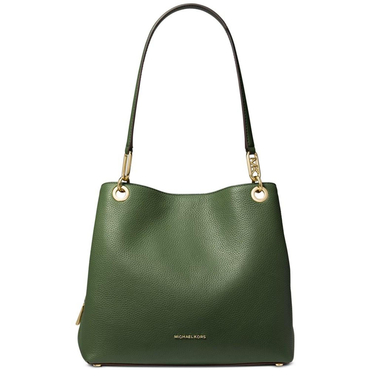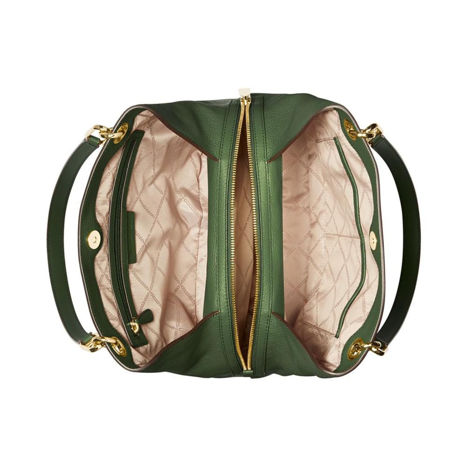 Incredibly functional with multiple interior compartments, the Kensington Medium Leather Tote by MICHAEL Michael Kors lends sophistication to organization. Medium sized bag; 12-1/2"W x 10-1/4"H x 5-1/2"D (width is measured across the bottom of handbag); 1.74 lbs. approx. weight Silhouette is based off 5'9" model 10-1/2"L handles Snap closure Gold-tone hardware & exterior back zip pocket Interior center zip compartment, zip pocket & slip pockets Leather; lining: polyester Spot clean Imported