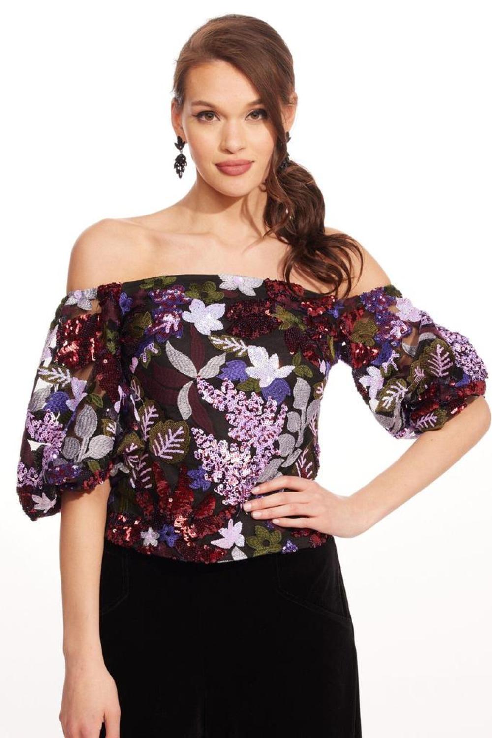Look and feel like a Goddess in this ever-so-flattering off-the-shoulder blouse in a striking sequins embroidered fabric. Fully lined with a rear zipper. Puffed sleeves Fitted bodice Cropped length Off-shoulder Fully lined Rear Zip Self - 100% Polyester Lining - 100% Polyester Hand wash cold Made in Los Angeles, USA