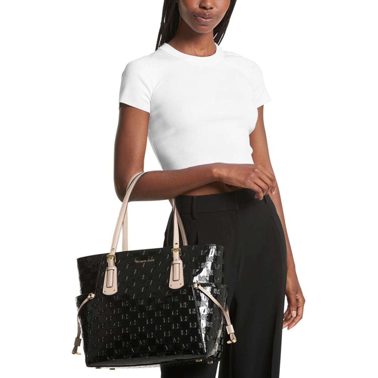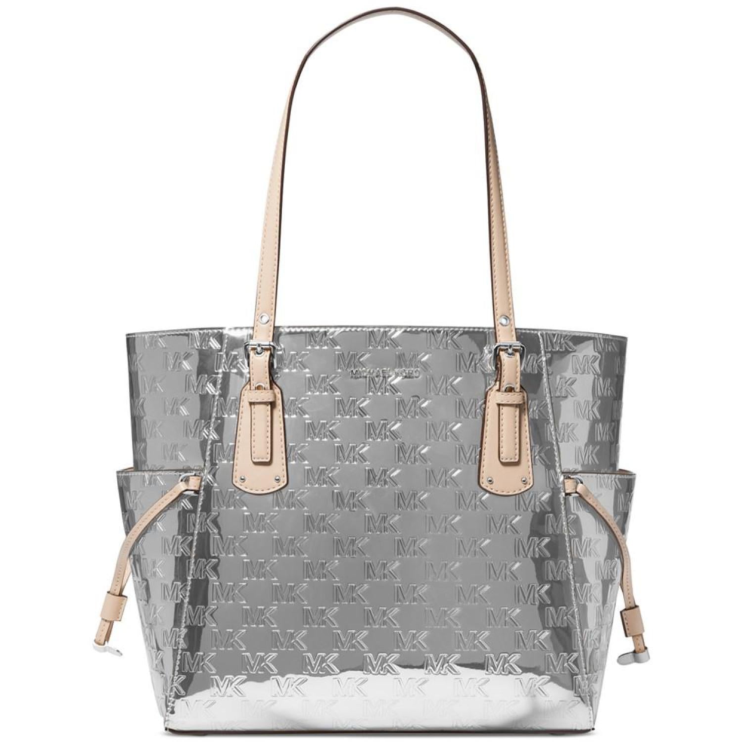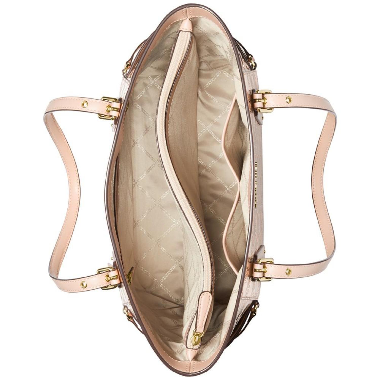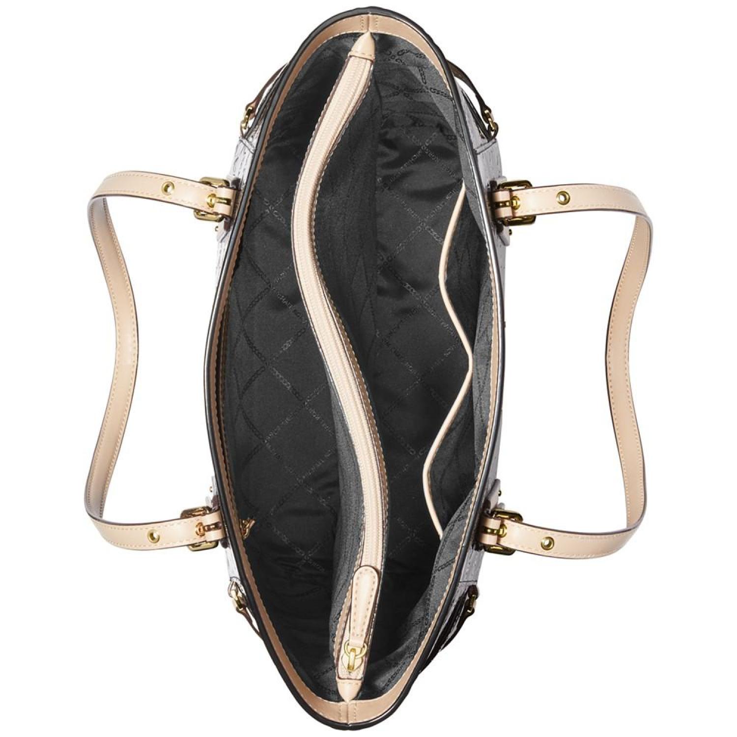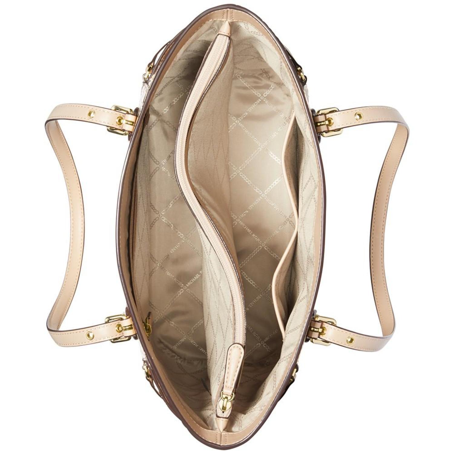 Sized to take on busy days, this tote by MICHAEL Michael Kors shines. Equipped with a center zip compartment at the interior and slip pockets at the exterior, it is finished with shiny gold-tone hardware for a luxe look. Large sized bag; 14-3/4"W x 11"H x 6-1/4"D (width is measured across the bottom of handbag); 2.22 lbs. approx. weight Silhouette is based off 5'9" model 8-1/2"L handles Open top Gold-tone hardware, 2 exterior side slip pockets & logo Interior center zip compartment & slip pockets Tablet compatible (std. size 8"-10") TPU, polyurethane, polyester Spot clean Imported