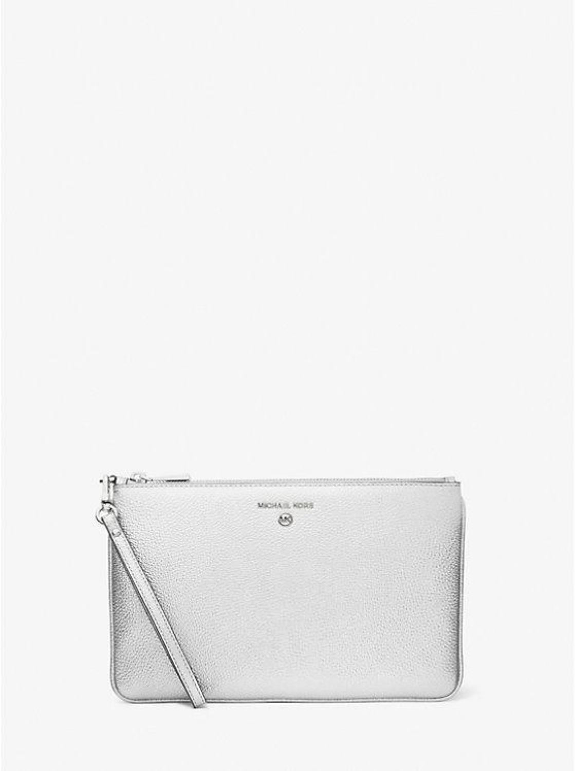 Crafted from metallic pebbled leather, this timeless wristlet is large enough to accommodate the basics, yet small enough to fit into your everyday tote. Its sleek profile makes it easy to dress up or down, and it includes an easy-to-access back pocket that’s perfect for storing your phone. Grab it and go for your next coffee run.