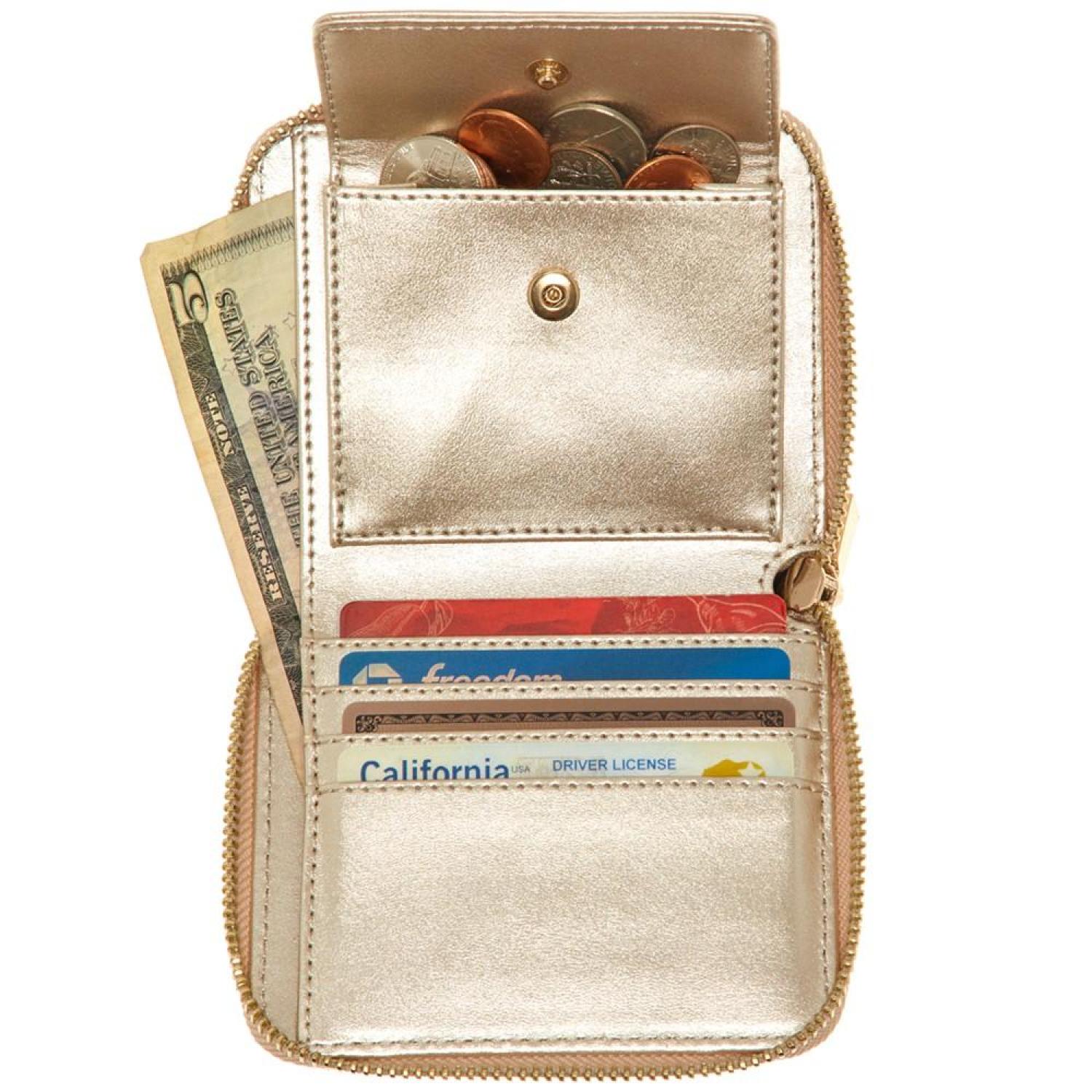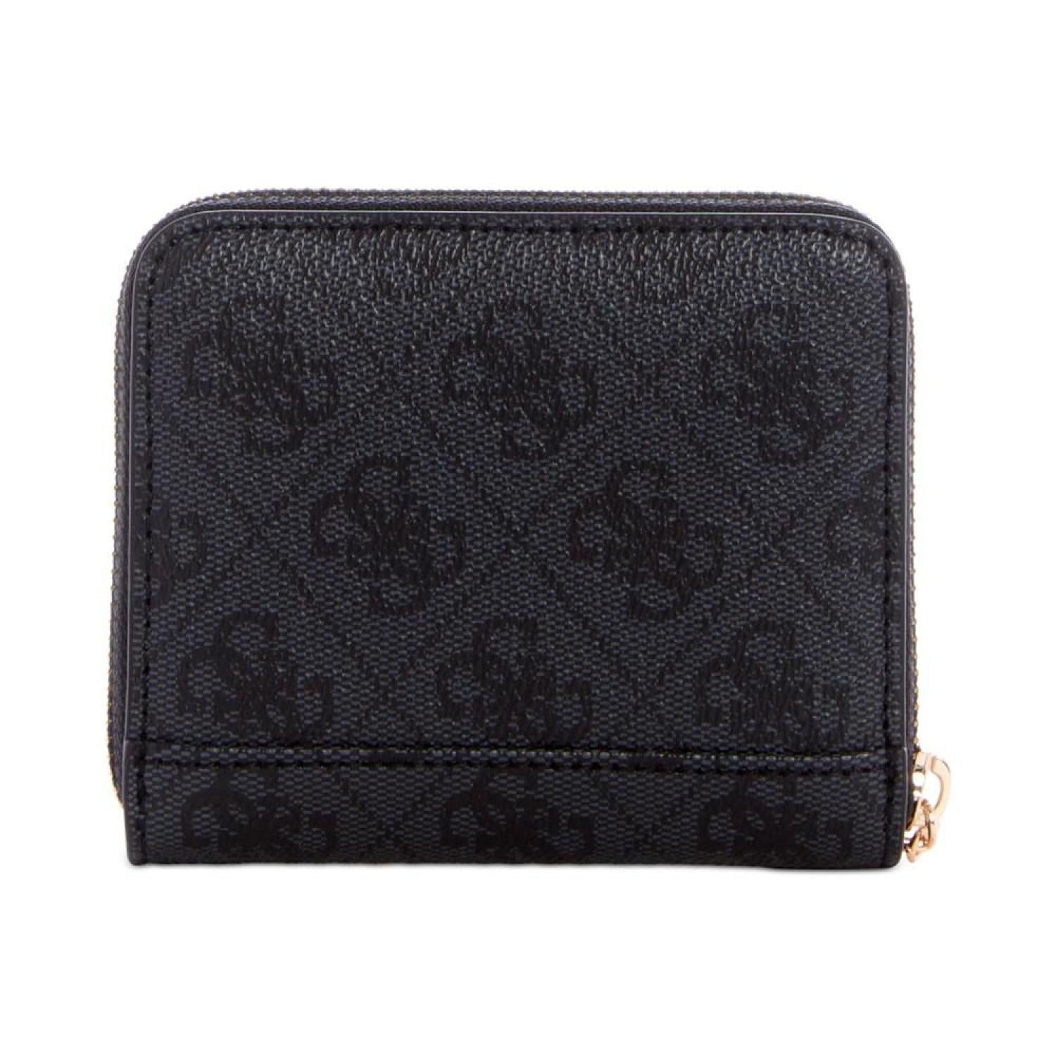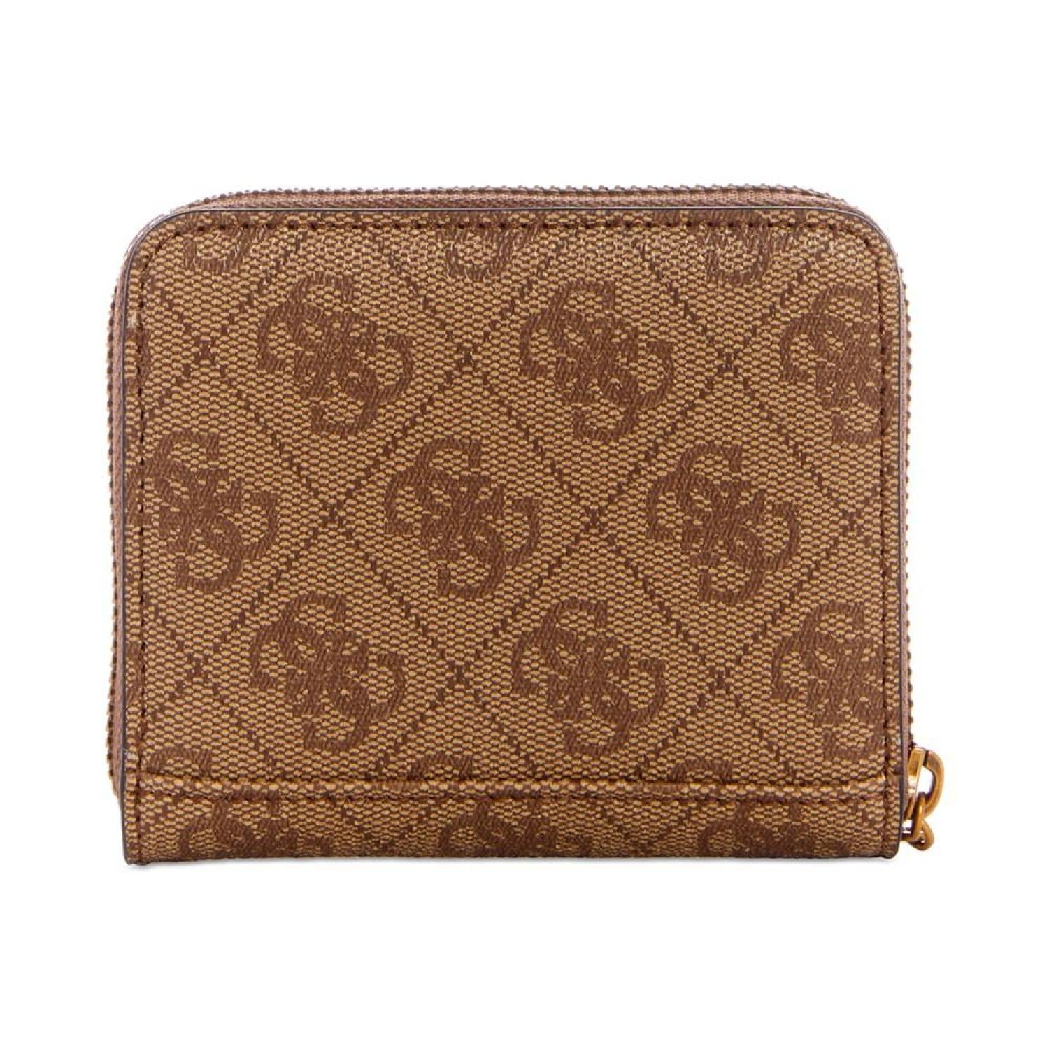 - Keep your essentials safe in classic GUESS style with the Laurel Signature Small Zip Around Wallet. 4-1/4"W x 4"H x 3/4"D; 0.2lbs approx. weight Zip-around closure Gold-tone hardware Interior coin pocket, 2 slip pockets & 4 card slots Polyurethane; lining: polyester Wipe clean Imported