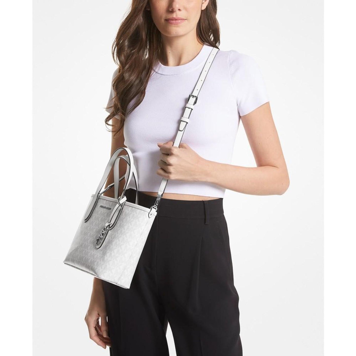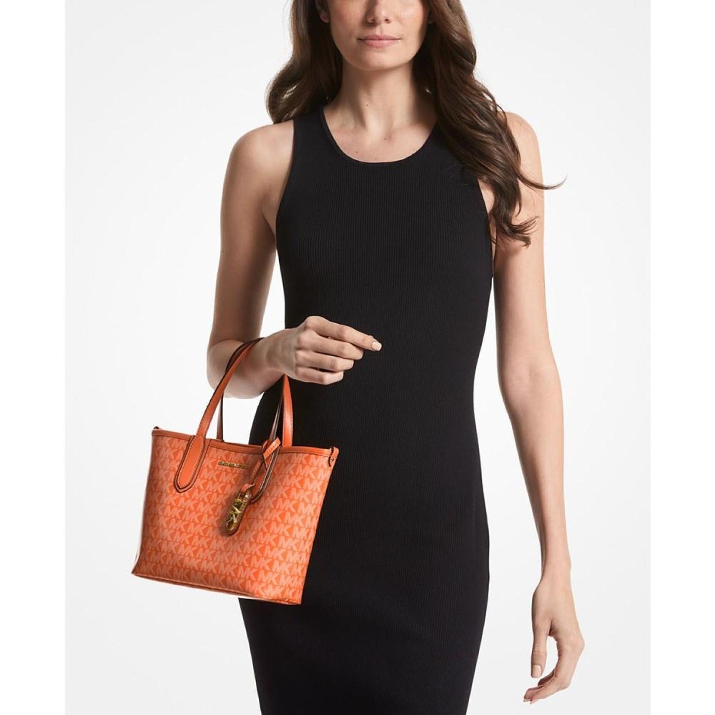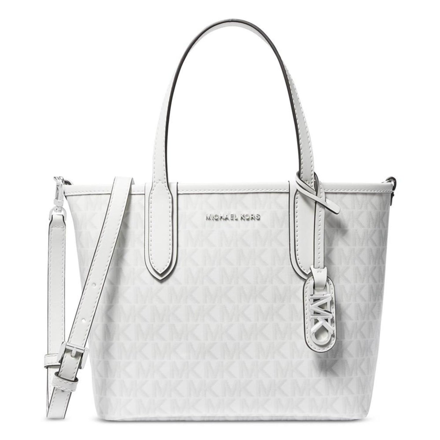 Compact with big style, the Eliza Small East West Open Tote by MICHAEL Michael Kors offers a convenient open top with a removable pouch for added versatility. Small sized bag; 10-3/4"W x 7-3/4"H x 4-1/4"D (width is measured across the bottom of handbag); 0.83 lbs. approx. weight Silhouette is based off 5'9" model 5-1/2"L handles; 19-3/4"L removable, adjustable strap Open top Hardware tone varies by color Removable interior pouch Cotton, polyvinylchloride; lining: polyester; trim: polyurethane Spot clean Imported