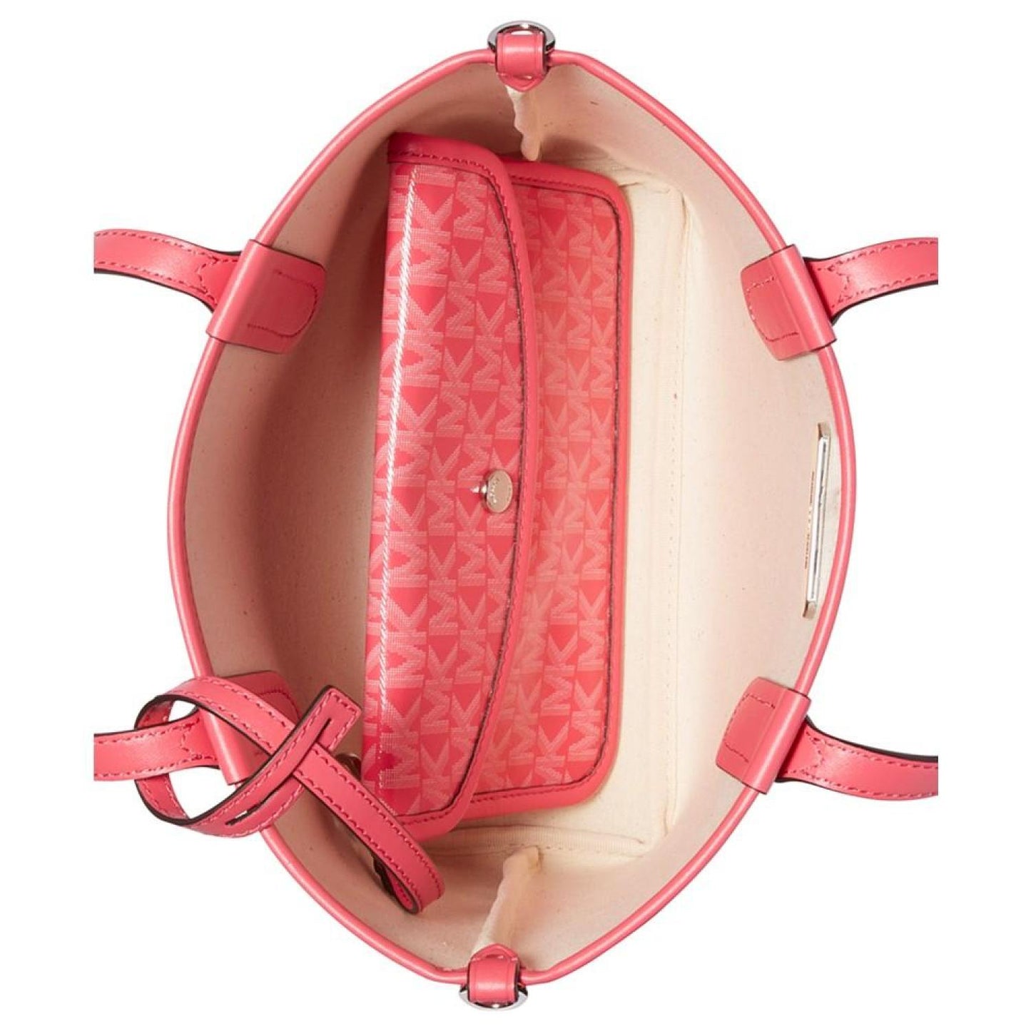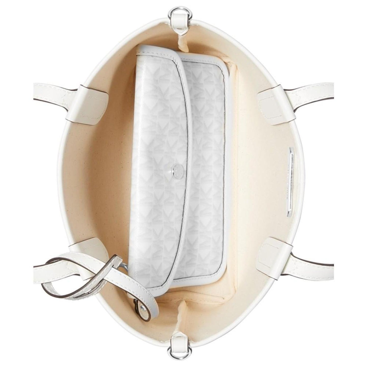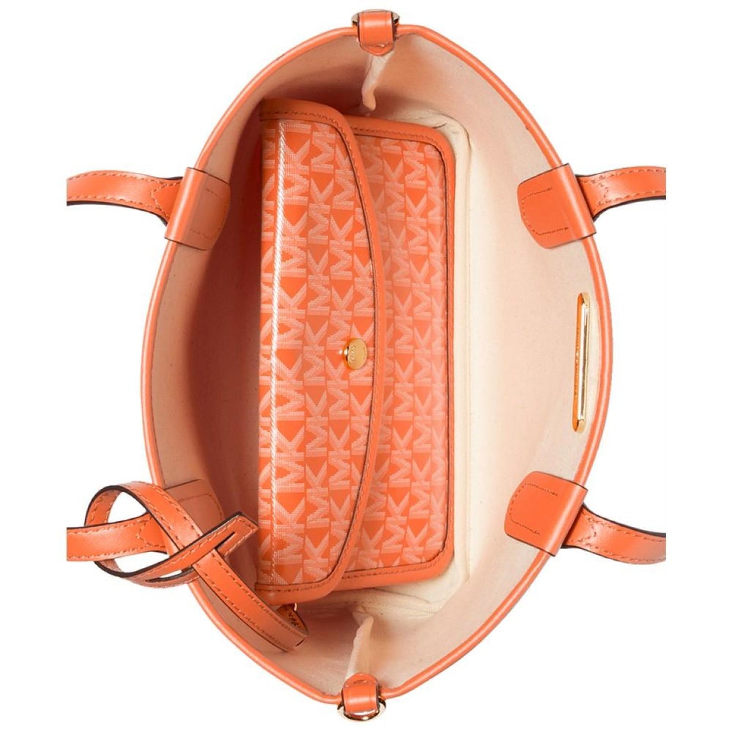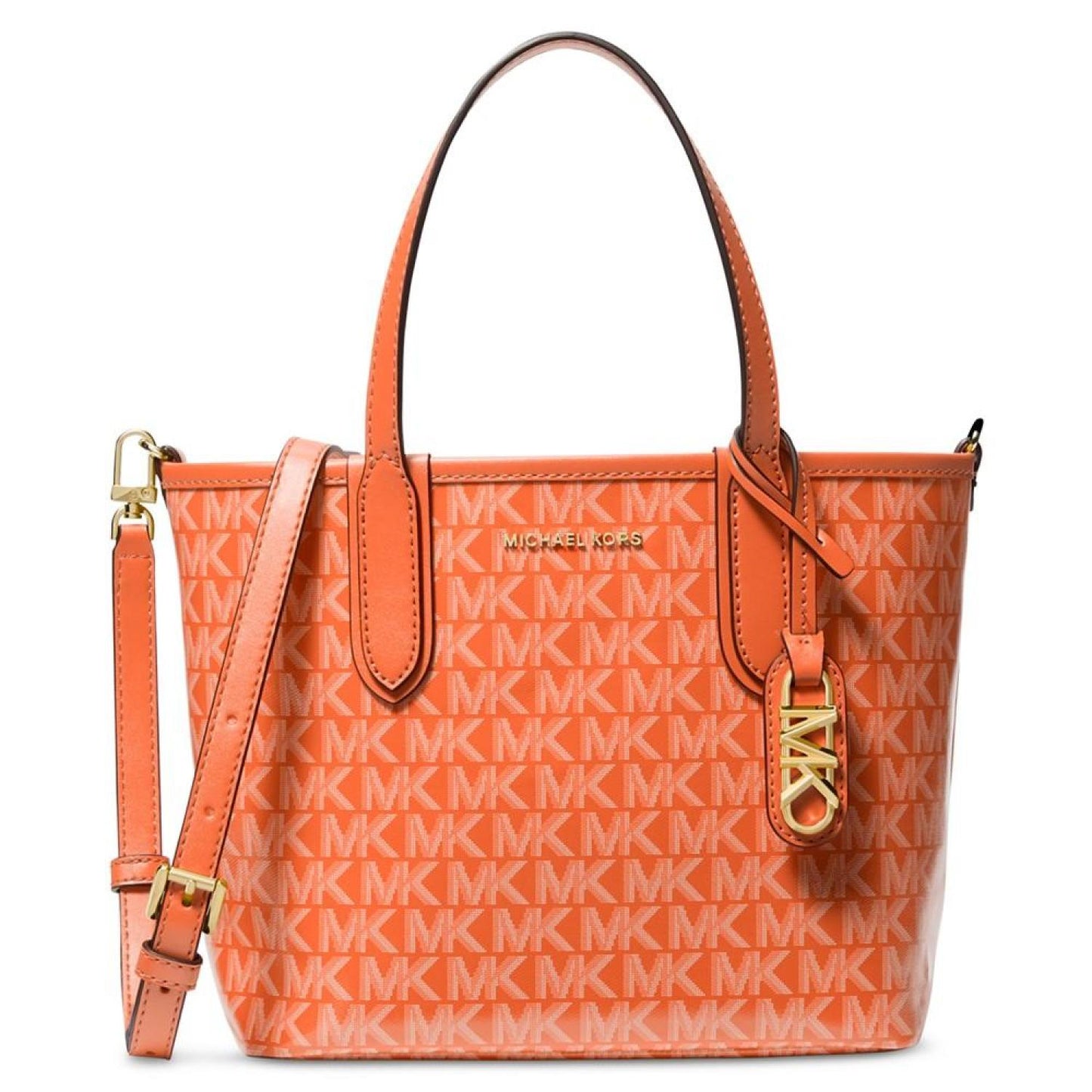 Compact with big style, the Eliza Small East West Open Tote by MICHAEL Michael Kors offers a convenient open top with a removable pouch for added versatility. Small sized bag; 10-3/4"W x 7-3/4"H x 4-1/4"D (width is measured across the bottom of handbag); 0.83 lbs. approx. weight Silhouette is based off 5'9" model 5-1/2"L handles; 19-3/4"L removable, adjustable strap Open top Hardware tone varies by color Removable interior pouch Cotton, polyvinylchloride; lining: polyester; trim: polyurethane Spot clean Imported
