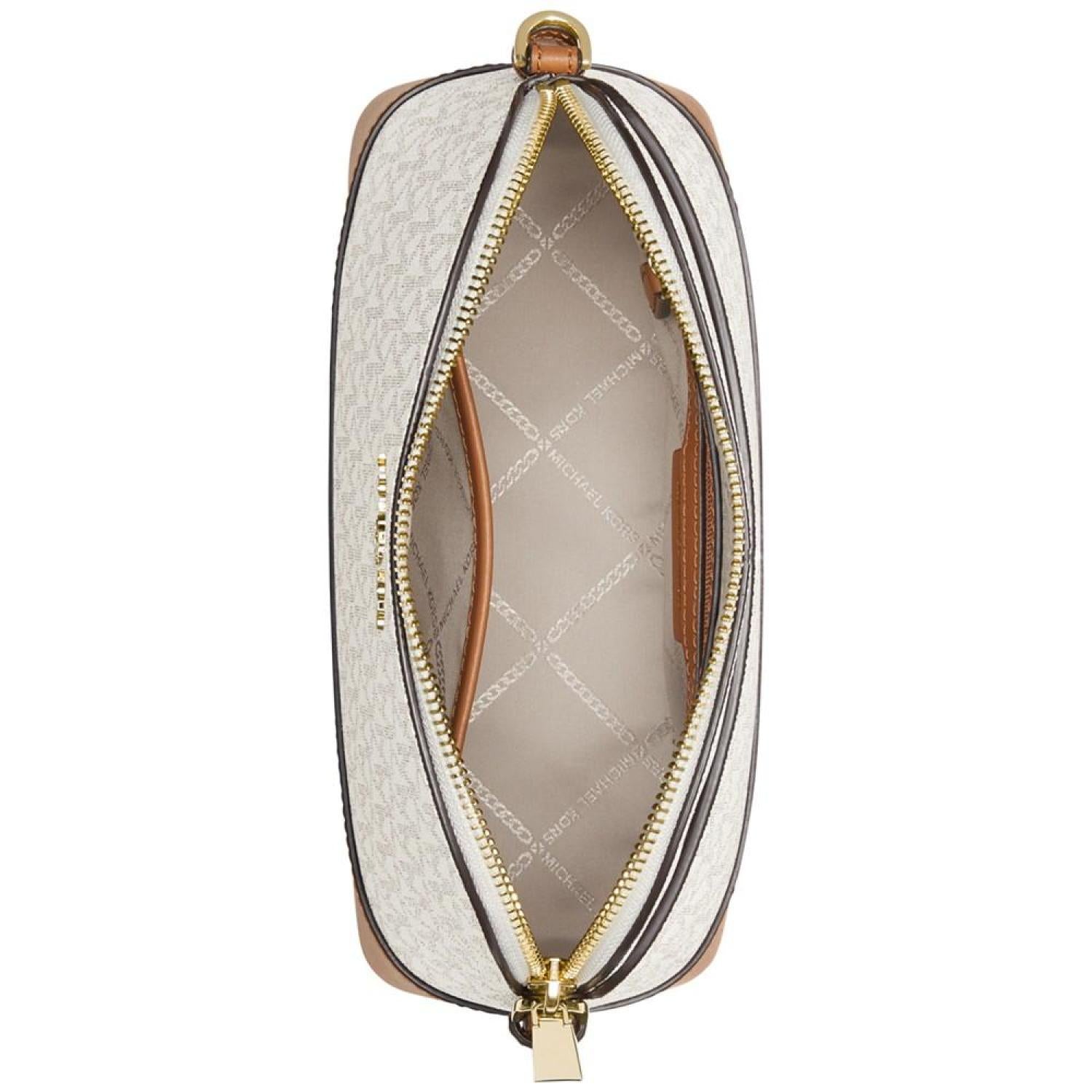 Michael Michael Kors delivers elegant sophistication and signature style with this logo-adorned dome crossbody. Small sized crossbody; 9"W x 7"H x 3-1/2"D (width is measured across the bottom of handbag); 0.82 lbs. approx. weight Silhouette is based off 5'9" model 21"L - 24"L adjustable, removable strap Top-zip closure Gold-tone exterior hardware, 1 slip pocket & logo 1 interior slip pocket & 1 zip pocket Bag converts from crossbody to clutch by removing strap PVC/polyester/cotton/polyurethane; lining: polyester; trim: leather Imported