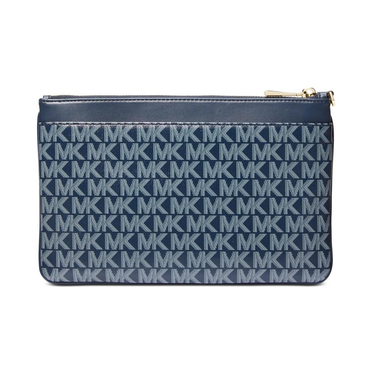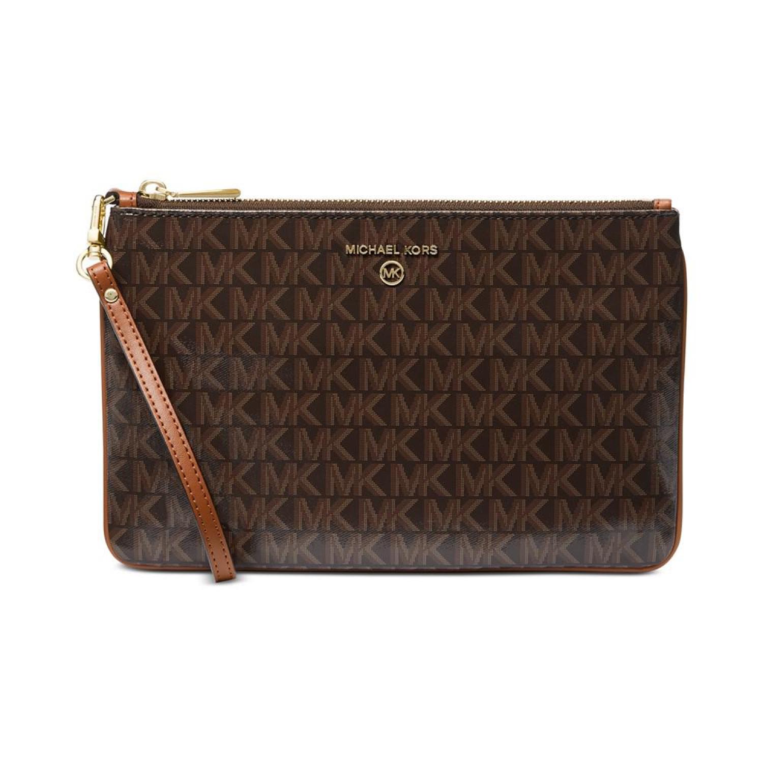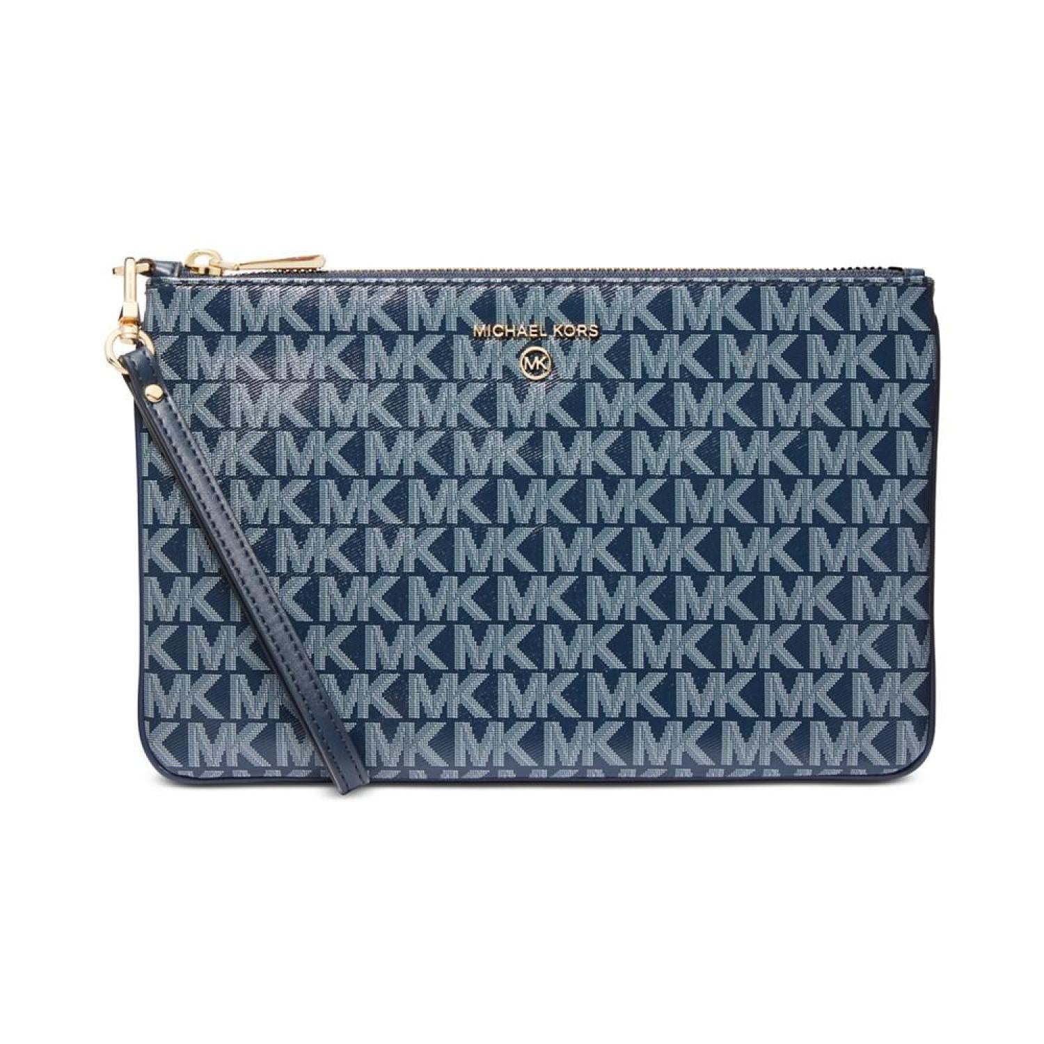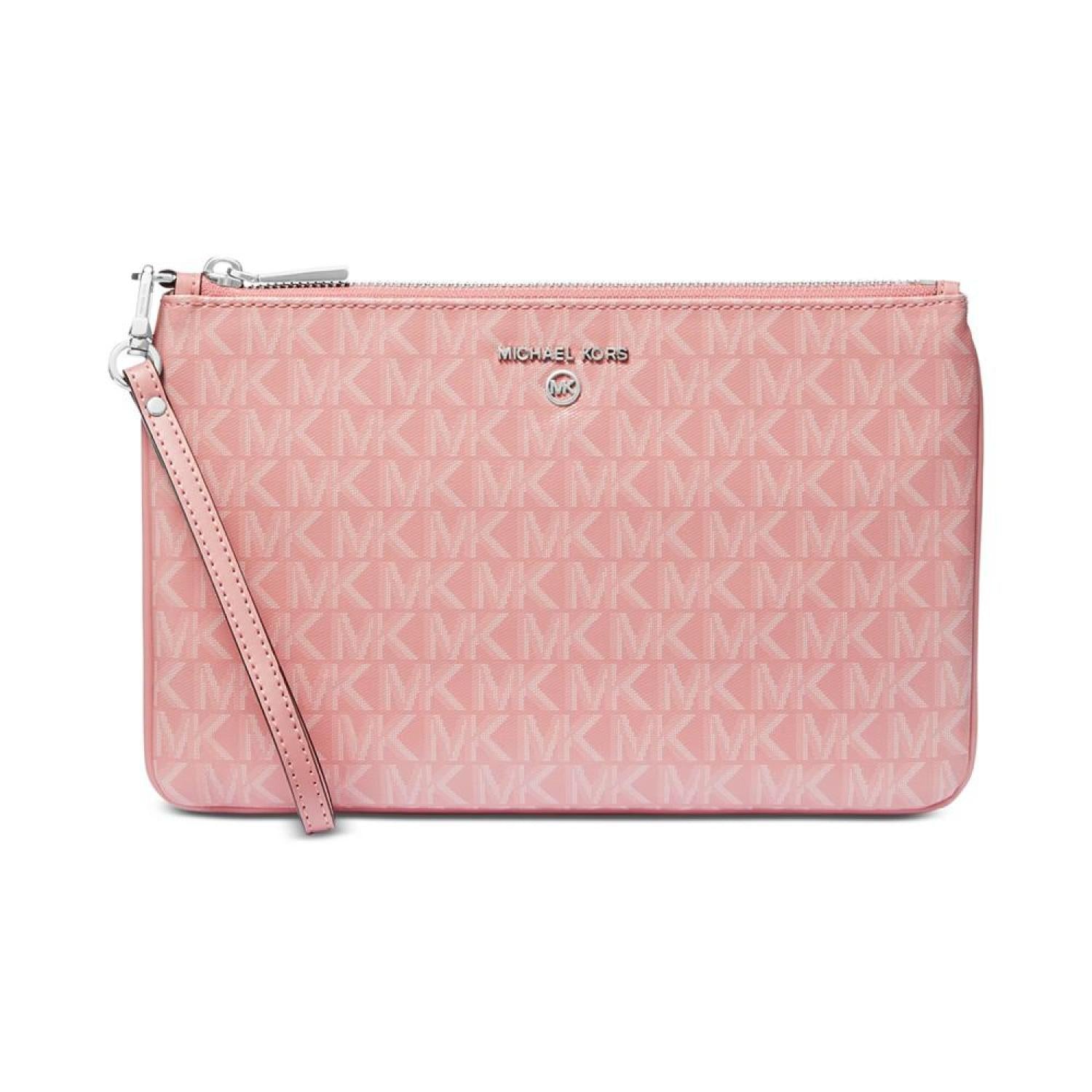 Lightweight and sophisticated, the Jet Set Charm Monogram Zippered Wristlet by MICHAEL Michael Kors is perfect for just the essentials. 10-1/4"W x 6-3/4"H x 3/4"D; 0.48 lbs. approx. weight 7-1/2"L wrist strap Zippered closure Hardware tone varies by color & exterior slip pocket Interior slip pocket & 6 card slots Cotton, polyvinylchloride; lining: polyester; trim: polyurethane, cotton, polyester Spot clean Imported
