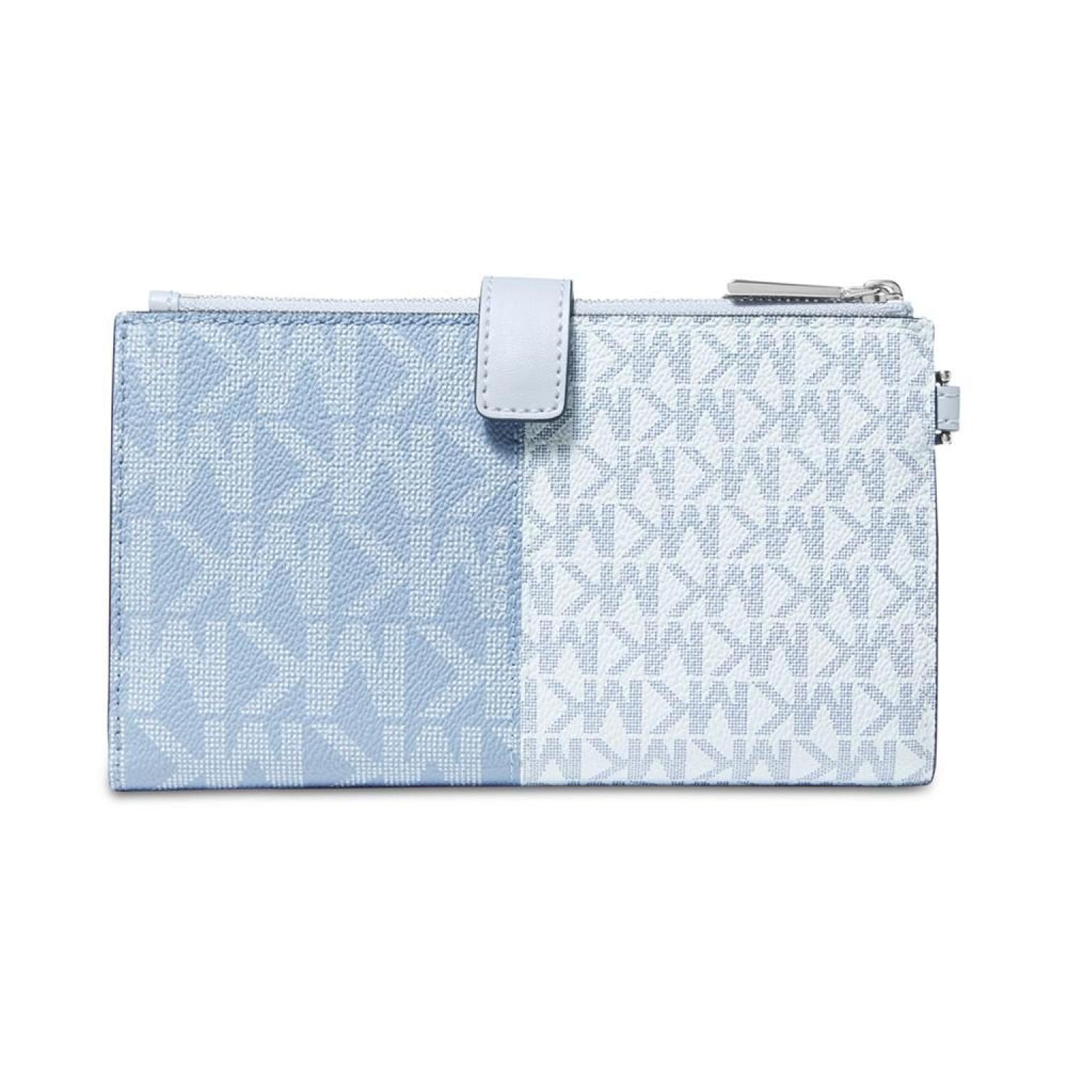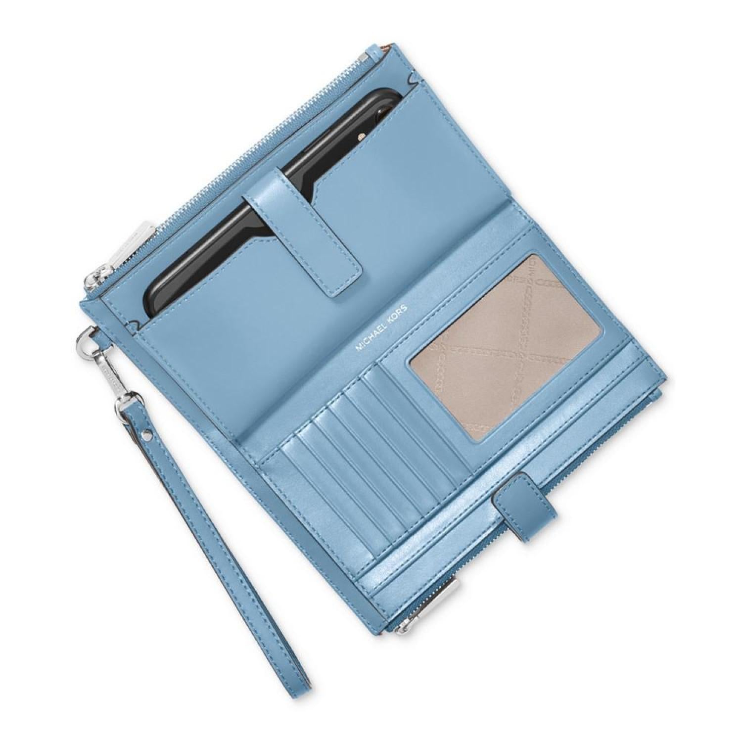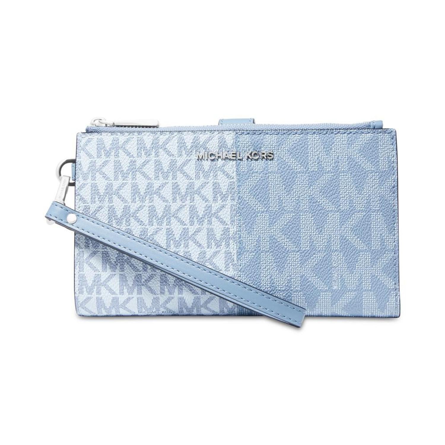 MICHAEL Michael Kors Jet Set Wristlet Mini sized bag; 7.25"W x 4"H x 1.5"D (width is measured across the bottom of handbag); 0.24 lbs. approx. weight Zip closure, magnetic snap closure Exterior 2 top zip pockets Interior 6 credit card pockets, 1 window pocket, 1 phone pocket, 3 slip pockets 89.4% Pvc, 9.6% Polyester, 1% Pu Spot clean Imported