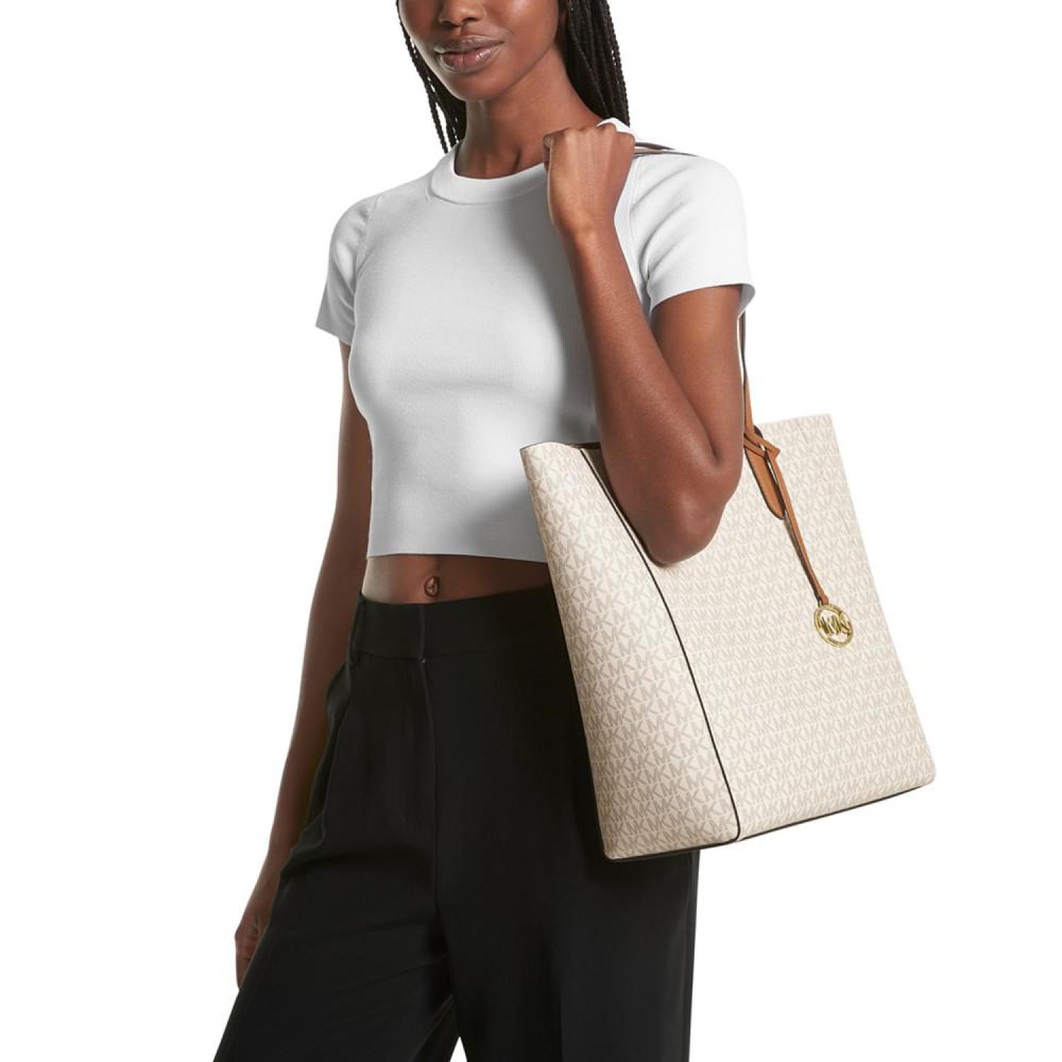 Perfect for busy days, enjoy ample space and classic style with the Sinclair Large North South Shopper Tote by MICHAEL Michael Kors Large sized bag; 15-1/2"W x 14"H x 6-1/4"D (width is measured across the bottom of handbag); 1.35 lbs. approx. weight Silhouette is based off 5'9" model 10"L handles Snap closure Hardware tone varies by color Interior slip pockets PVC, polyester, polyurethane; trim: polyurethane, cotton, polyester Spot clean Imported