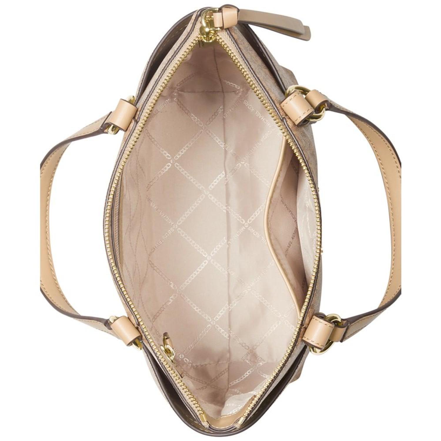 Crafted with bold, bright logo details for high-impact style, this Michael Michael Kors Sullivan tote can be carried in hand by the top handles or worn hands-free via the long, adjustable strap. Small sized bag 12.5"W x 7.5"H x 4.5"D Top Zip Closure Gold-tone hardware 5" handle; 20"-24" adjustable, removable strap 1 Interior Back Zip Pocket, 1 Front Slip Pocket 2 Exterior Side Slip Pockets 1.08 lbs Includes dust bag PVC/polyester/cotton Imported