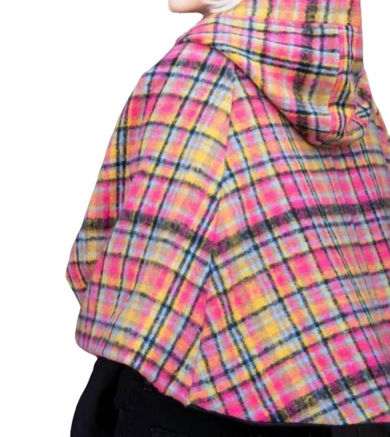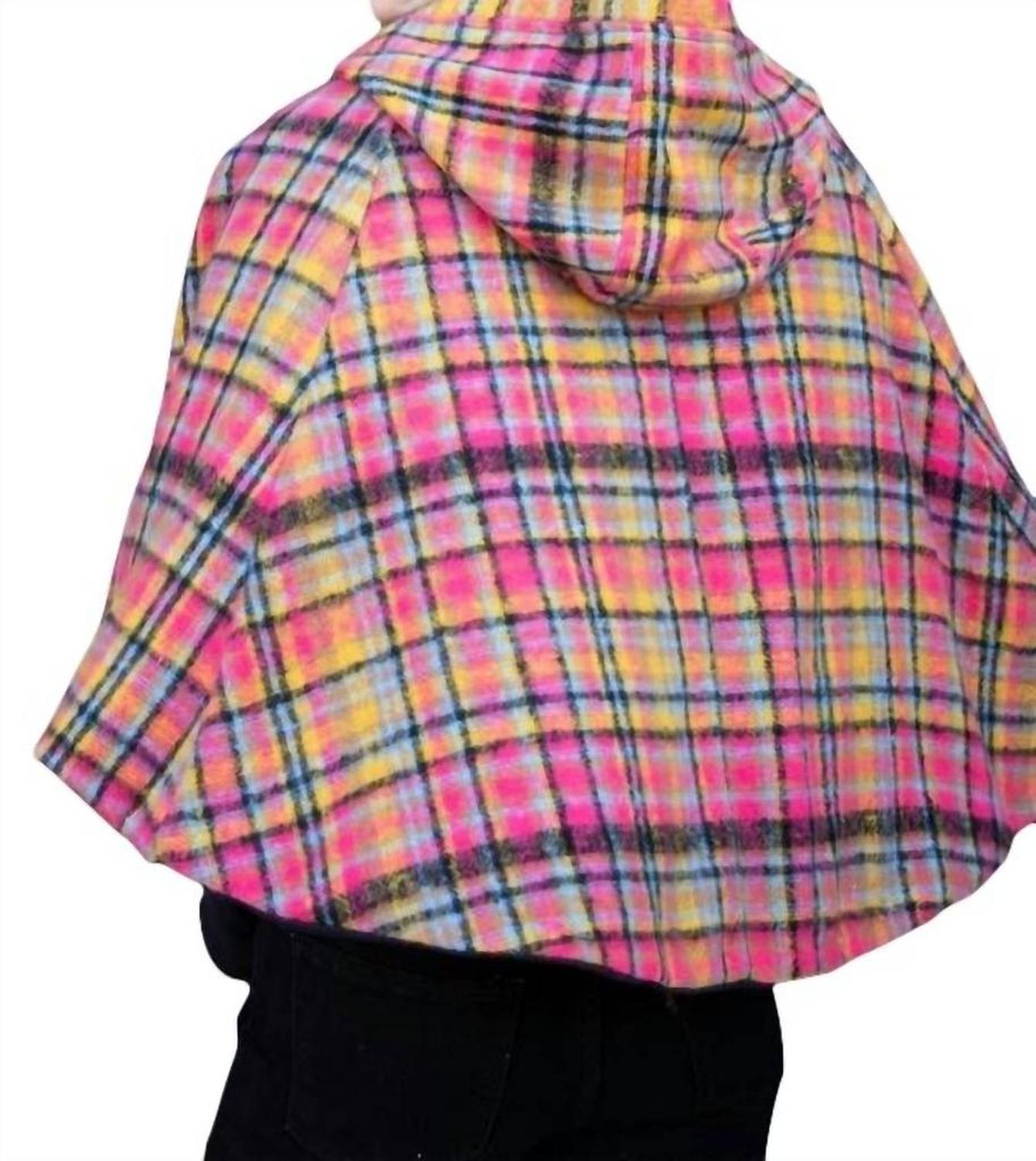 • Stylish and feminen, this cape is a perfect addition to any outfit during the cooler months.Colorful plaid cape coat with wide 3/4 length sleeve and pockets. One size fits most. The perfect layering piece to keep you warm this season!