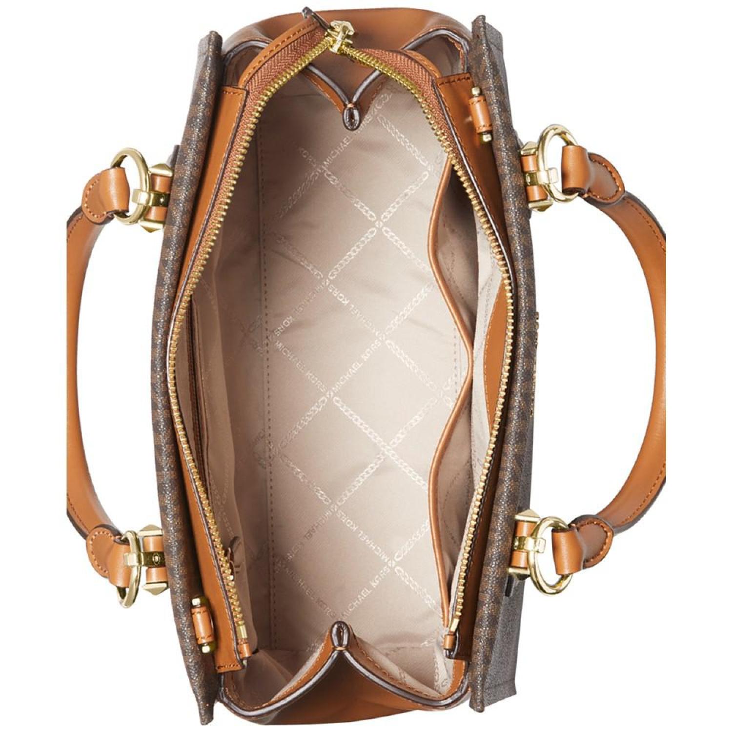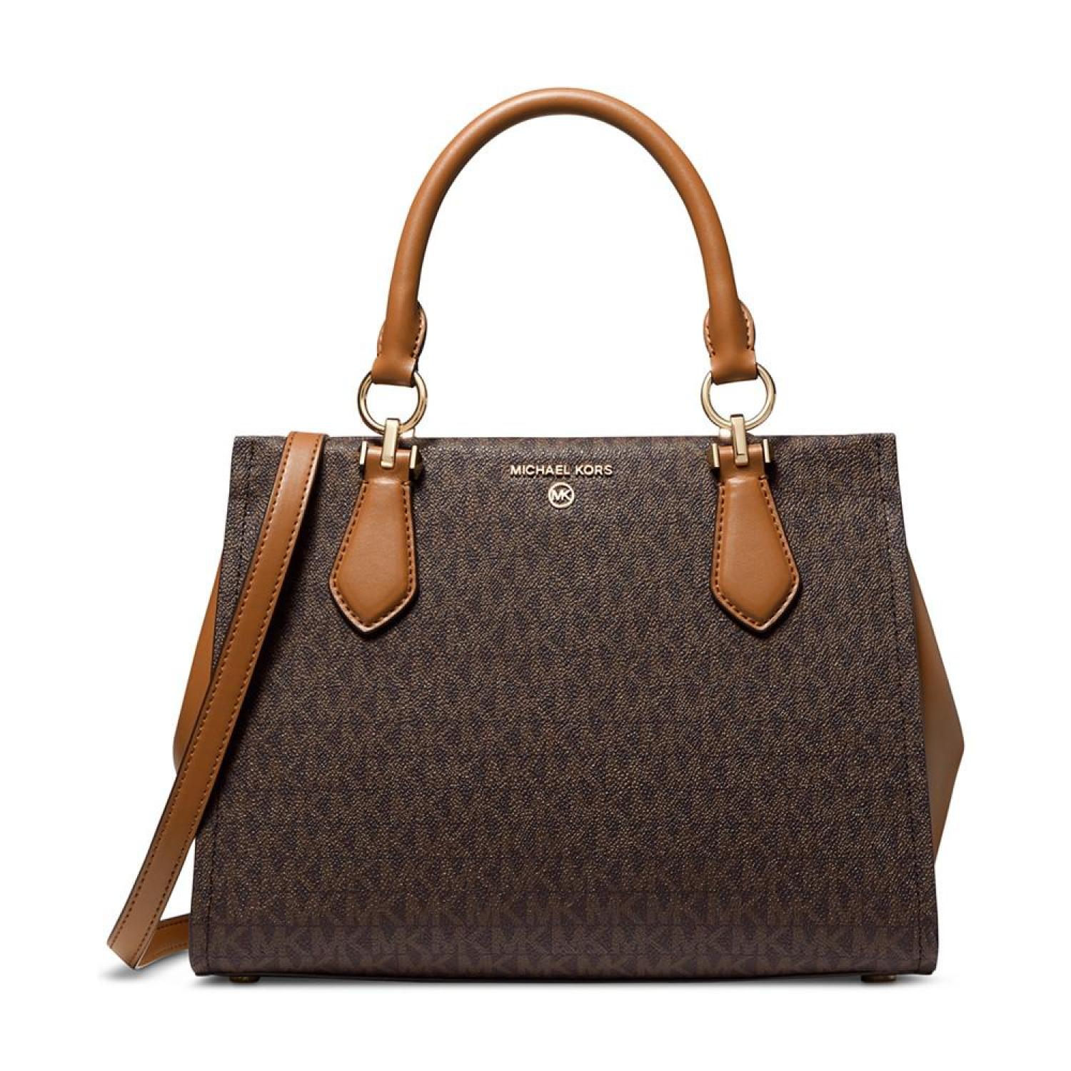 Classic style and perfect function come together with the Marilyn Medium Satchel by MICHAEL Michael Kors. Medium sized bag; 11-1/4"W x 8-1/4"H x 5-1/2"D (width is measured across the bottom of handbag); 0.68 lbs. approx. weight Silhouette is based off 5'9" model 4-1/2"L handle; 21"L adjustable strap Zippered closure Gold-tone hardware Interior zip & slip pockets Polyvinylchloride, polyester, polyurethane; lining: polyester; trim: polyurethane, cotton, polyester Spot clean Imported