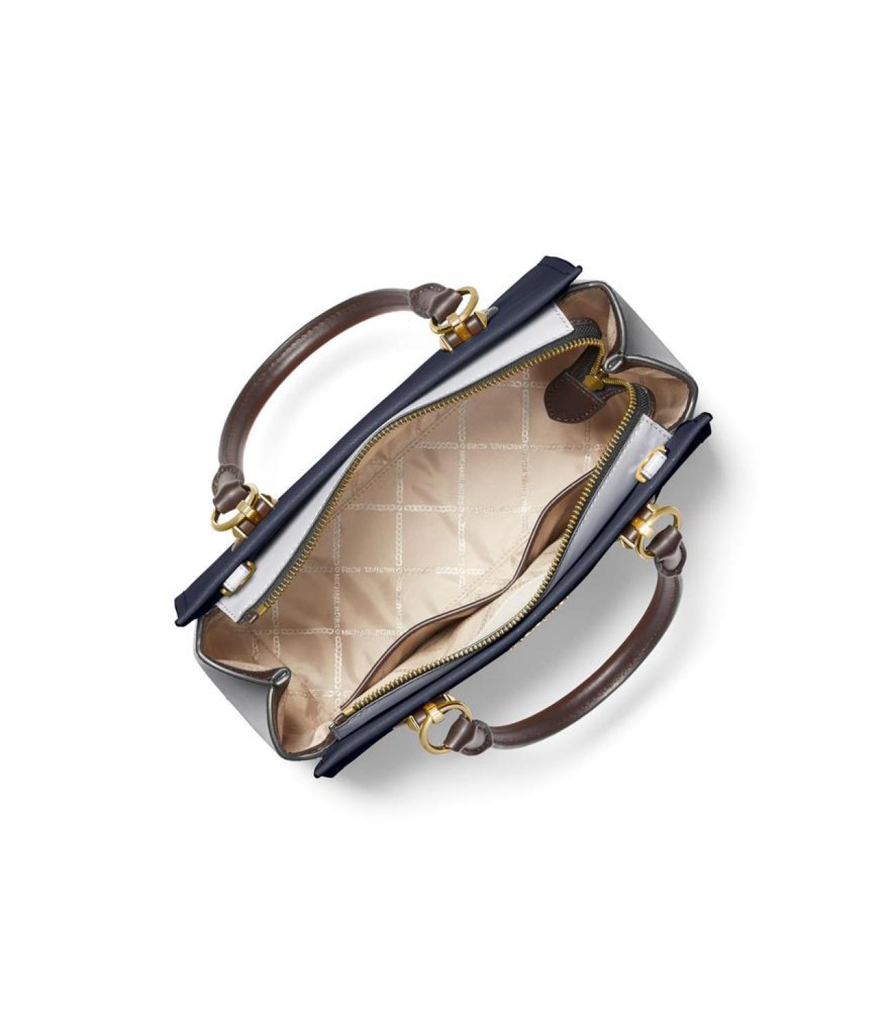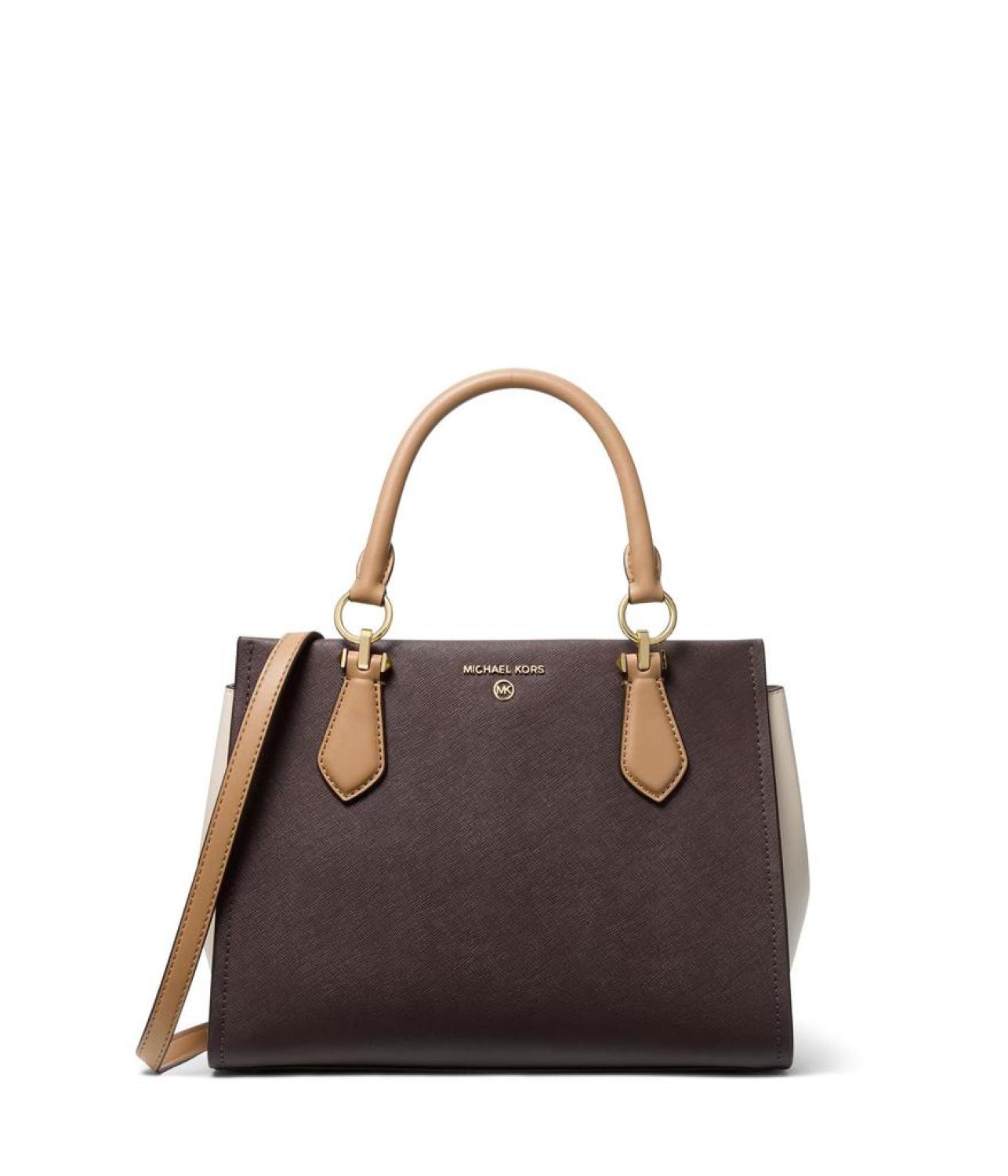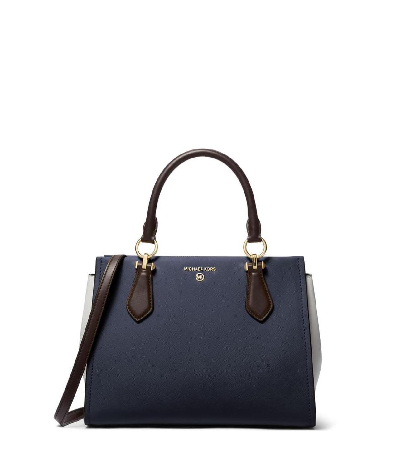 Elevate your style quotient carrying the MICHAEL Michael Kors® Marilyn Medium Satchel handbag. Leather construction. Zippered closure. Two contrast carry handles. One detachable and adjustable crossbody strap. One zippered interior pocket on the front. Two interior slip pockets. Two exterior slip pockets. Brand detailing on the front. Polyester lining. Imported. Please note, the hardware color and interior lining may differ from the color shown in the photo. Measurements: Bottom Width: 11 1/2 in Depth: 3 3/4 in Height: 8 1/2 in Strap Length: 46 in Strap Drop: 22 1/2 in Handle Length: 13 1/2 in Handle Drop: 4 3/4 in Weight: 1 lb 15 oz