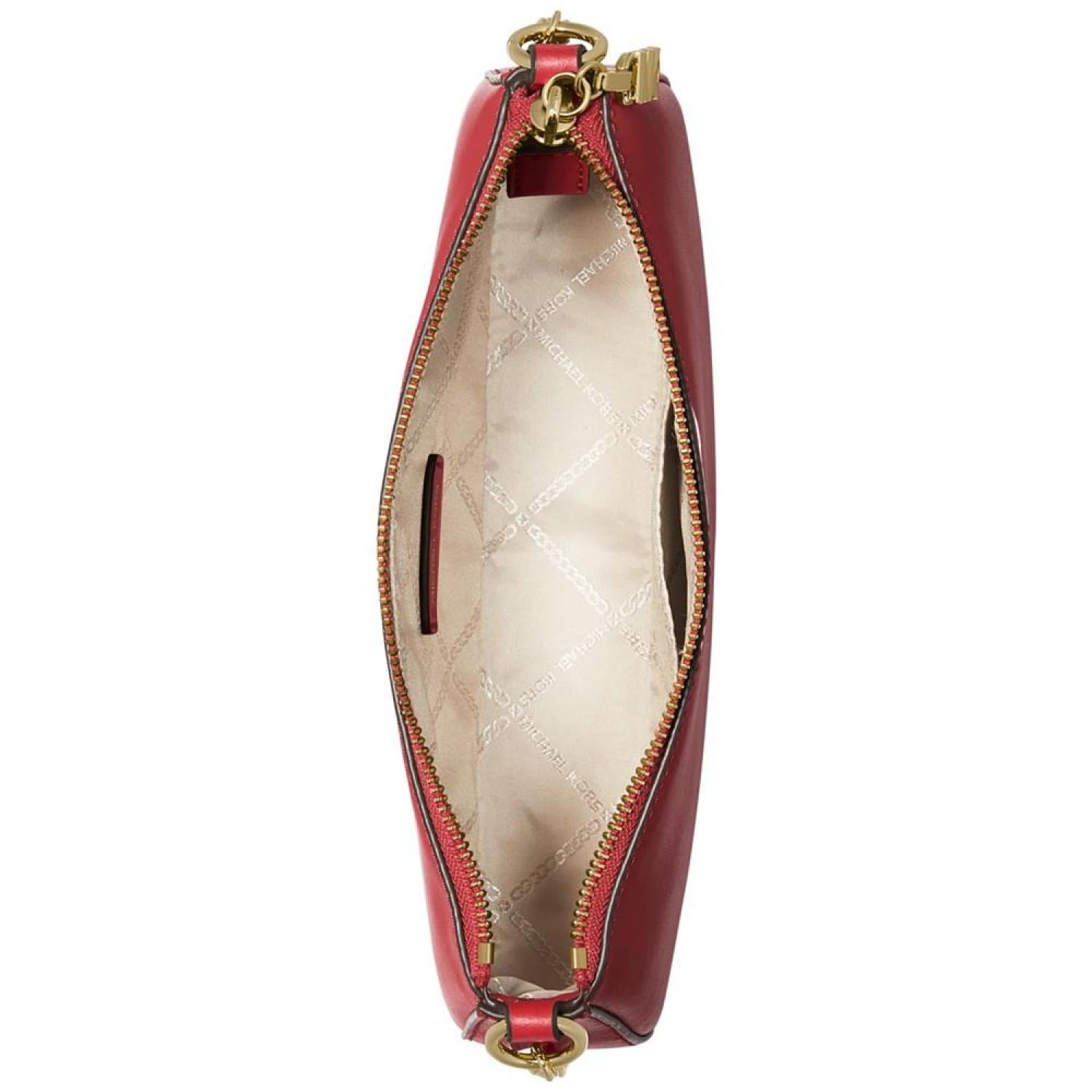 Sleek and classic, this leather pouchette by MICHAEL Michael Kors steals the show. Adorned with a shiny chain strap, the signature hardware lends a polished finish. Small sized bag; 10"W x 5"H x 2"D (width is measured across the bottom of handbag); 0.64 lbs. approx. weight Silhouette is based off 5'9" model 11-1/2"L handle Zippered closure Gold-tone hardware & exterior metal logo 3 interior card slots Leather; lining: polyester Spot clean Imported