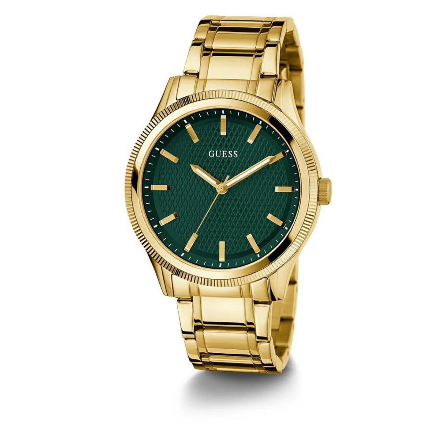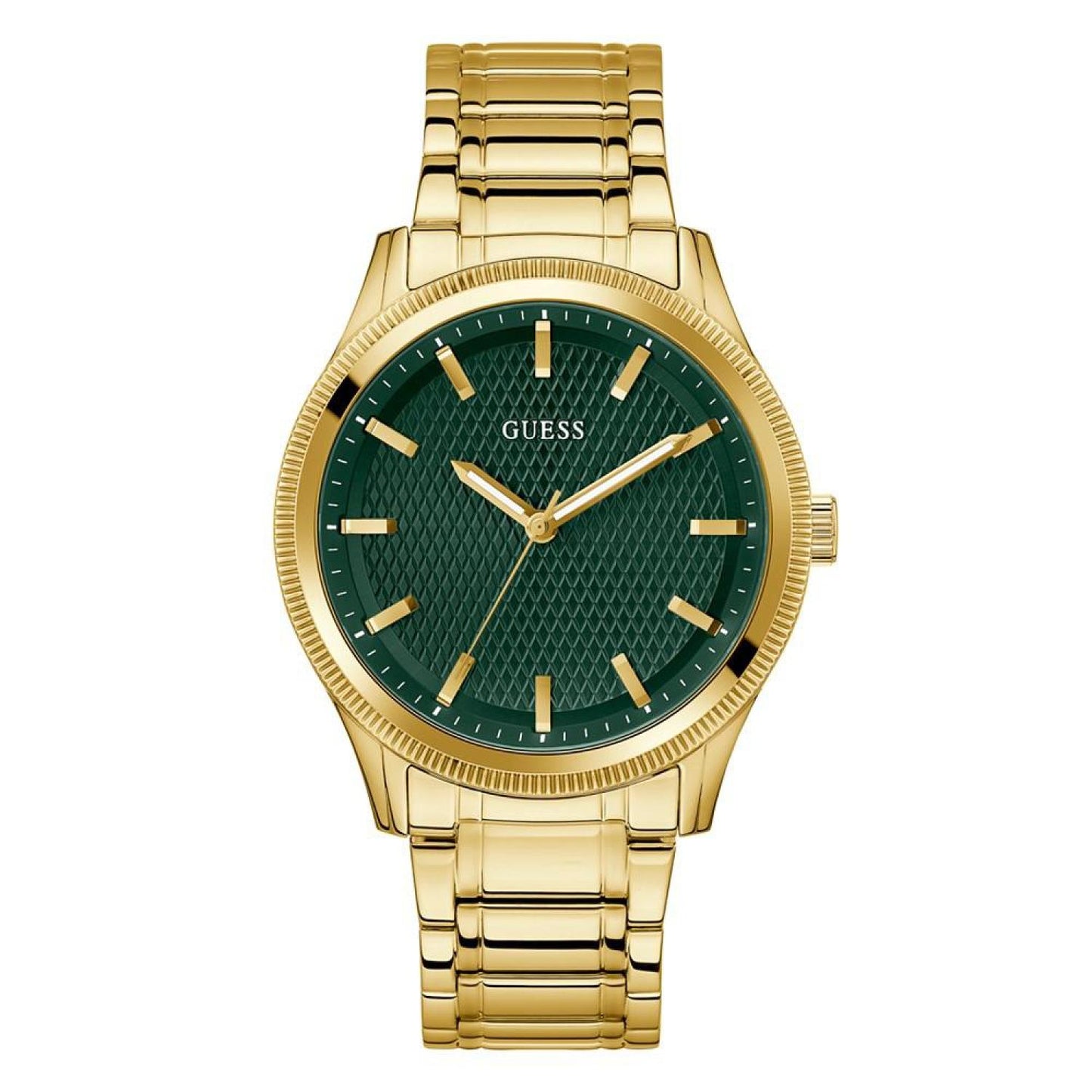 An easy go-to for any guy's wardrobe is this sophisticated dress watch featuring a refined textured pattern on the bezel as well as on its dial. Style #GW0626G2. Movement - analog quartz Case - round gold-tone stainless steel 44mm Strap - gold-tone stainless steel with pilot buckle closure Dial - green Water resistant to 30 meters Watch comes in a gift box Imported Sign up for Macy's WorryNoMore® Jewelry & Watch Protection program within 30 days of purchase. Before delivery, call Customer Service 1-800-289-6229 to sign up. After delivery, visit a Macy's store with your dated receipt and jewelry purchase to sign up.