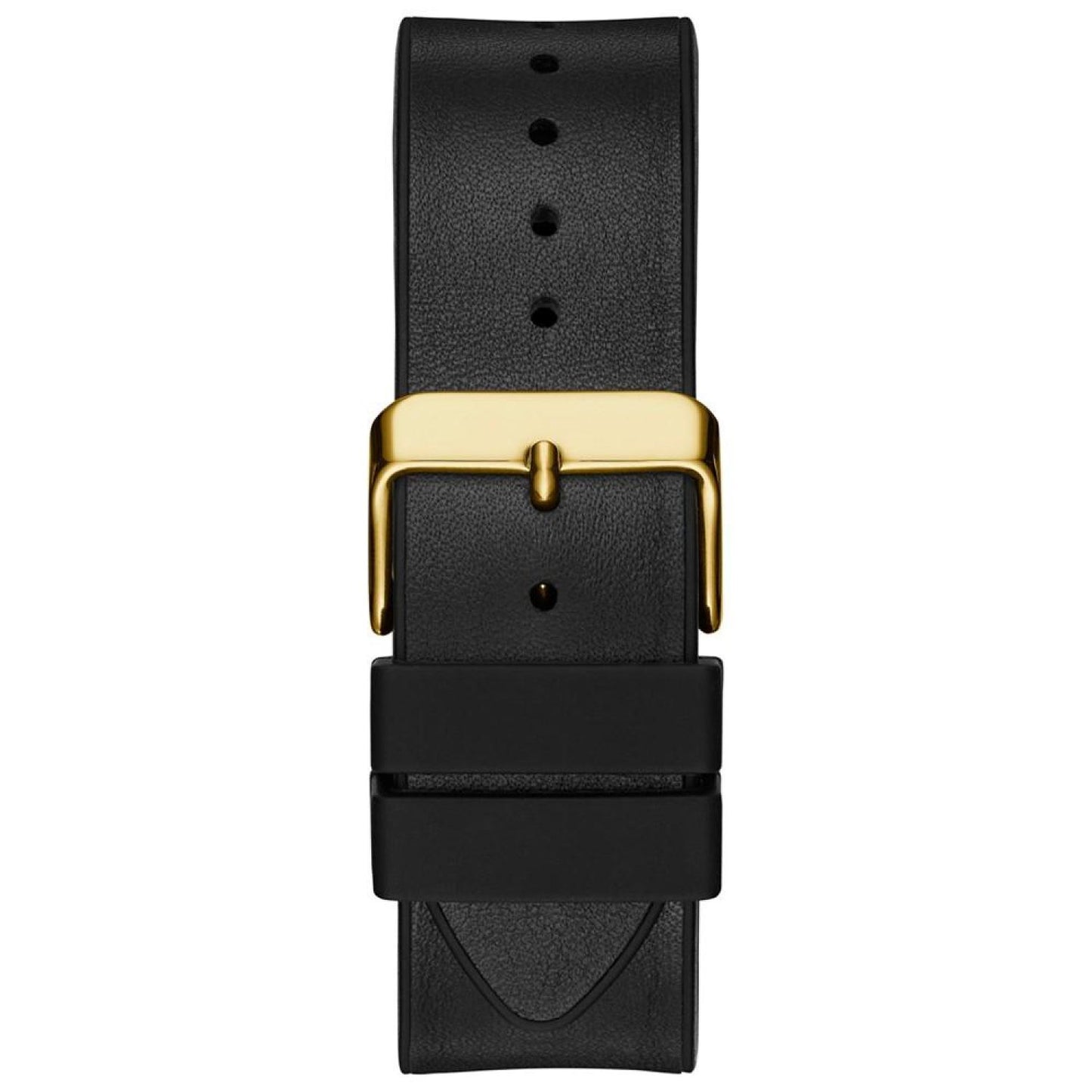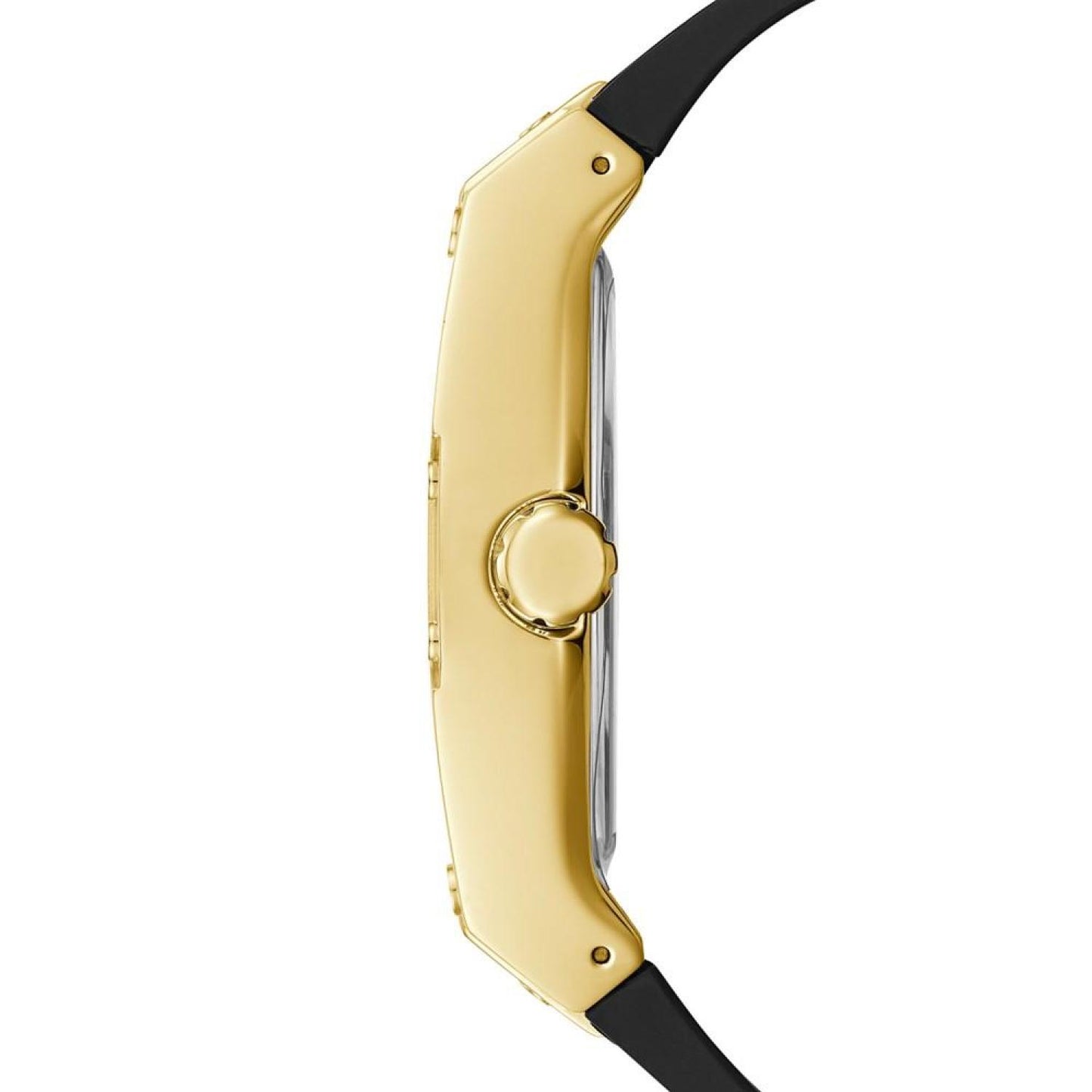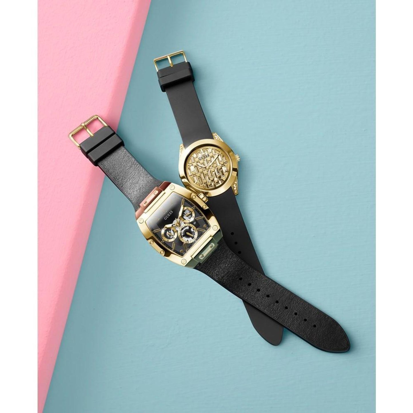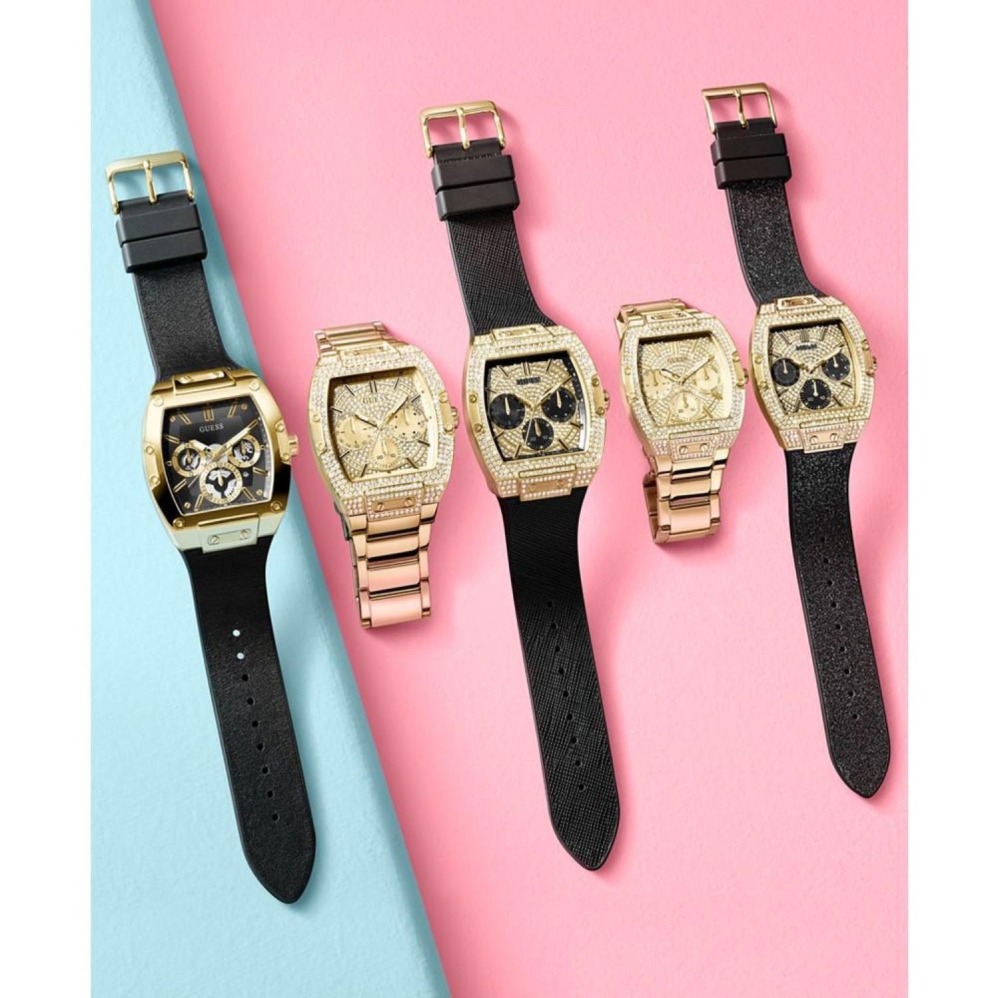 • A handsomely structured gold-tone tonneau case features hardware details and crystal-accented multifunction subdials for this debonair timepiece by GUESS.