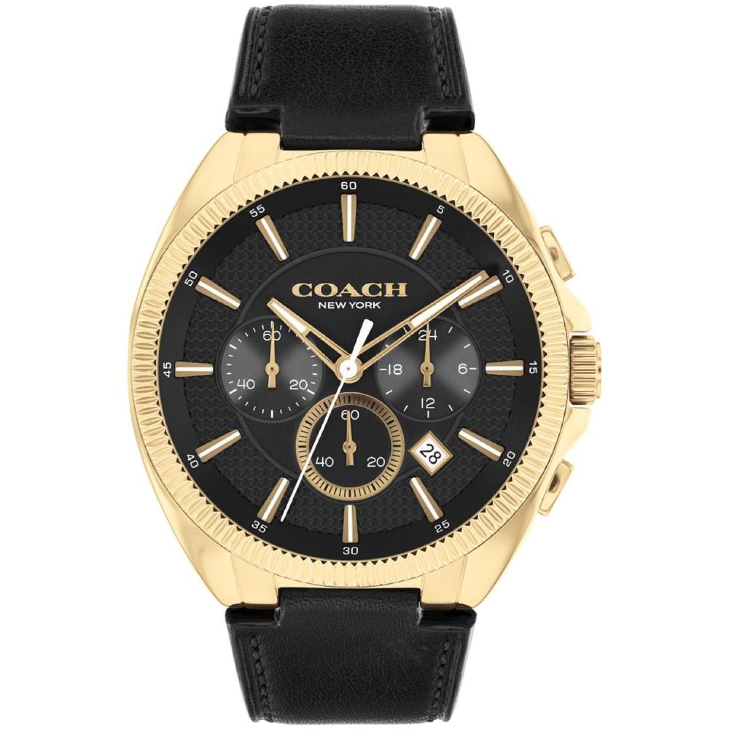 • Combining discerning style with rugged functionality, Jackson is made for life on the move. Finished with a black leather strap, this gold-tone chronograph features a black dial with a date window and three subdials, marking seconds, minutes and hours. SKU# 14602684.
