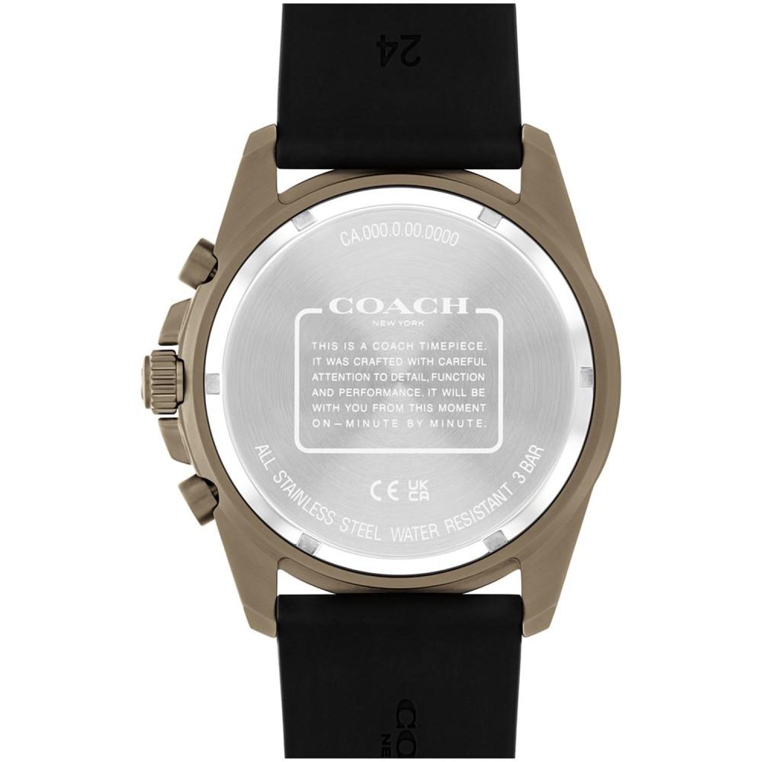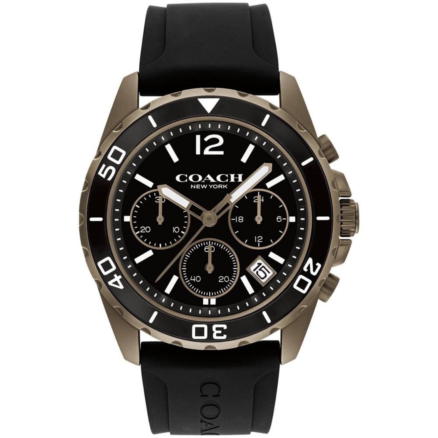 Named for the scenic street in Brooklyn's ultra-hip Williamsburg neighborhood, the Kent watch is made for life-on-the-go. This khaki ionic plated chronograph features a black sunray dial with a date window and three subdials, marking seconds, minutes and hours. It's finished with a black silicone rubber strap debossed with the COACH name. Style #14602643. Movement- three hand chronograph Case- round, khaki stainless steel, 44mm Black silicone strap with tongue buckle closure Dial- black Water resistant up to 30 meters Watch comes in a box Spot Clean Imported Sign up for Macy's WorryNoMore® Jewelry & Watch Protection program within 30 days of purchase. Before delivery, call Customer Service 1-800-289-6229 to sign up. After delivery, visit a Macy's store with your dated receipt and jewelry purchase to sign up.