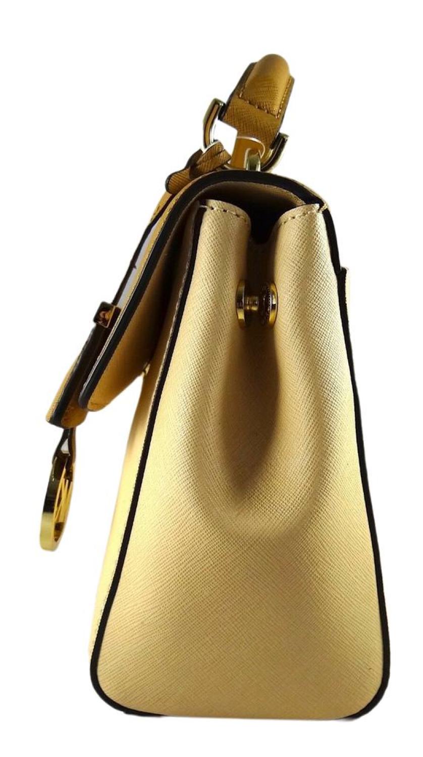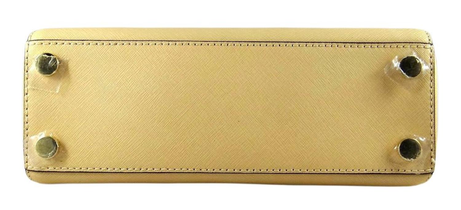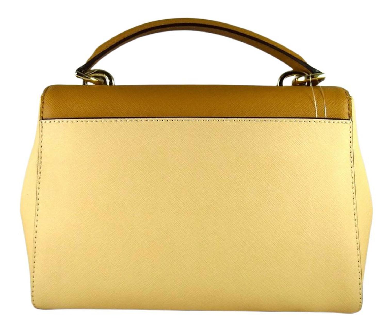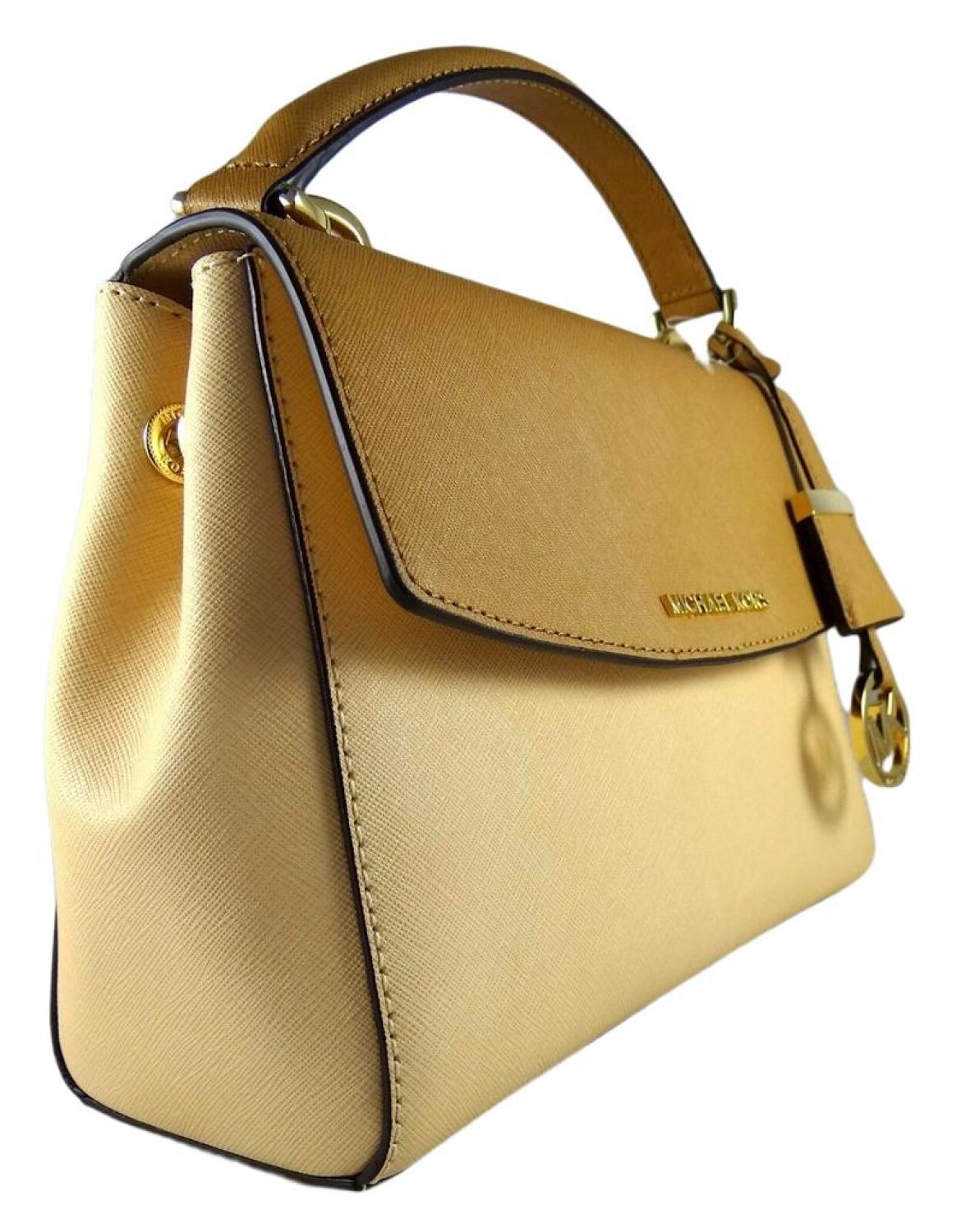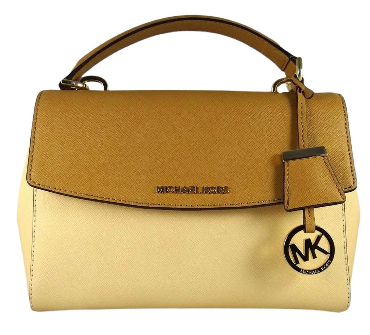 Made of leather with top handle; Flap with Magnetic inside closure; Back open pocket with snap closure; 1 inside zip pocket. 1 inside open pocket; MK logo; leather handles of 4 Inches drop; Adjustable and detachable leather shoulder strap of 18-22 Inches drop. Gold hardware. Measurements - Length - 9.75 x Height - 7.5 x Width - 4 Inches. Comes with original tags.