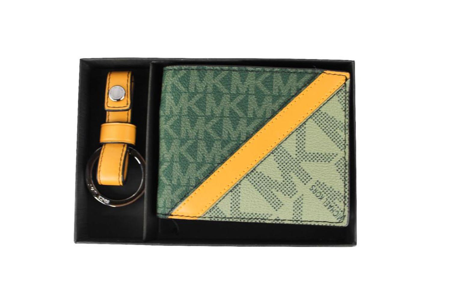Style - Michael Kors Gifting Slim Bifold with Key Fob Box Set (Green/Marigold)Material - Signature PVC and Smooth LeatherFeatures - 6 Card Slots, 2 Note Compartments, Vertical Bill Slot, Snap Closure Key FobMeasures - 11.43cm L x 9.20cm H