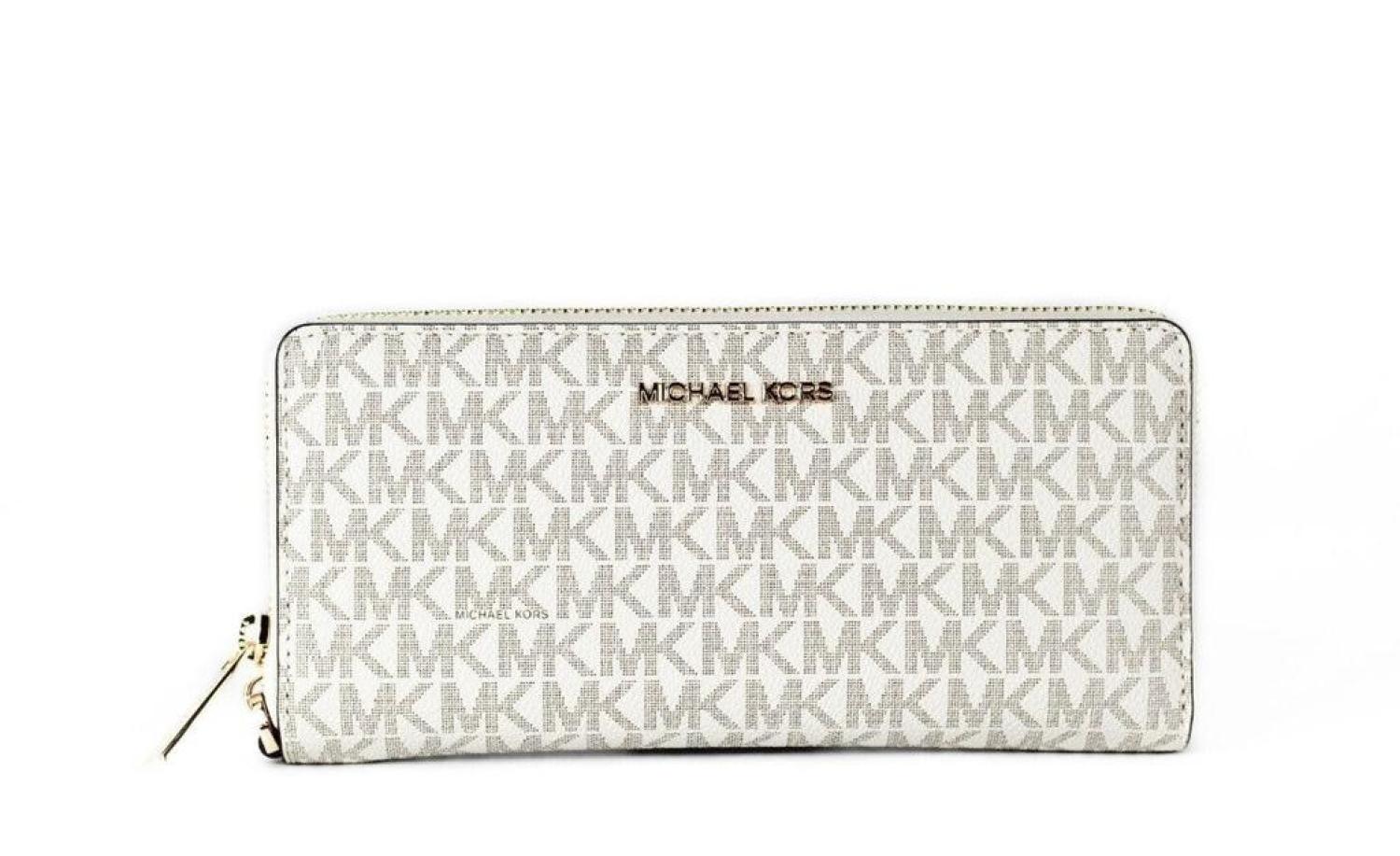 Style - Michael Kors Jet Set Travel Large Continental Clutch Wristlet Wallet (Vanilla Signature) Material - Signature PVC with Smooth Leather LiningFeatures - Michael Kors Front Logo Plate, 5.5″ Detachable Wristlet Strap, 16 Card Slots, 1 ID Window, 1 Zip Coin Compartment, 5 Full Length Bill SlotsMeasures - 21.59 cm L x 10.79 cm H x 2.54 cm W