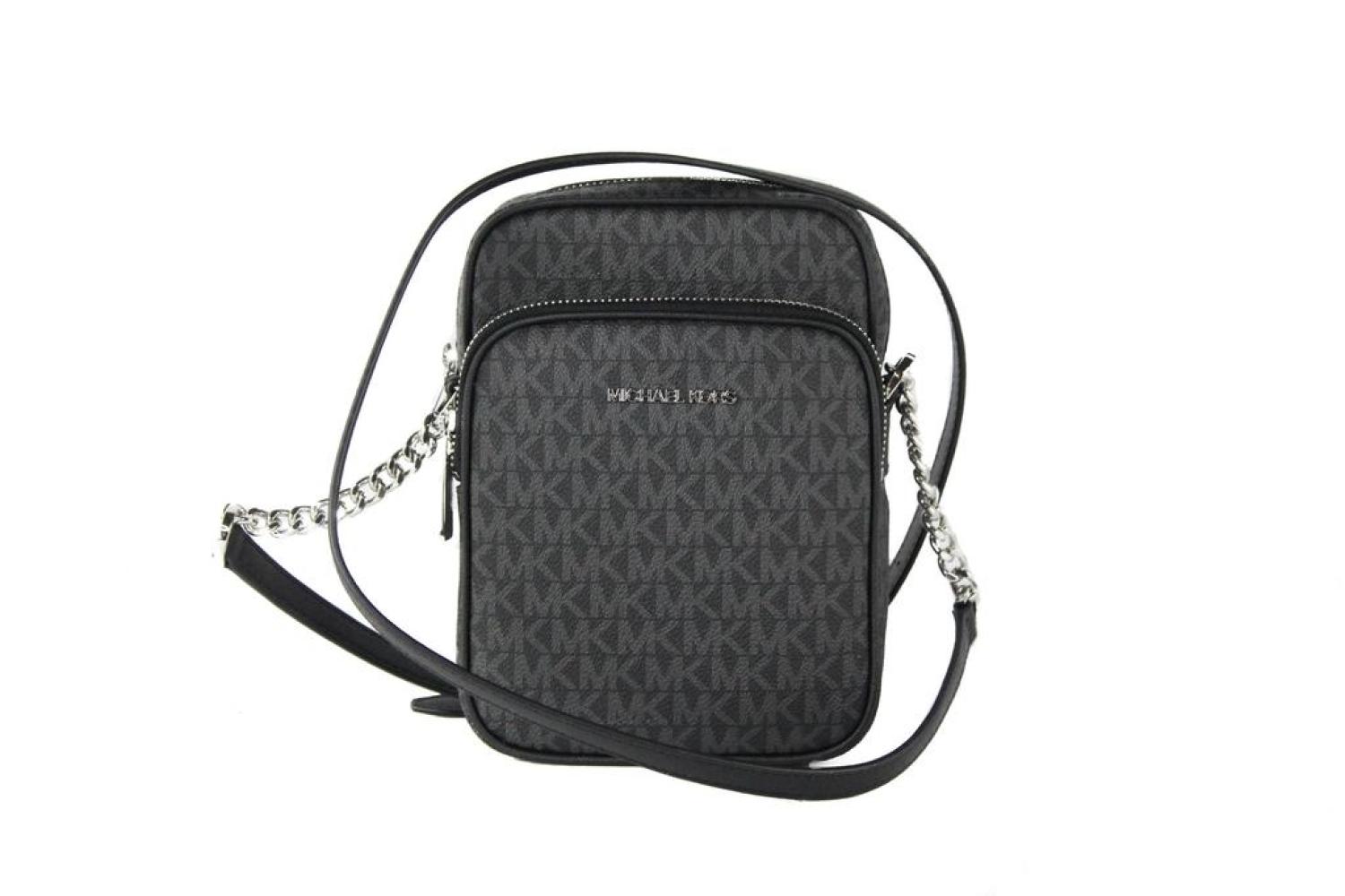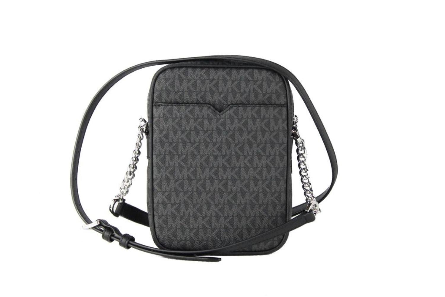 Style - Michael Kors Jet Set Travel Medium North South Chain Crossbody Bag (Black Signature)Material - Signature PVC with Crossgrain Leather TrimFeatures - Adjustable Chain Accented Crossbody Strap, Inner Slip Pocket, 3 Inner Card Slots, Outer Slip PocketMeasures - 15.24 cm W x 20.95 cm H x 7.62 cm D