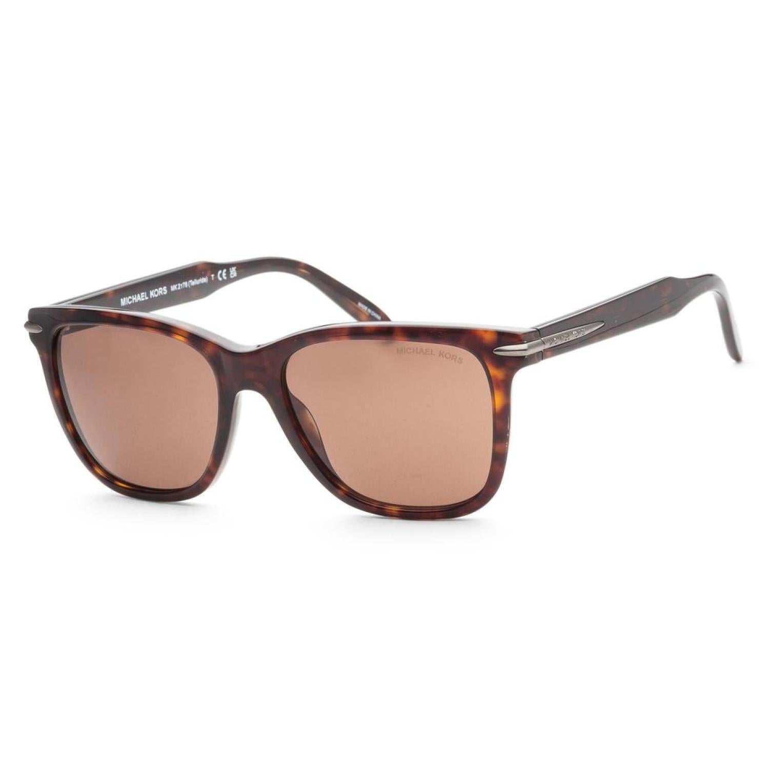 The Michael Kors men's Sunglasses measure at 54 mm lens width, 17 mm bridge width, and 145 mm arm length. The frame is square-shaped dark tortoise acetate. The lenses are non-polarized dark brown solid. Made in China (MK2178-300673)