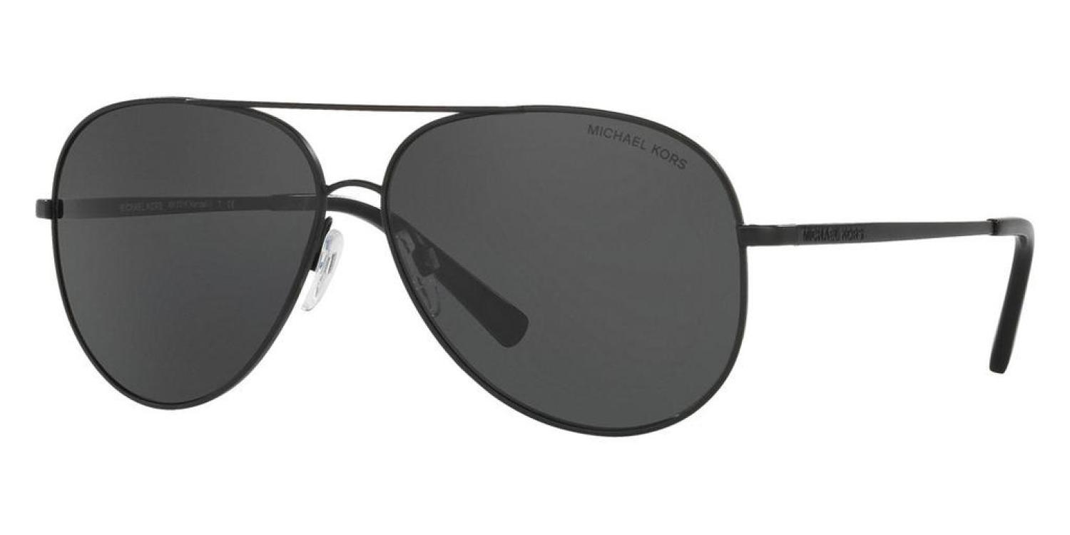 • The Michael Kors men's sunglasses measure at a 60 mm lens width, 135 mm bridge width, and 135 mm arm length. The frame is square-shaped matte black acetate. The lenses are non-polarized grey solid. Made in China. (MK5016-108287-60)