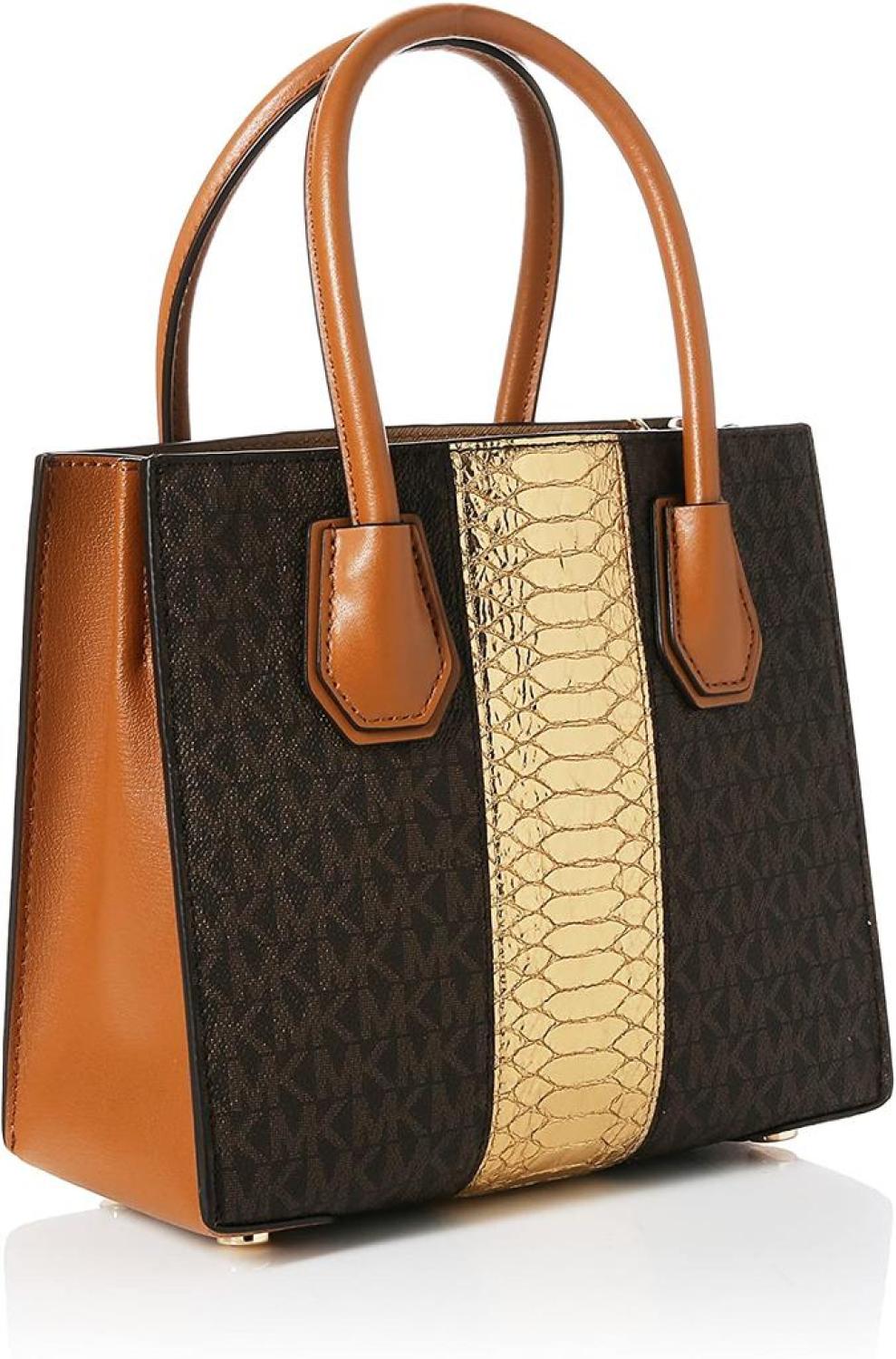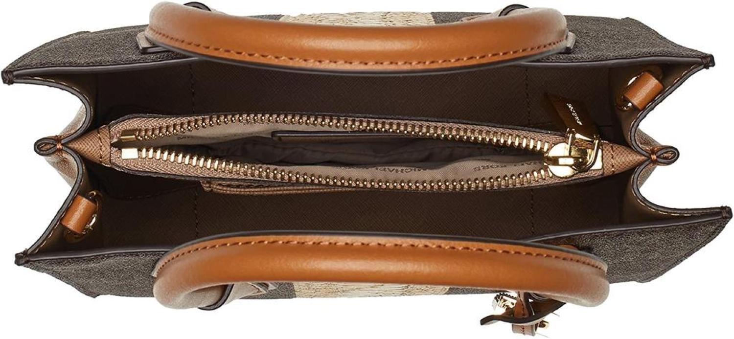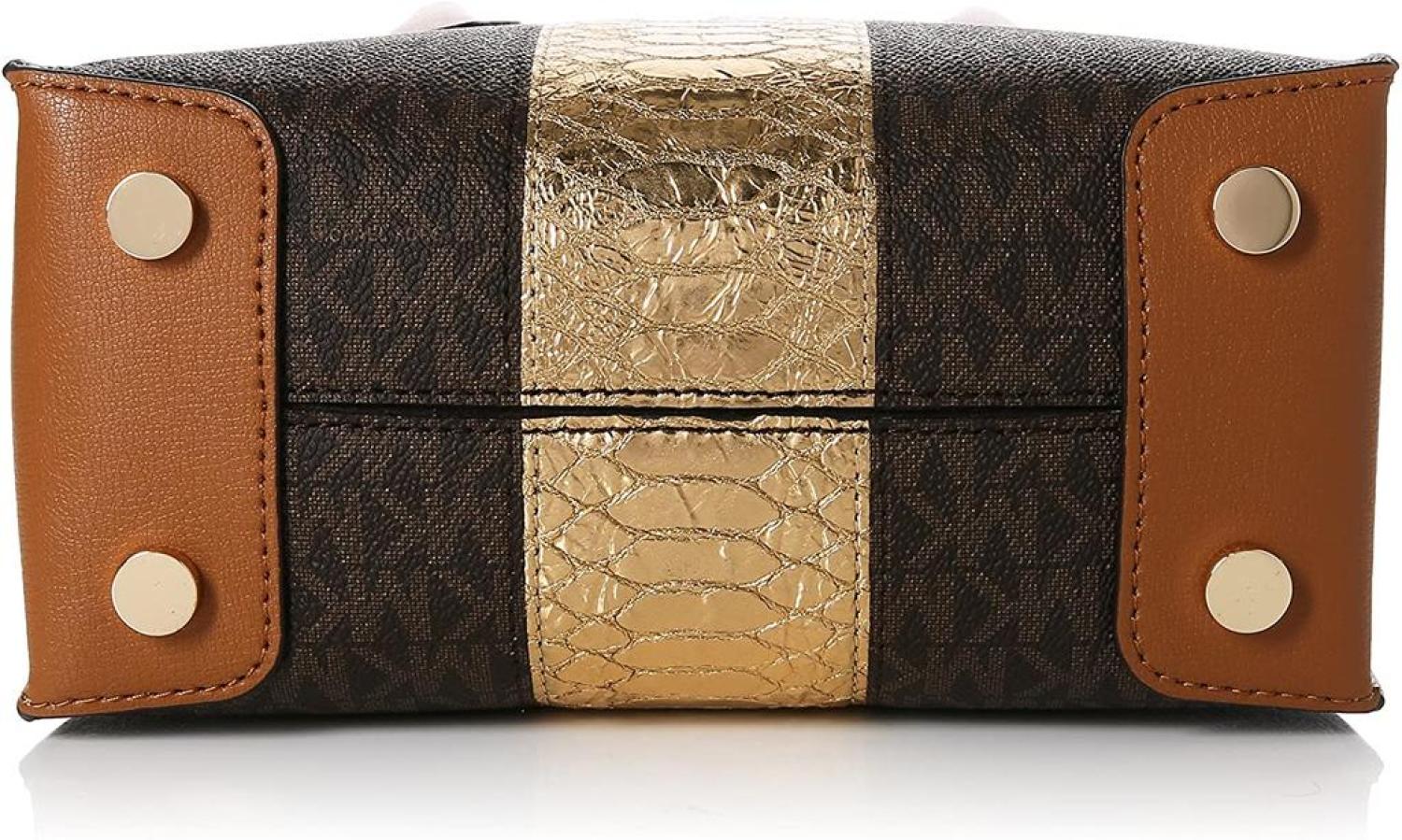 Made of fine PVC with gold embossed leather center stripe; Open top closure with letter detail on front; Middle zip compartment divides 2 large compartment 3 credit card slots; Charm lock detail; Adjustable, detachable Leather shoulder strap with 22-25 Inches drop Double Rolled leather handles with 6.5 Inches drop; Bottom feet for protection; Gold hardware Measurements - Length - 8.5 x Height - 8 x Width - 3 Inches Comes with original tags