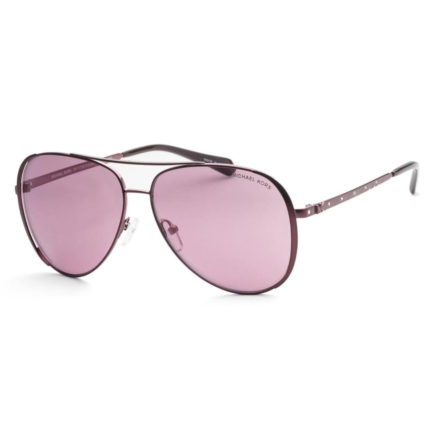 The Michael Kors women's Sunglasses measure at 60 mm lens width, 16 mm bridge width, and 140 mm arm length. The frame is butterfly-shaped cordovan metal. The lenses are non-polarized black magenta gradient mirror. Made in China (MK1101B-1015AK)