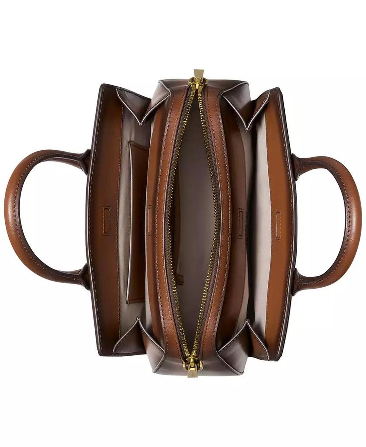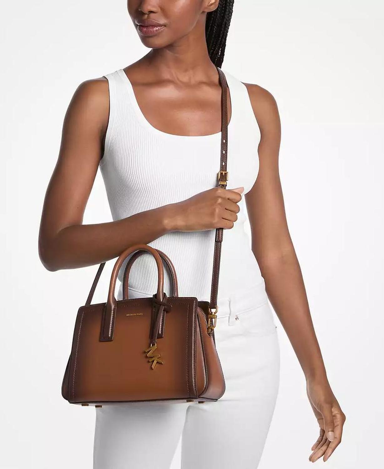 Equipped with multiple compartments, this Michael Kors Laila small satchel keeps essentials organized throughout busy days. A secure center zip and slip pocket allow easy access, while adjustable strap length and top handles provide versatile carrying options. Small-sized bag; 10"W x 7-1/4"H x 4-3/4"D; 1.70 lb. approx. weight 8.90"L top handles; 22-1/2"-24"L adjustable crossbody strap Magnetic closure Exterior: gold hardware, back slip and zip pocket, center zip compartment Shell & trim: 100% leather; lining: 100% polyester Wipe clean Imported