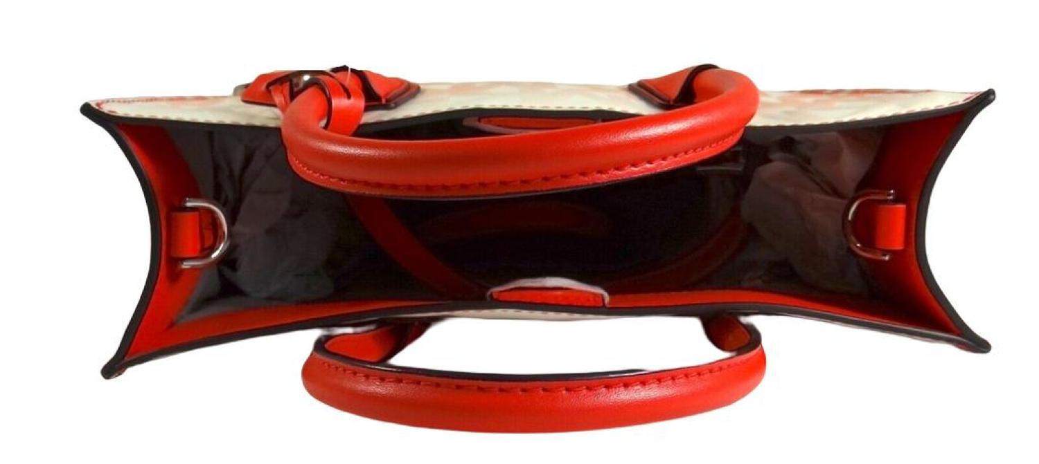 • Made of Vegan material with leather detailed, Open top closure with letter detail on front, Middler zip compartment divided into two large compartments, Three credit card slots, MK Charm detail. Adjustable, detachable leather shoulder strap with 22 Inch to 25 Inch drop, Double rolled leather handles with 6.5 Inch drop. SV hardware. Measurements - Length - 11 x Height - 12 x Width - 3.75 Inches. Comes with original tags.