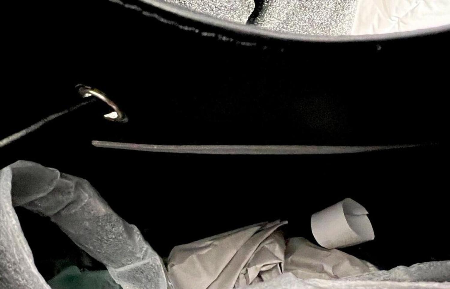 Made of PVC and Leather, Drawstring with magnetic closure, Leather lining, Leather shoulder strap with 4 Inch drop. Removable and adjustable single canvas shoulder or crossbody strap with 20 to 22 Inch drop. Gold or SV hardware, Approximately weight - 2 lbs 08. Model - Large Suri. Comes with original tags.