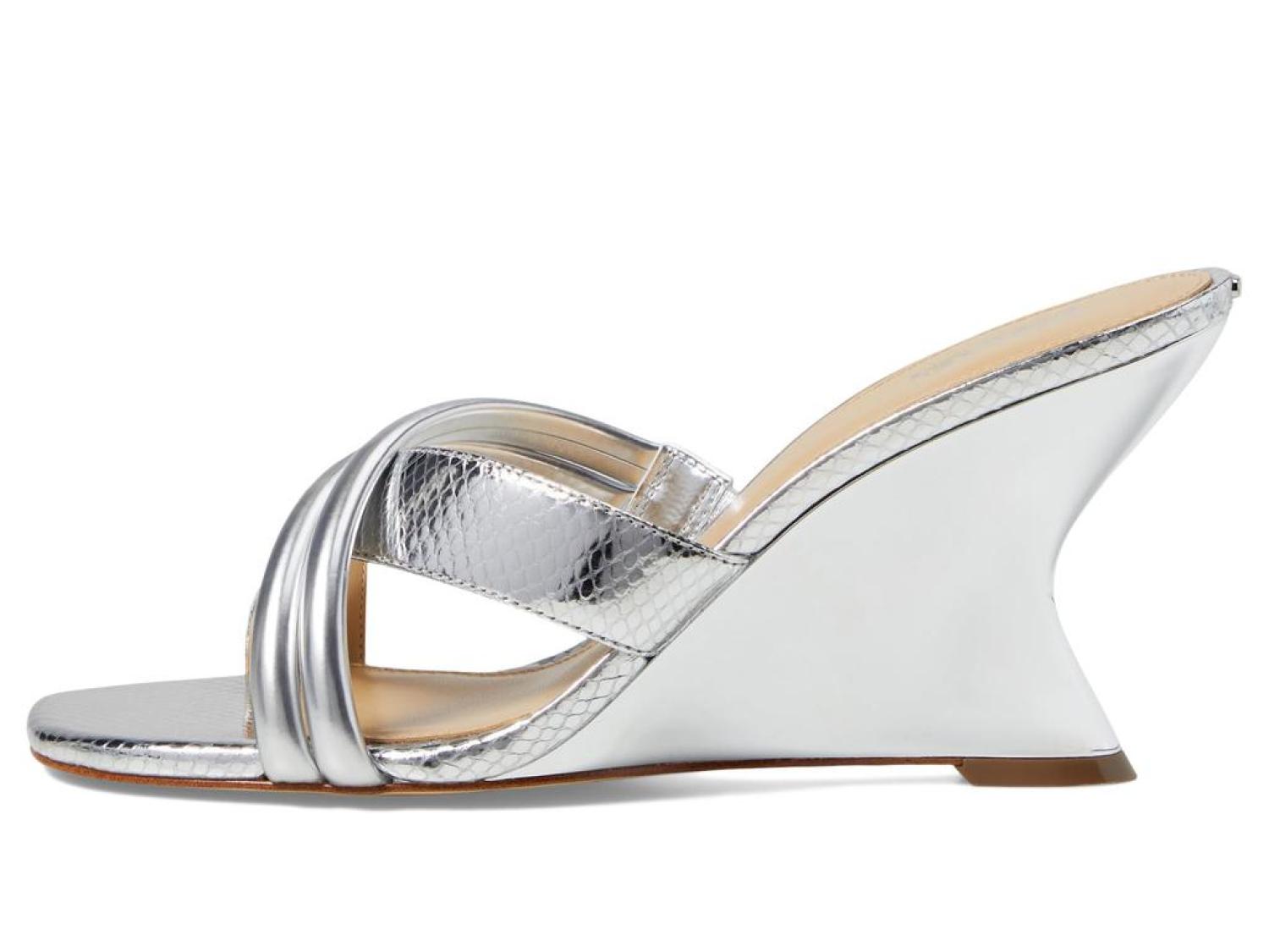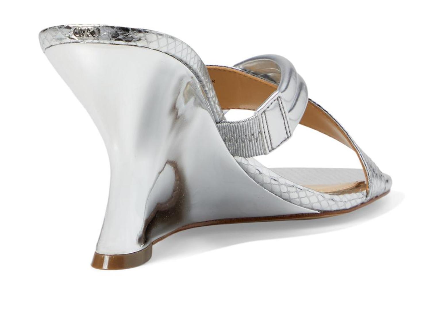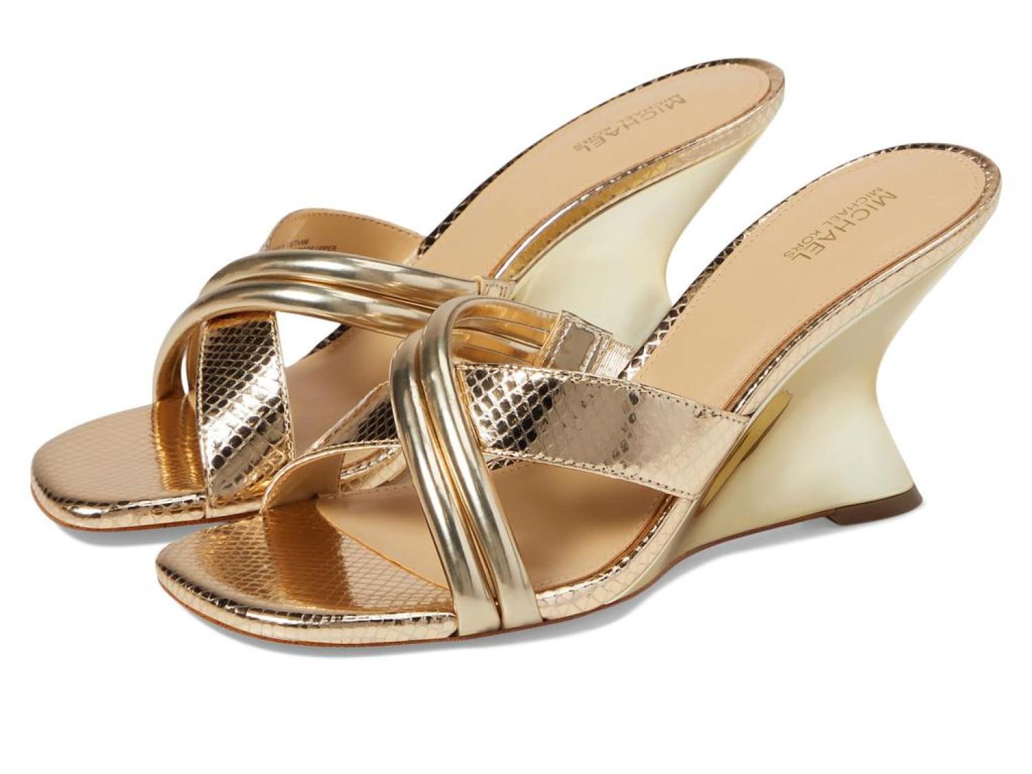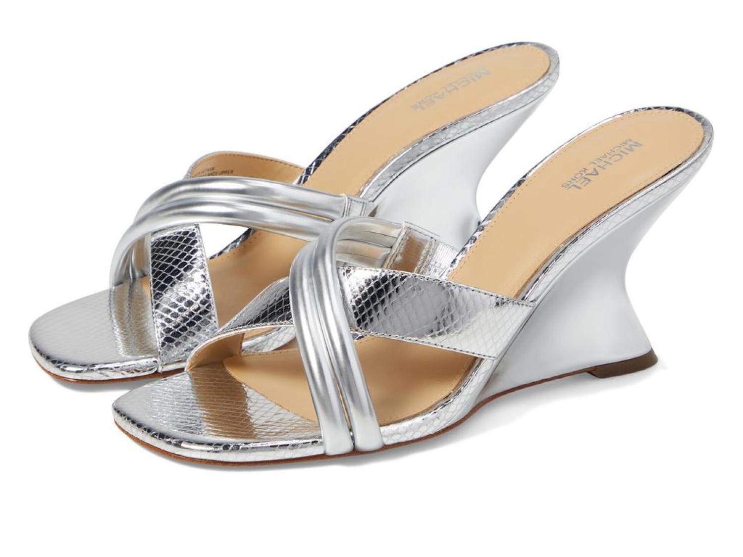 • Add a stunning touch to your look by wearing the MICHAEL Michael Kors® Nadina Mule Wedge. The slip-on style heels have an open-round toe and sculptured galvanized wedge with a bombe strap crossing over an embossed snake strap. The cushioned heels have a leather upper, faux leather lining, and synthetic insole for added comfort and longevity.
