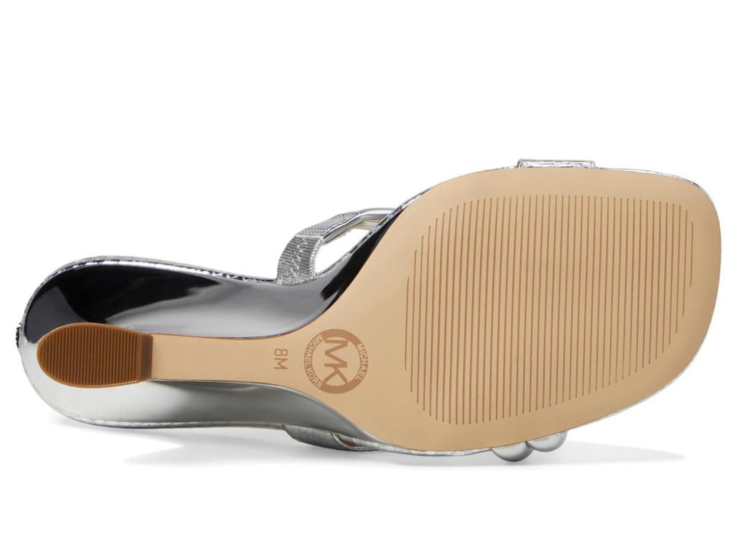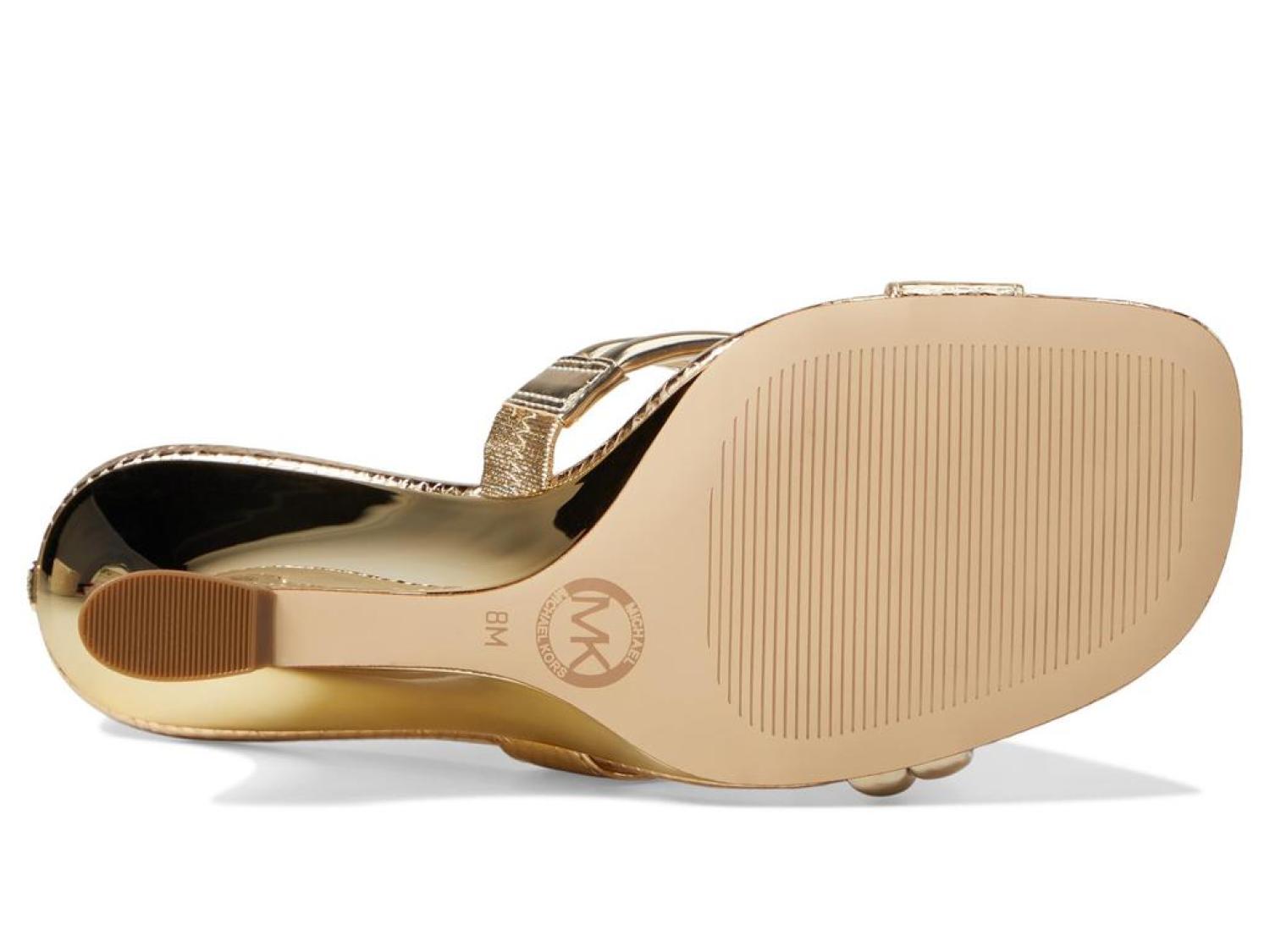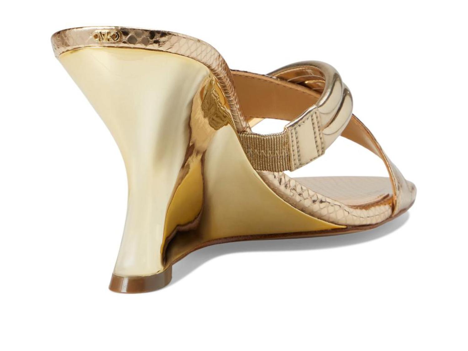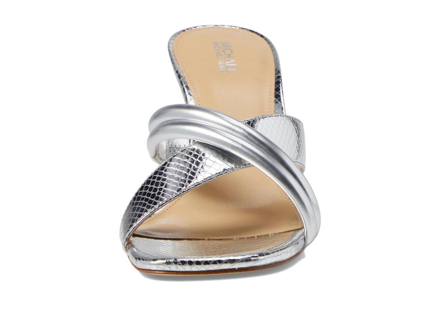 • Add a stunning touch to your look by wearing the MICHAEL Michael Kors® Nadina Mule Wedge. The slip-on style heels have an open-round toe and sculptured galvanized wedge with a bombe strap crossing over an embossed snake strap. The cushioned heels have a leather upper, faux leather lining, and synthetic insole for added comfort and longevity.