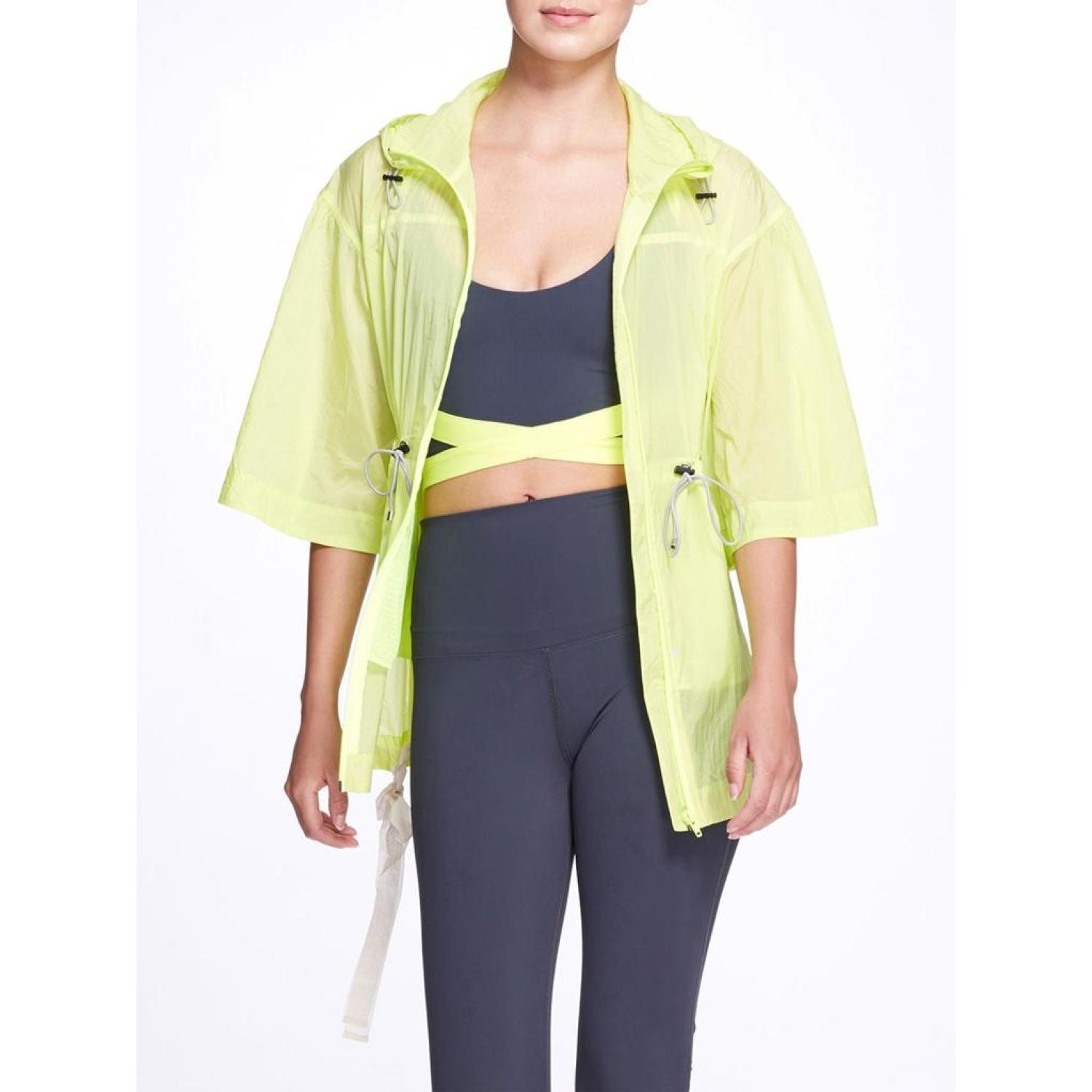 The Naomi Jacket features super lightweight textured performance outer fabric, contrasting drawstring at hood, waist and hem, hood, dropped and shirred wide cropped sleeve, zipper, pockets.