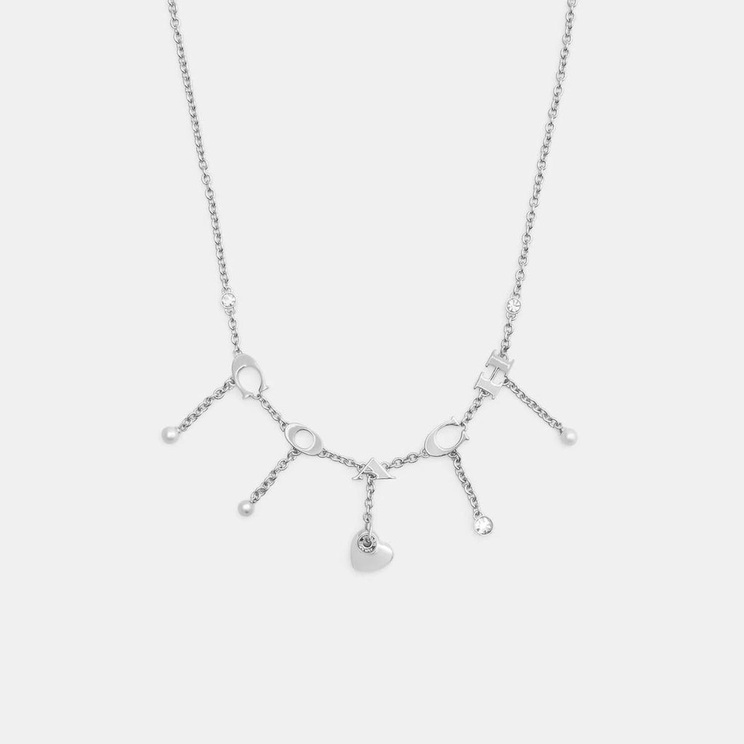 Plated brass glass and cubic zirconia Lobster clasp closure Glass pearl charm - 1/4 (L) Metal orb charm - 1/4 (L) Heart charm - 1/2 (L) x 1/2 (H) Crystal velvet charm - 1/4 (L) Necklace - adjustable 16–18 (L) Style No. CBW12 | Coach Outlet Open Circle Heart Charm Necklace - Grey