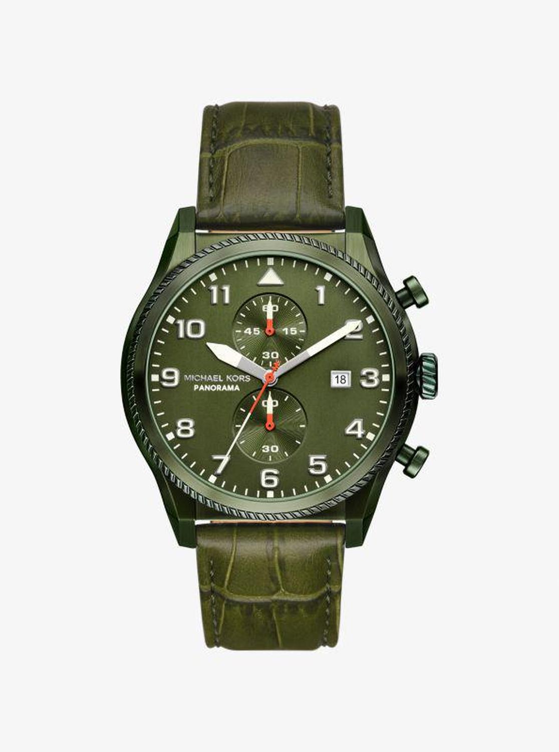 • A refined piece for years to come, our Panorama watch is designed with a crocodile-embossed leather strap and topring that’s punctuated by a matching olive-tone face featuring chronograph dials. Count on it for a sophisticated, sporty look any day of the week.