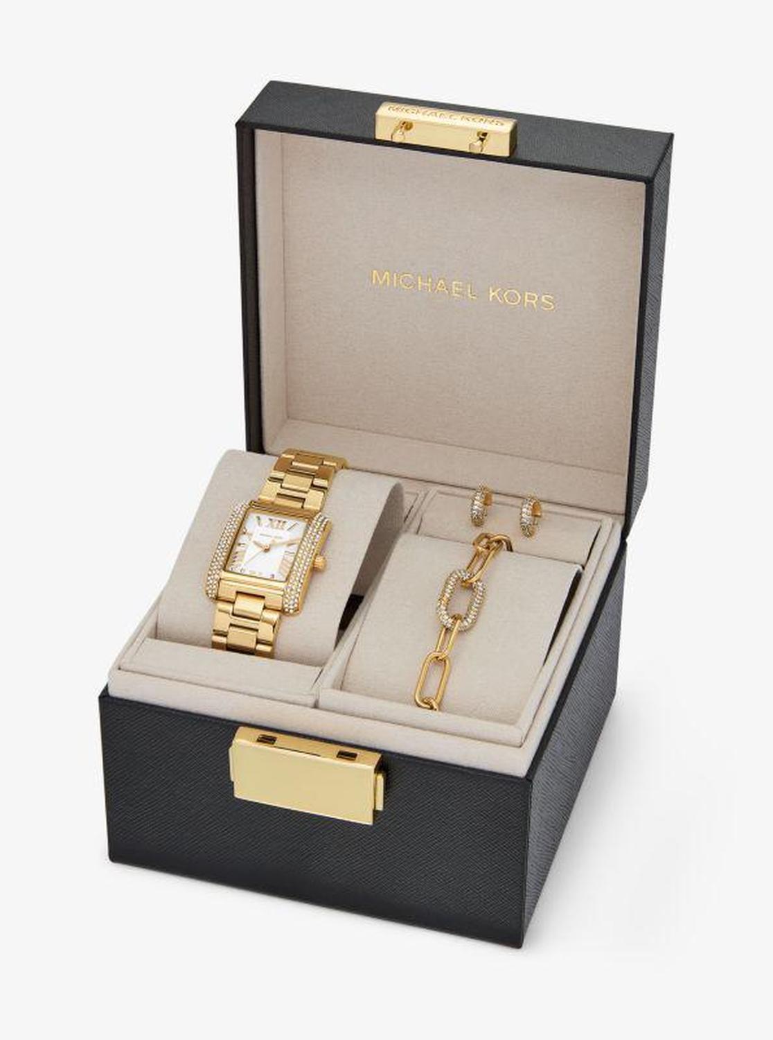 • This pavé-encrusted three-piece set includes our petite Emery watch as the centerpiece alongside a chain-link bracelet and hoop earrings. The gold-tone timepiece features a rectangular face, beveled strap and Roman numeral indexes for a classic finish. Worn together, thesepieces are simply dazzling.