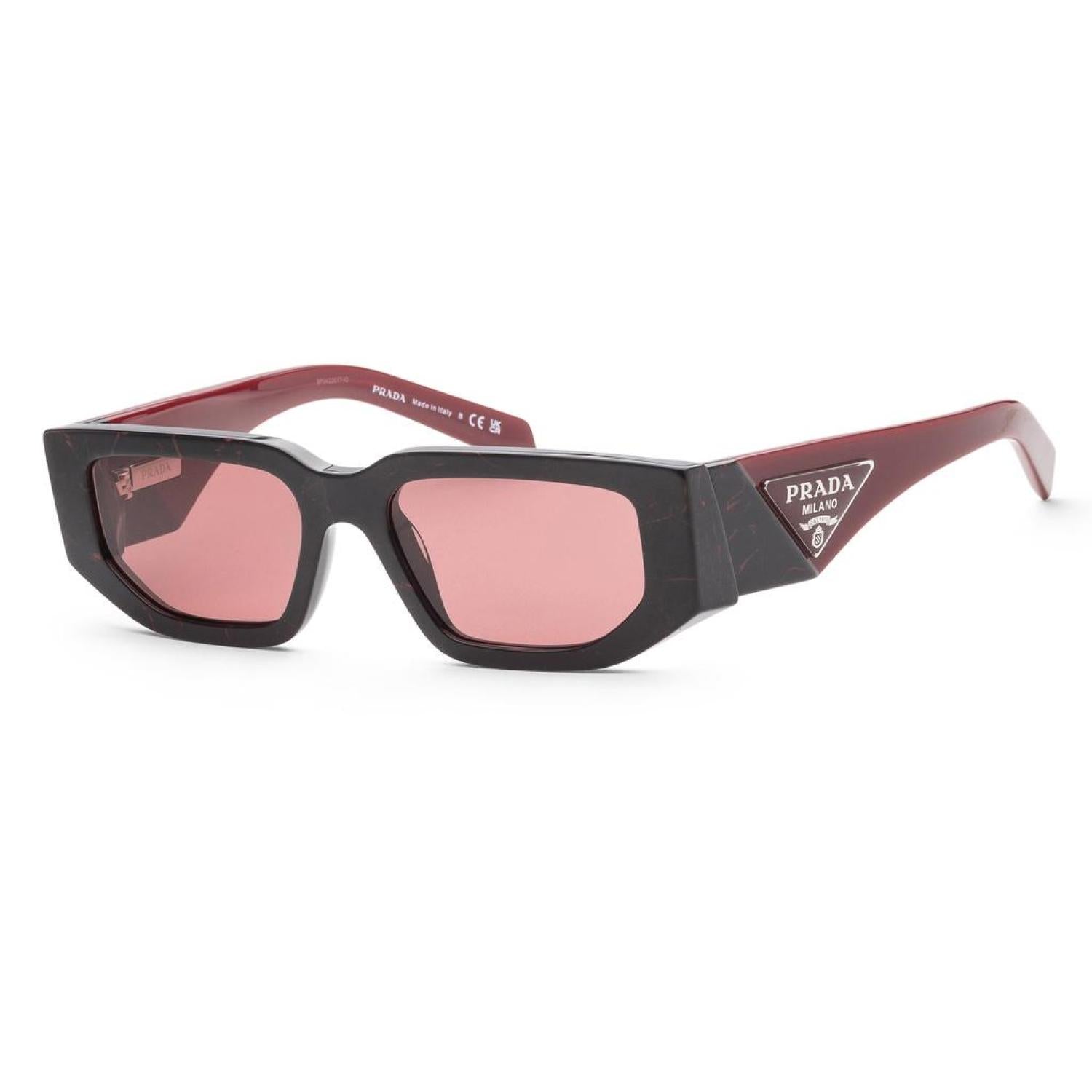Dimensions - 54 mm x 18 mm x 140 mm. The frame is acetate rectangular shape. The lenses are dark violet and the frame is black etruscan marble. (PR-09ZS-11F08S)