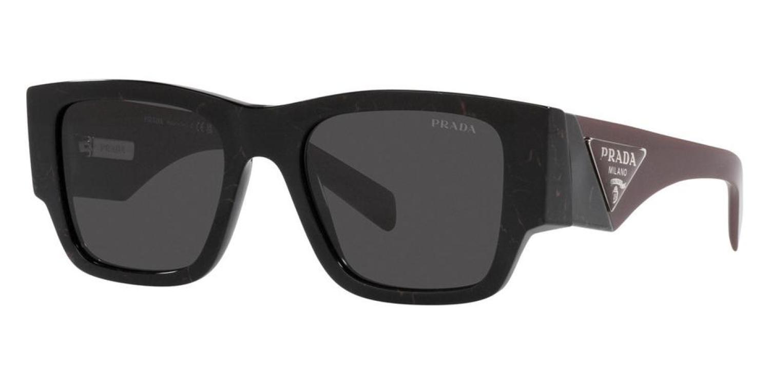 Dimensions - 55 mm x 19 mm x 140 mm. The frame is acetate pillow shape. The lenses are dark grey and the frame is black etruscan marble. (PR-10ZSF-11F5S0)