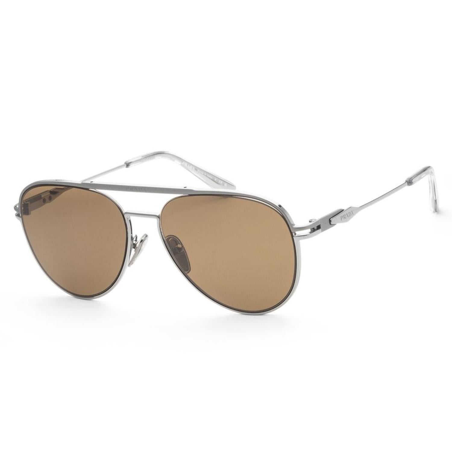 Dimensions - 57 mm x 16 mm x 140 mm. The frame is metal aviator shape. The lenses are dark brown and the frame is gunmetal matte/shiny. (PR-54ZS-16F01T)