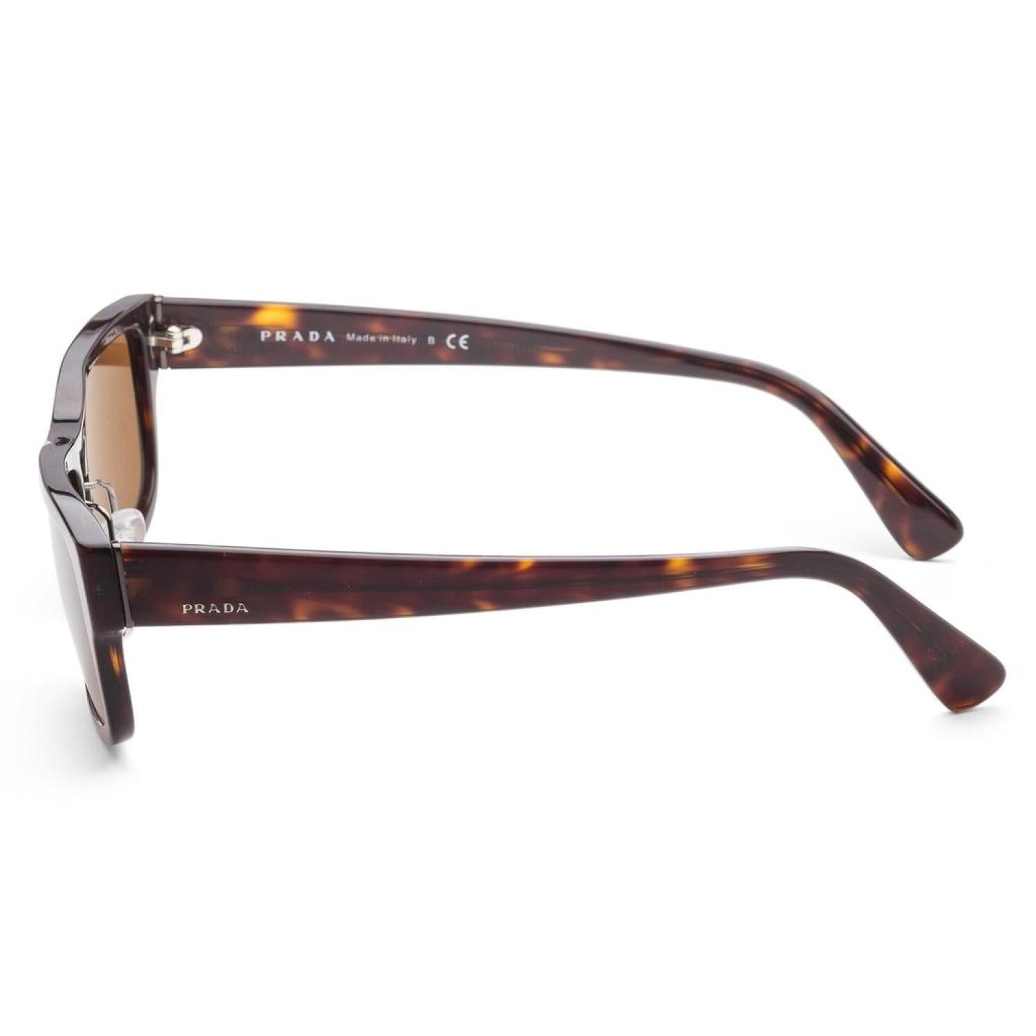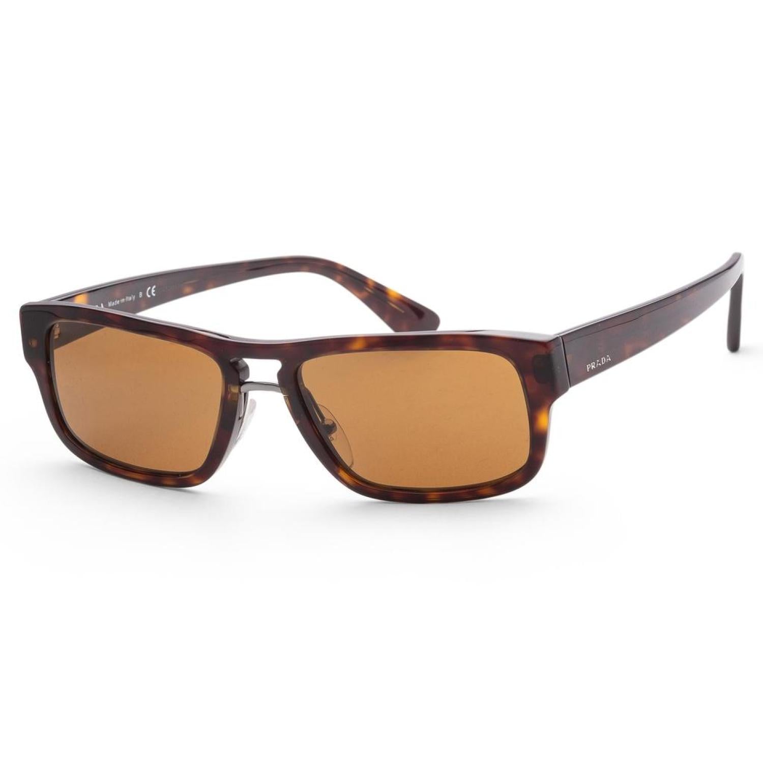The Prada men's sunglasses measure at 56 mm lens width, 18 mm bridge width, 145 mm lens width. The frame is rectangular-shaped havana acetate. Made In Italy (PR-05VS-2AU0B0)